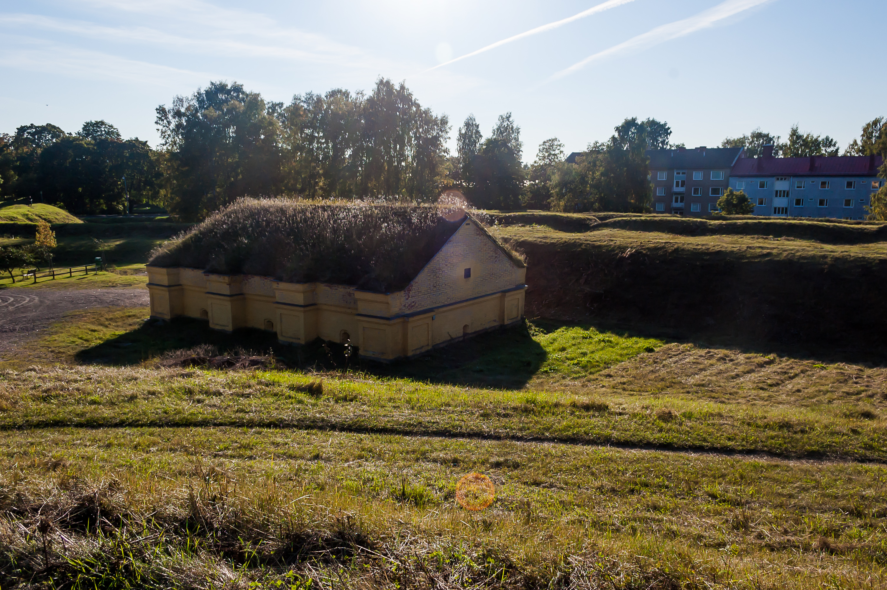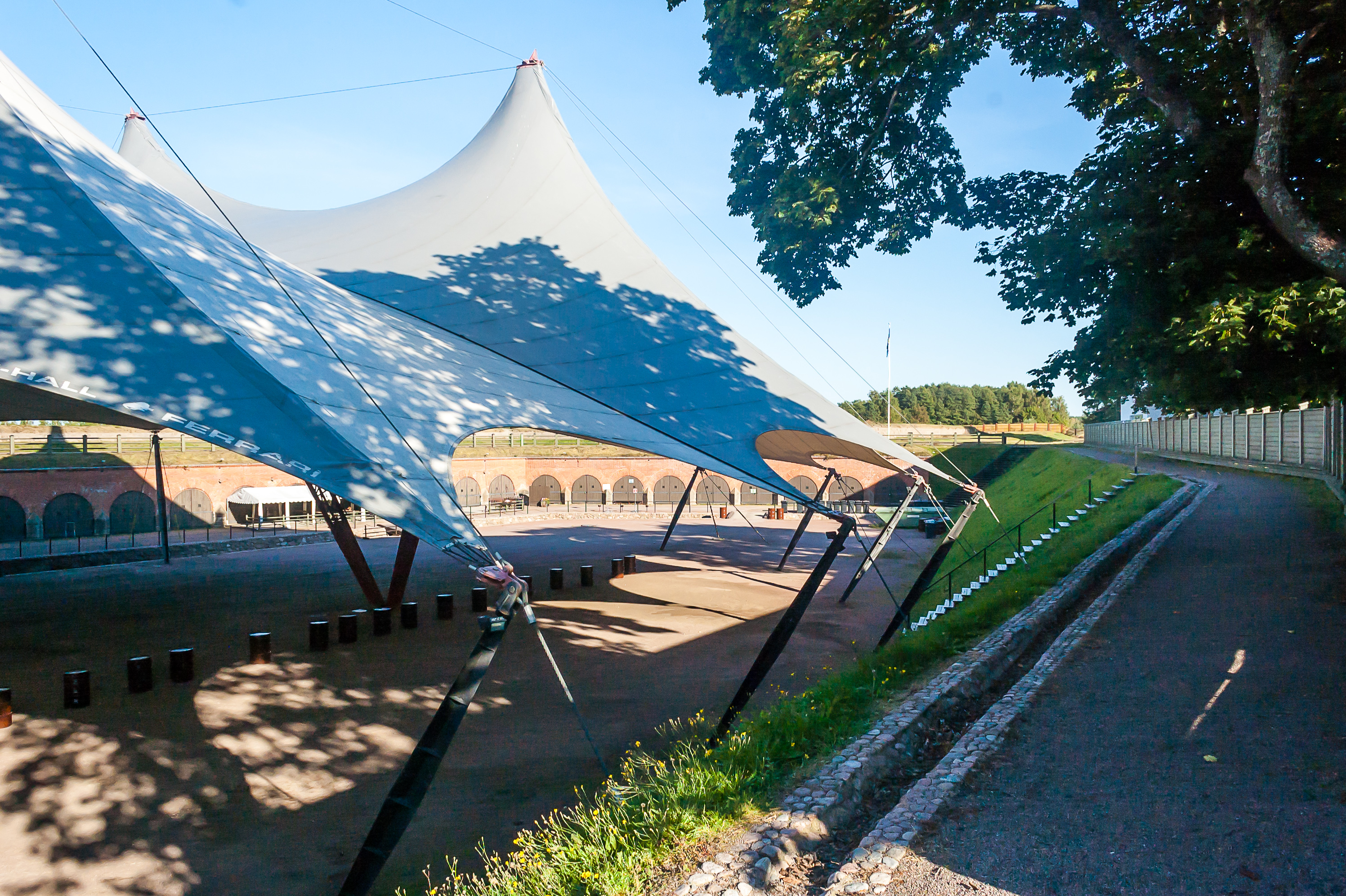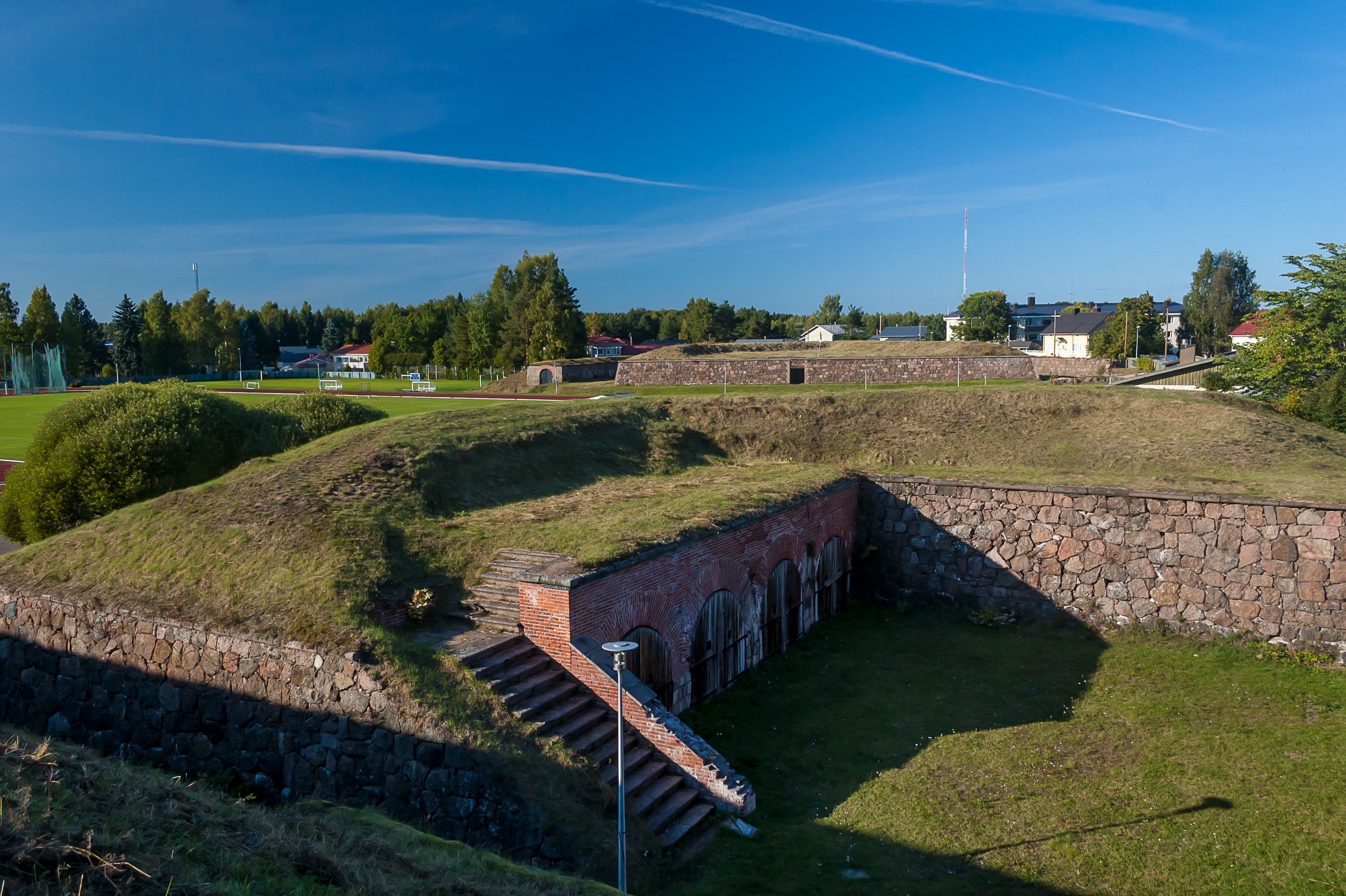8. А сразу за восьмиугольным застроенным районом начинаются старые бастионы Фридрихсгамской крепости — высокие треугольной формы земляные и кирпичные валы. Всего их шесть, названных в честь различных финских городов. Это самый большой бастион, бастион Хамина; он новее других — им заменили более старую часть крепости в 19 веке, чтобы улучшить ее защиту с севера. Бастион Хельсинки к югу от крепости не дожил до наших дней — примерно на его месте располагается рыночная площадь. Но бастион Хамина сохранился хорошо, и с относительно недавних пор был превращен в концертную площадку, накрытую невероятно огромным тентом.