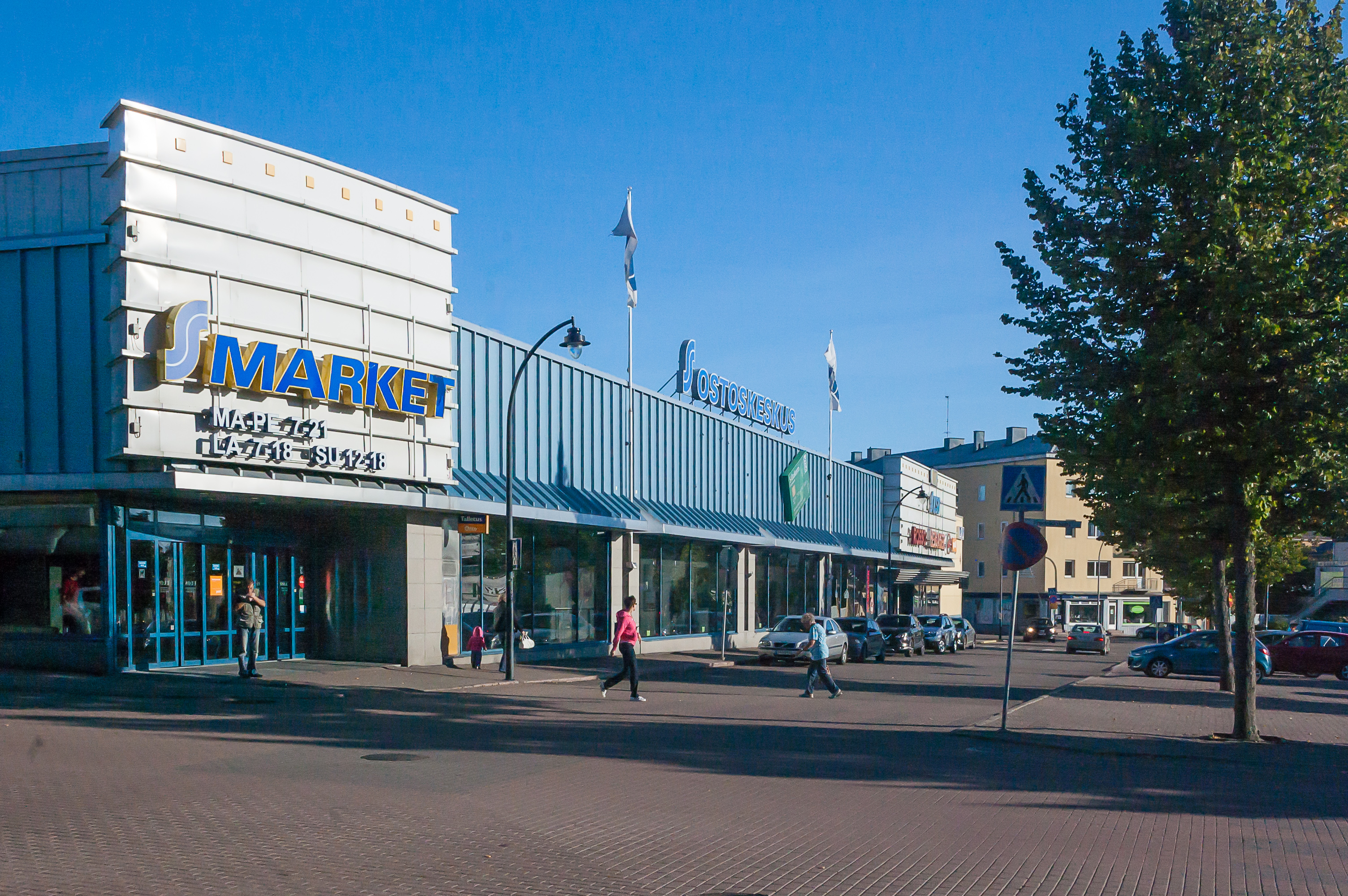 26. Вернулись на рыночную площадь. Супермаркет вездесущей сети «С-Маркет» выглядит немного странно после всех этих деревянных домиков.