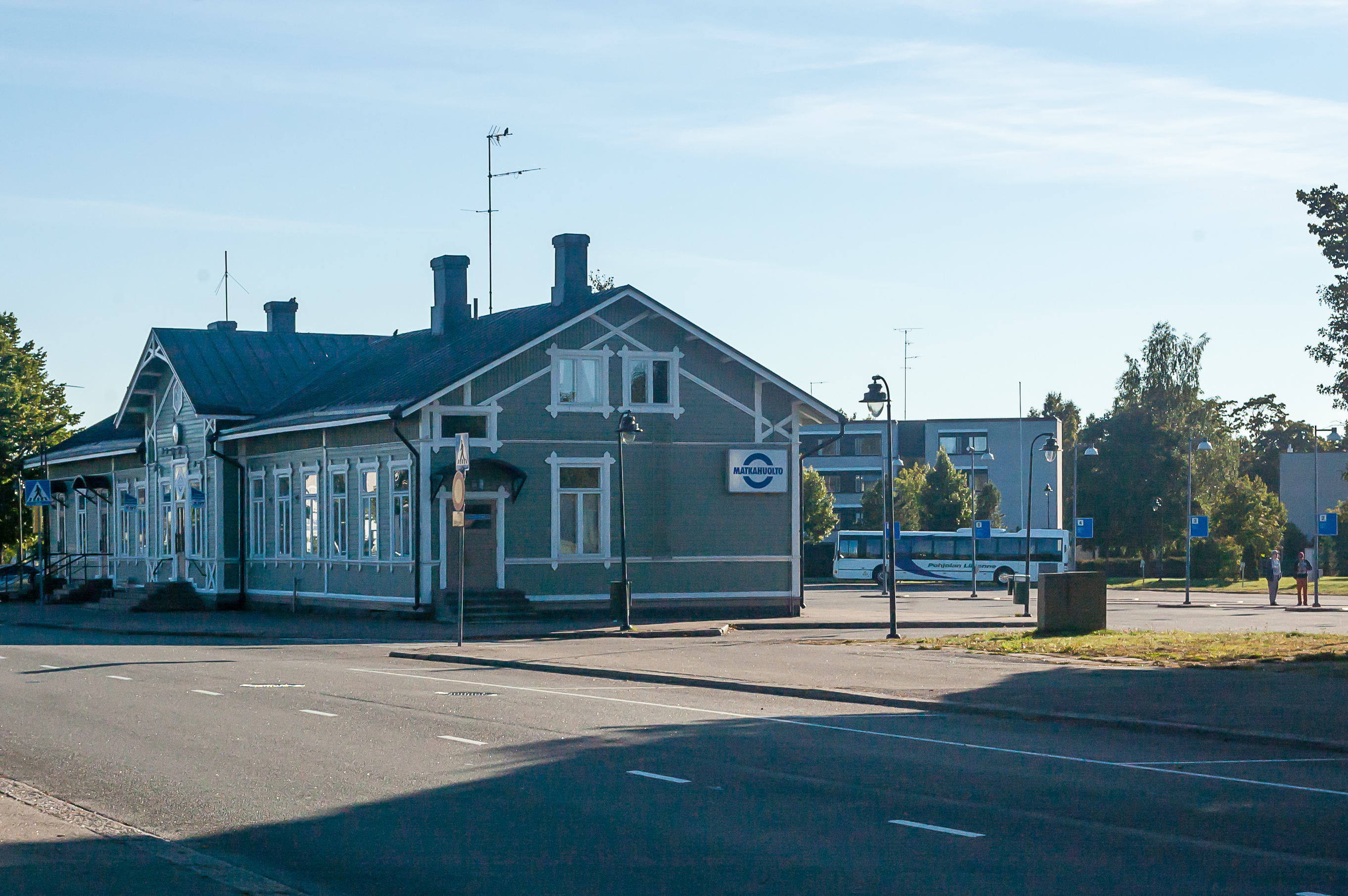 23. Автостанция Хамины. В большом деревянном здании ранее располагалась и железнодорожная станция. Железнодорожная линия Инкеройнен-Хамина, построенная в 1899 году, вела за эту станцию в старый порт Хамины в Тервасаари. Со временем порт переехал из Тервасаари на полуостров к западу от города, и неимоверно разросся, принявшись обрабатывать все мыслимые виды грузов. Старая железная дорога была разобрана и заменена новой линией Юурикорпи-порт Хамины в 1984 году, и пассажирского сообщения с тех пор больше нет.