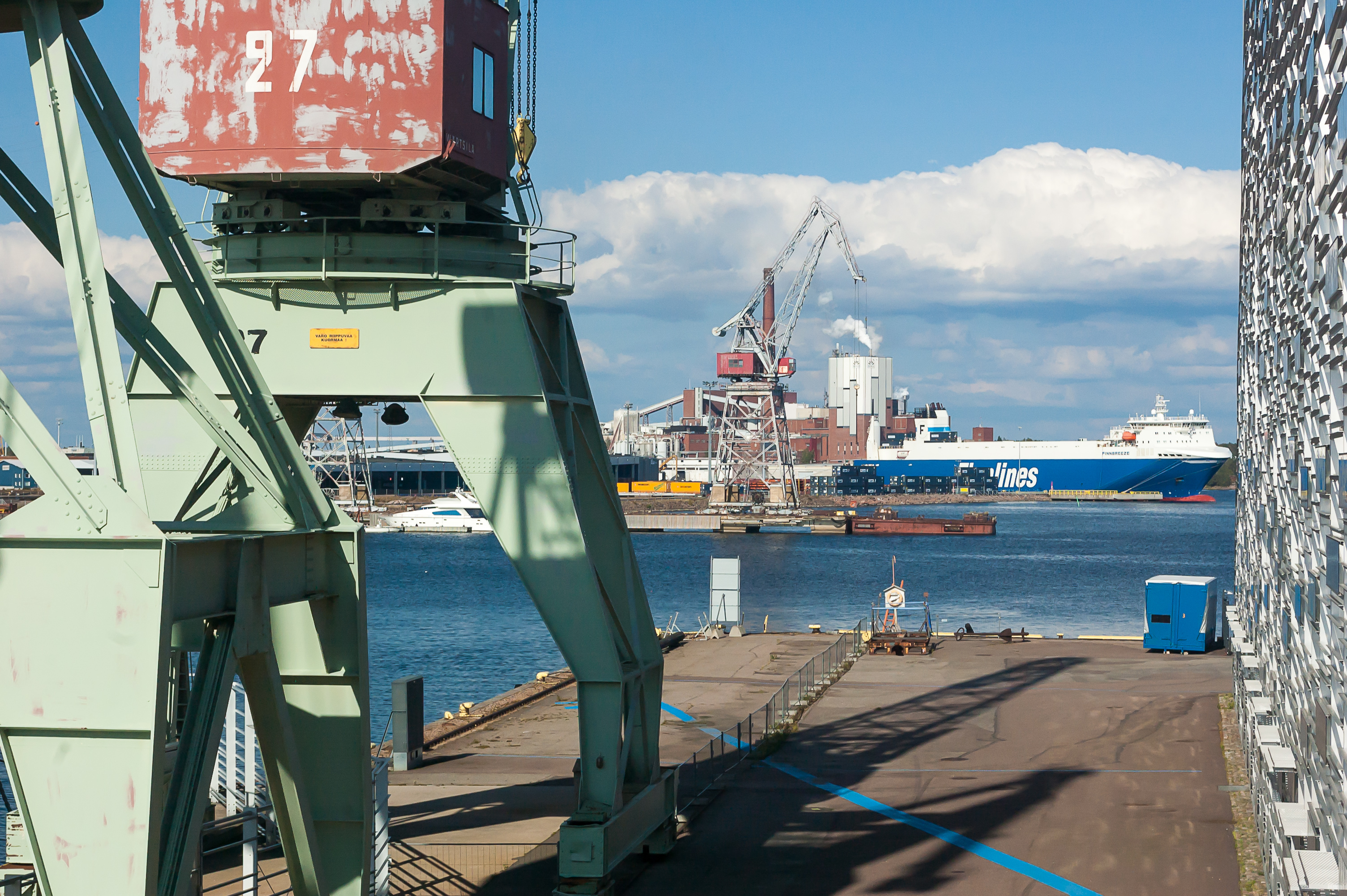 11. Гавань Хиетанен напротив музея специализируется на ро-ро перевозках (от англ. roll on/roll off (закатить-выкатить); когда целая фура тупо целиком заезжает на борт, плывет куда-то, и так же съезжает в порту назначения и едет себе куда ей надо дальше). Финская компания Финнлайнс (Finnlines), собственно, как раз и специализируется на ро-ро-перевозках, хотя у них есть и ро-пакс-паромы (ро-ро + пассажиры), в частности, на линии Хельсинки-Травемюнде (Германия). У большинства их судов названия начинаются на Finn-, что иногда звучит достаточно забавно. Сейчас в гавани виден «Финнбриз» (Finnbreeze), построенный в 2011 году в Нанкине, Китай. Финнлайнс на данный момент владеет итальянская Гримальди-Групп.