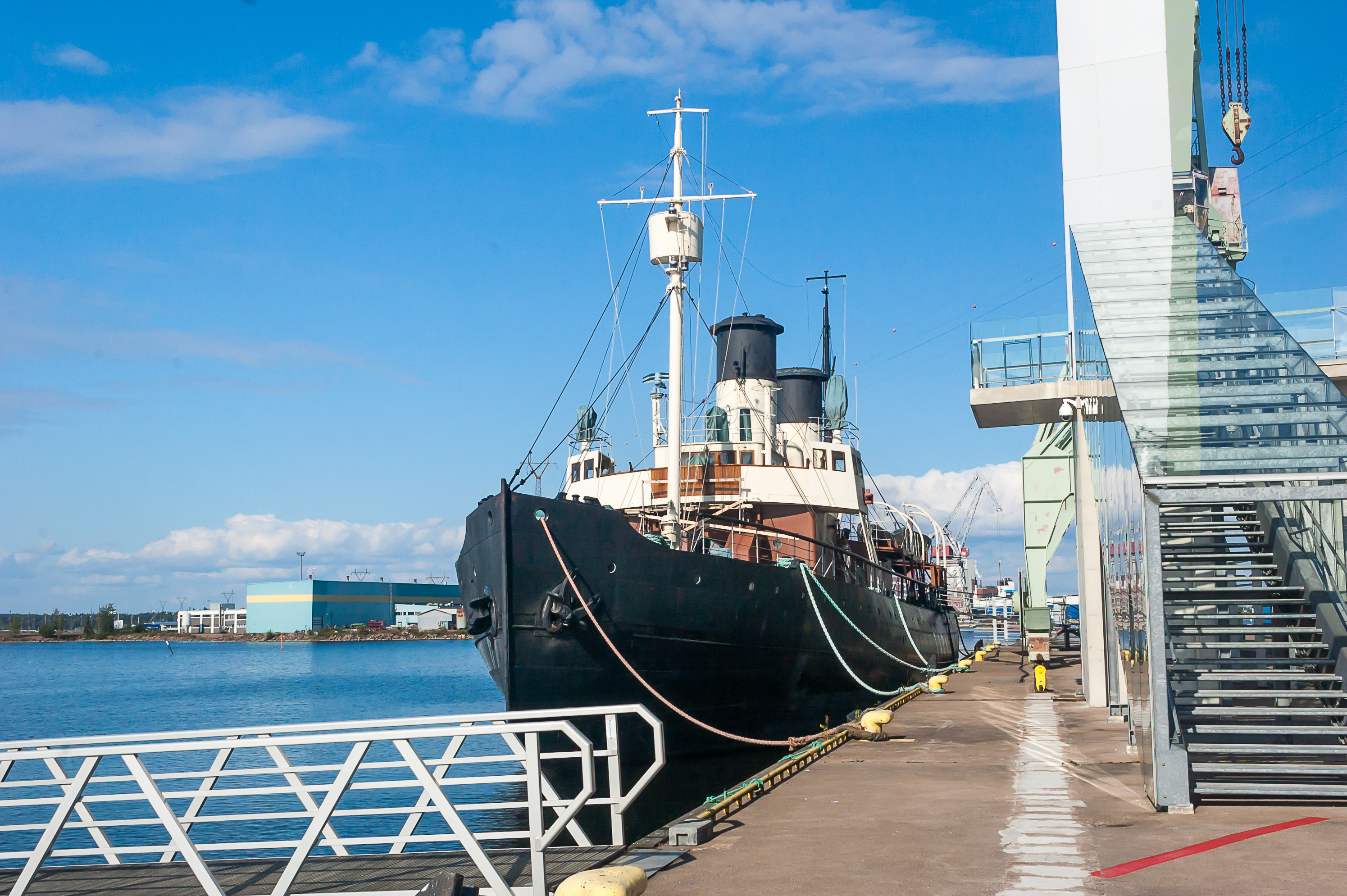7. На пристани за музеем стоят несколько старых кранов, и пришвартованы музейные суда. По другую сторону гавани видна гавань Хиетанен (Hietanen), одна из действующих гаваней порта Котки.