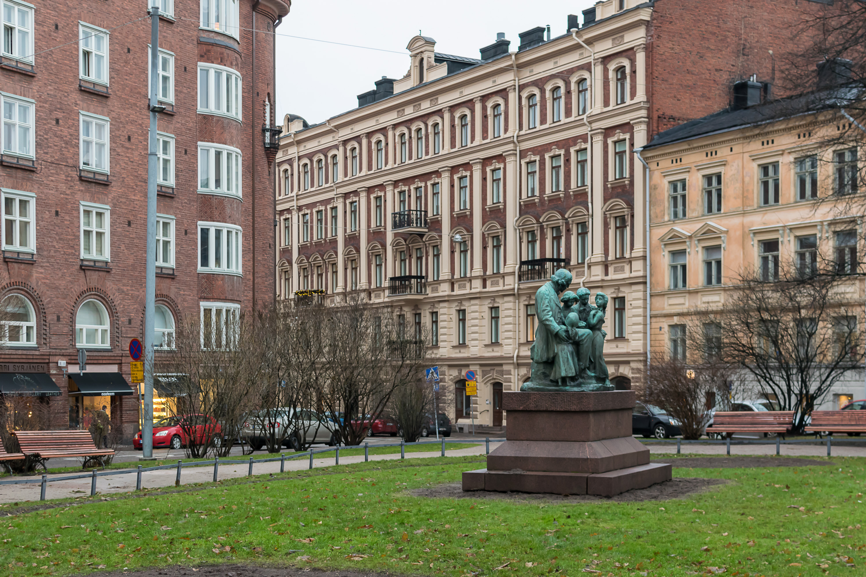 4. Я пошел от вокзала на юг, и проспект Маннерхейминтие вскоре перешел в более тихие улицы. Это памятник «Топелиус и дети» Закариусу Топелиусу (Zacharias Topelius), известному финскому писателю 19 века. Наибольшую популярность получили его сказки, поэтому и памятник с детьми. Именно Топелиусу принадлежит идея использовать для финского национального флага знакомые белый и голубой цвета (хотя сам флаг он предлагал другой, не в форме скандинавского креста). Это было в эпоху Великого Княжества Финляндского, когда никакого собственного флага у Финляндии еще не было.