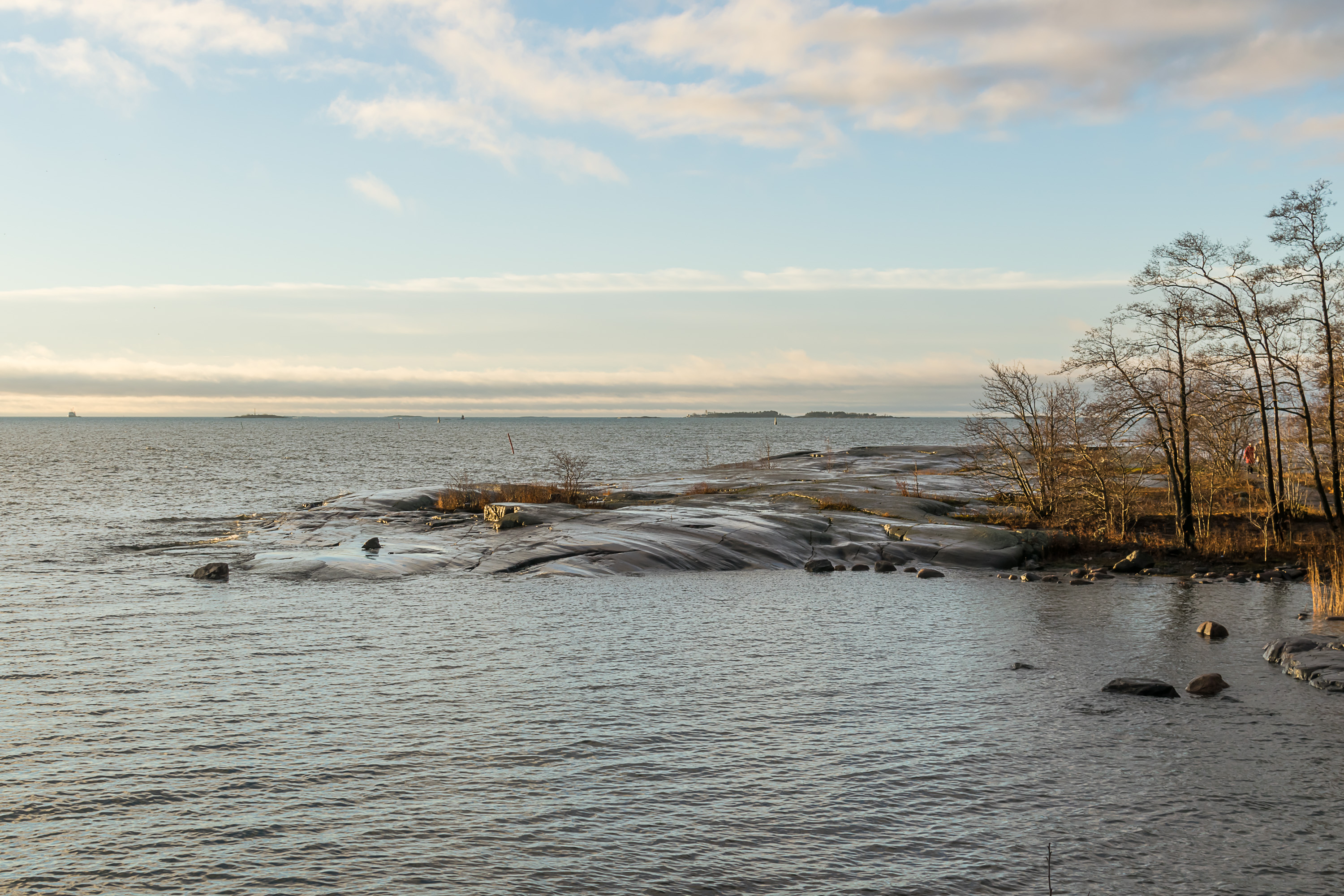 14. Конечно, заходить в ресторан совсем необязательно, можно и просто прогуляться по островами. На них есть пляж, столики для пикников, и много-много видов на море. Кусок скалы слева относится к соседнему острову Харакка (Harakka, фин. Сорока), заметно больше Уунисаари. Этот остров до 1989 года занимали военные, и на нем остаются здания казарм, но в остальном он сейчас служит музеем природы, благо что на нем особенно много гнездуются морские птицы. Для наблюдения за птицами (бёрдинг, говоря по современному) есть небольшая природная тропа. Моста на этот остров нет, но с большой земли ходит недорогой паром.