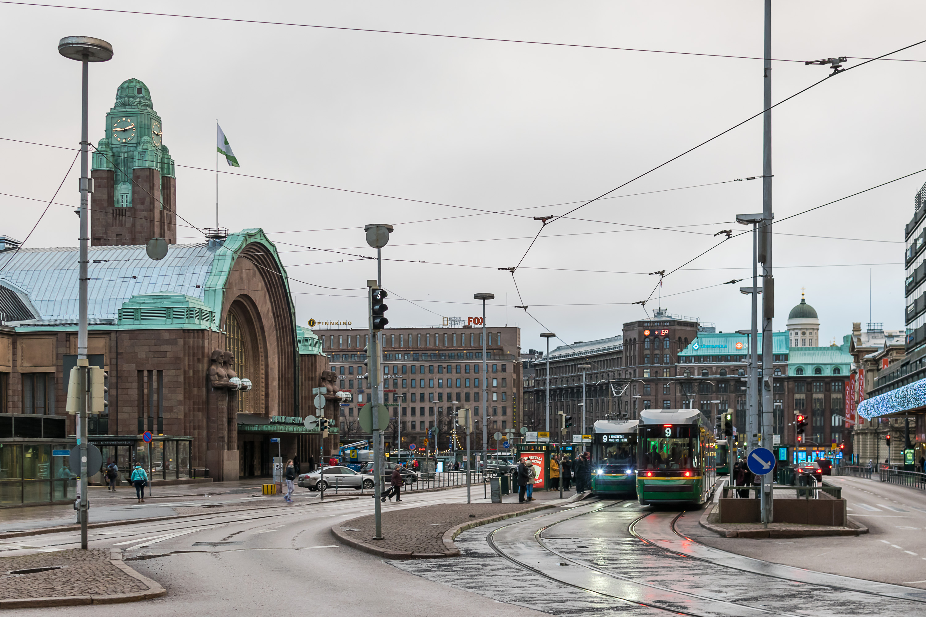 2. Площадь Раутатиентори (Rautatientori, фин. Железнодорожная площадь) и знаменитое здание Хельсинкского вокзала встретили меня мрачным сырым ноябрьским утром примерно так. У выхода ко мне подошел молодой парнишка и сказал «антеекси» и дальше что-то по-фински. «Сорри, ай доунт спик финниш», говорю. Он и ухом не повел и переключился на безупречный английский и попросил у меня мелочи уже по-английски. Ну, у меня наличных евро не было вообще, в любом случае. Самое смешное, что у парня была точно такая же бородка в две косички, как у Марко Хиетала из группы Nightwish. Вообще в Финляндии не так уж редко так ходят.