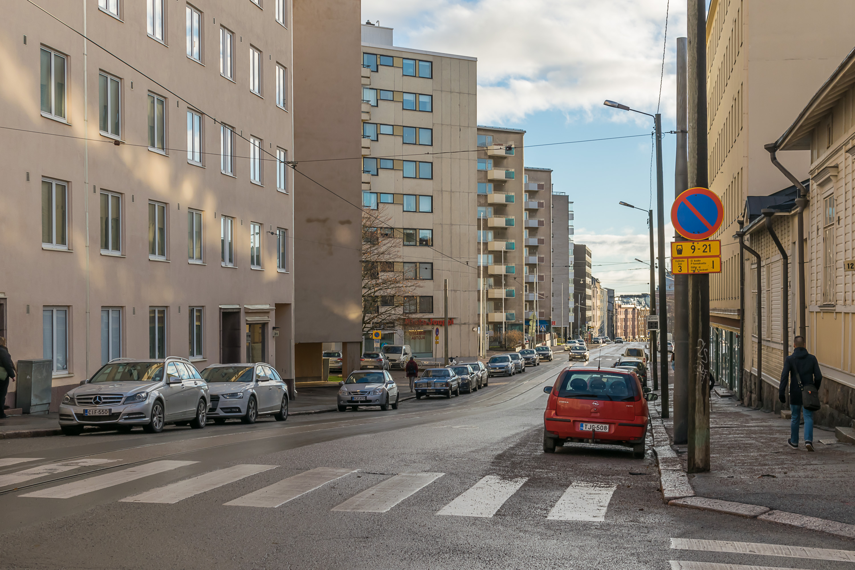 6. Улица Таркк’ампуйянкату (Tarkk’ampujankatu), с трамвайной конечной. Интересно, почему рельсы тут загибаются чуть больше, чем нужно. Название улицы пишется по-необычному, с апострофом; на современном финском было бы Tarkka-ampujankatu. Это означает «Снайперская улица», в честь находившихся неподалеку казарм и военного полигона.
