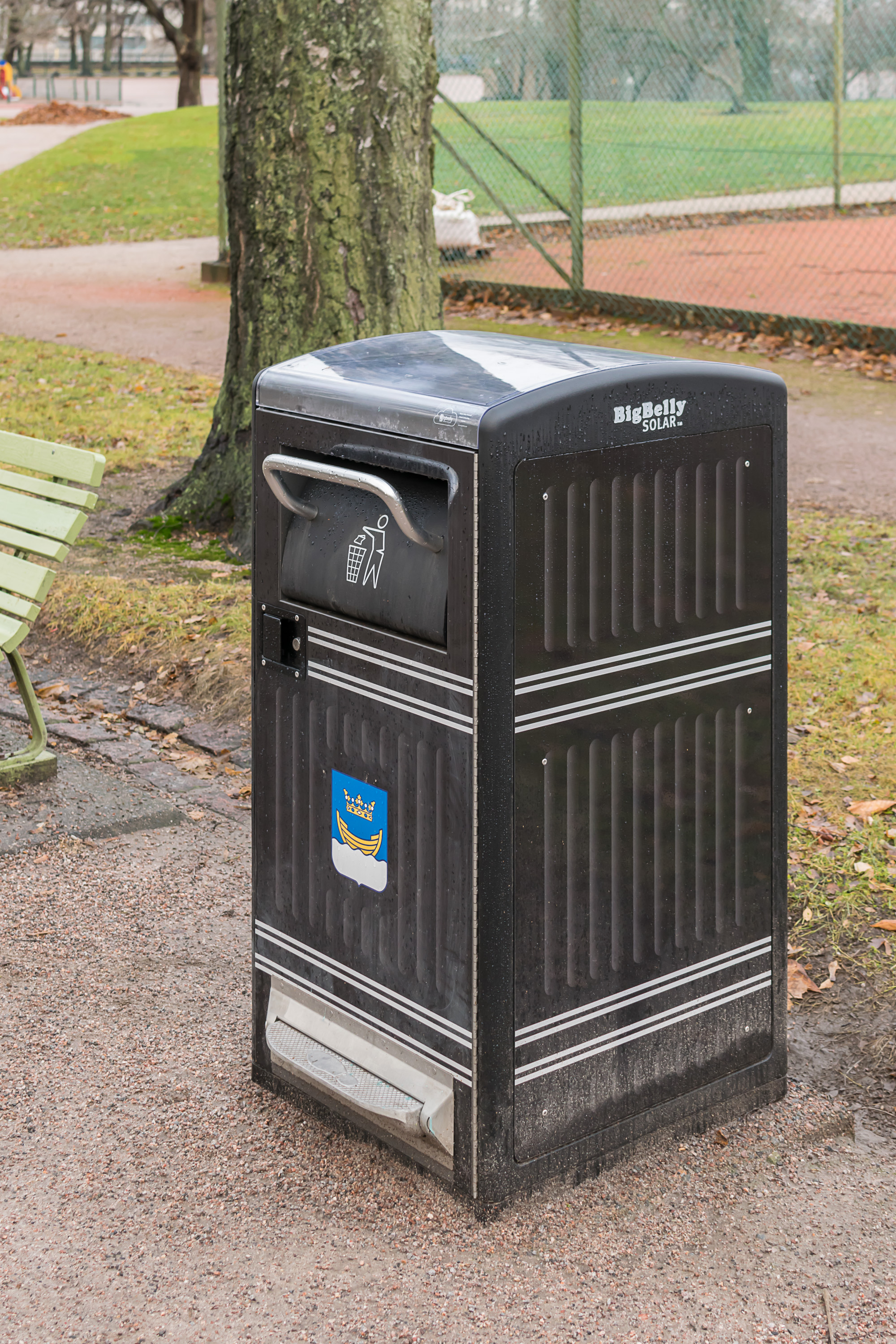 30. В парке Кайсаниеми к северу от центра города (Kaisaniemi, фин. Мыс Кайсы, в честь женщины, который здесь когда-то принадлежал ресторан) стоят очень интересные урны, с солнечными панелями, вмонтированными в крышку (на фото, к сожалению, толком не видно). Насколько мне удалось нагуглить, в эти урны встроены мусорные прессы с питанием от этой солнечной батареи. Прессы, включающиеся достаточно редко, что мощности солнечной батареи хватает, позволяют опорожнять урну намного реже — вплоть до семи раз реже обычных. Это, в свою очередь, позволяет сэкономить на труде мусорщиков. Мы же в Скандинавской стране, а в Скандинавских странах самое дорогое — это всегда человеческий труд. Хотя каждая урна и стоит по несколько тысяч евро, так что экономия выглядит несколько сомнительно. Но видимо все-таки выгодно — эти «большие брюшки» (BigBelly, название модели на английском) в последнее время довольно активно ставят в различных странах по всему миру.