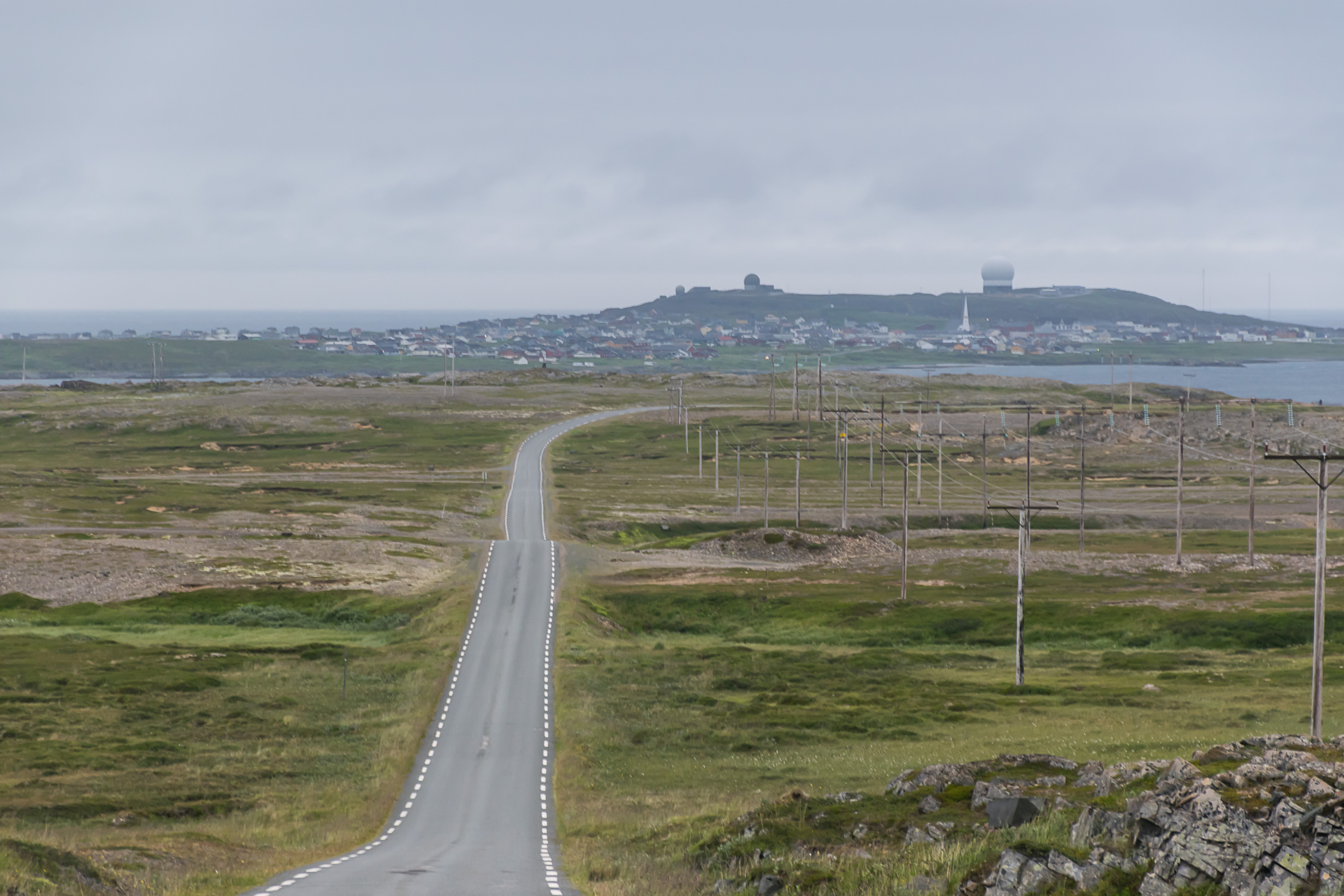 25. Возвращаемся обратно в Вардё из Хамнингберга. Хорошо видно главный ориентир Вардё — огромный белый шар, НАТОвский радар на холме.