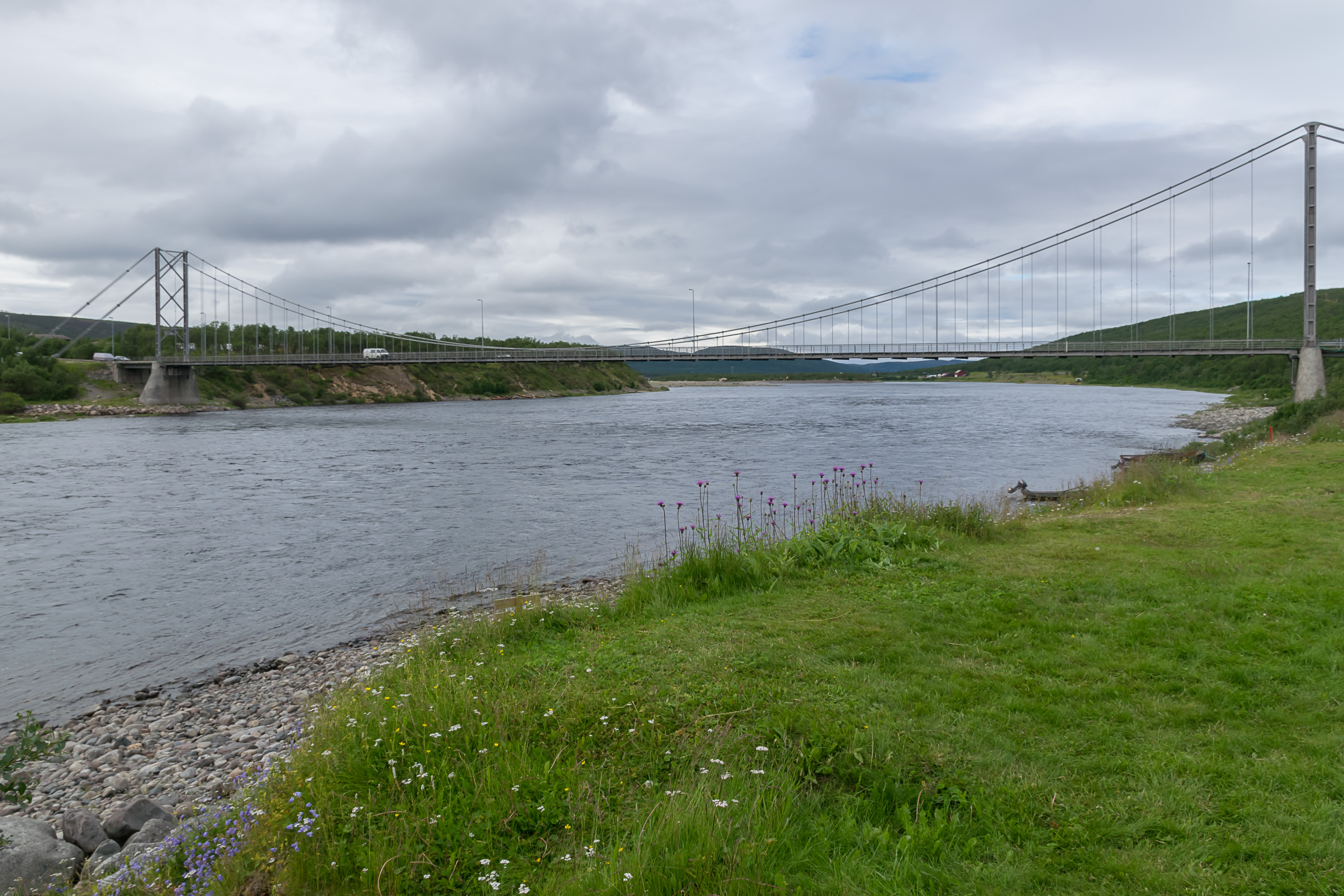 27. После этого мы покинули полуостров Варангер, проехав обратно той же дорогой через Вадсё и Варангерботн, и достигли поселка Тана-Бру. Tana Bru означает «мост [на реке] Тана», и здесь и впрямь находится единственный в Норвегии мост через реку Тана. А так как река течет от финской границы в море, этот узкий мост, получается, и есть единственная связь с крайним северо-востоком страны, включая Варангер, Киркенес и Пасвикдален.