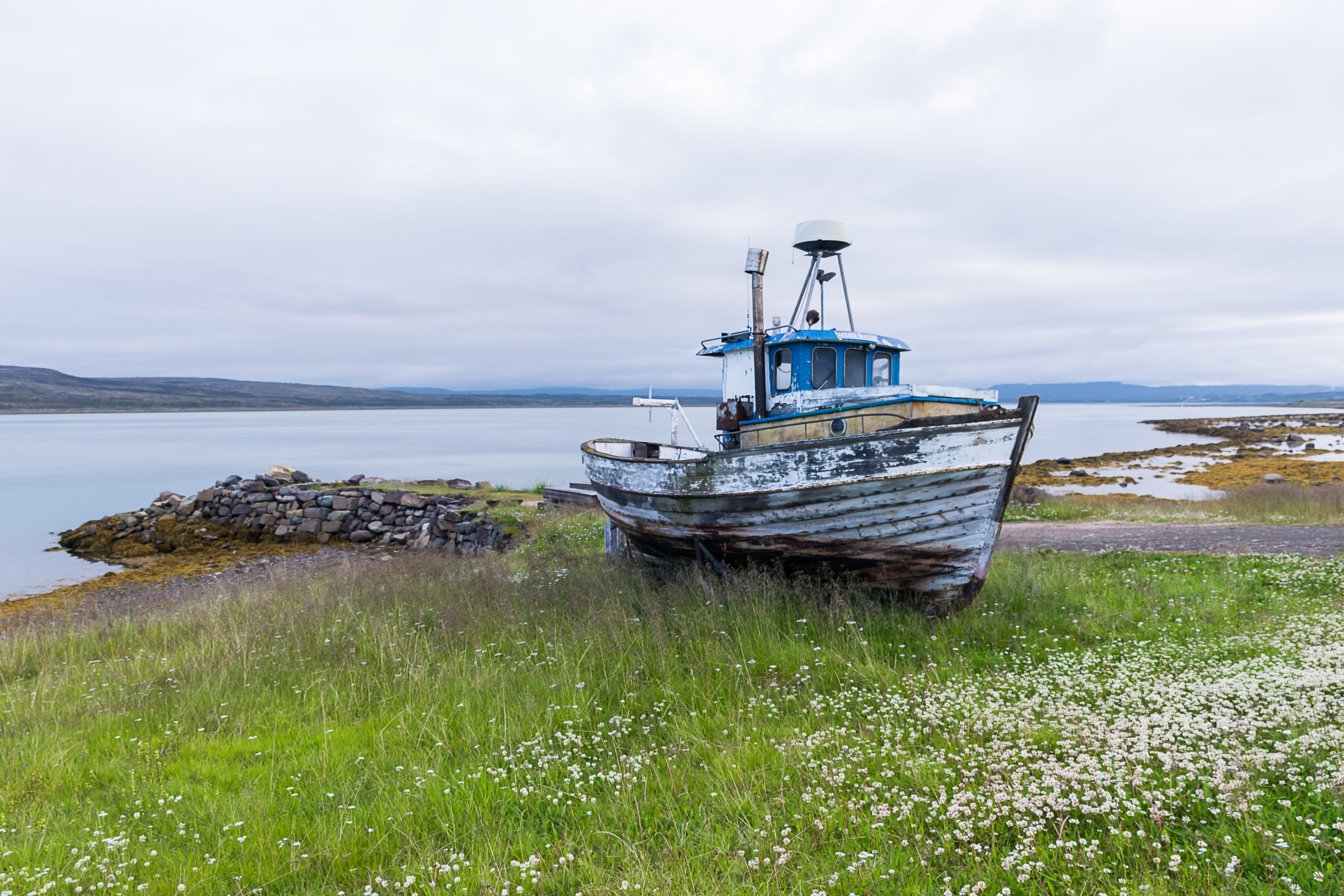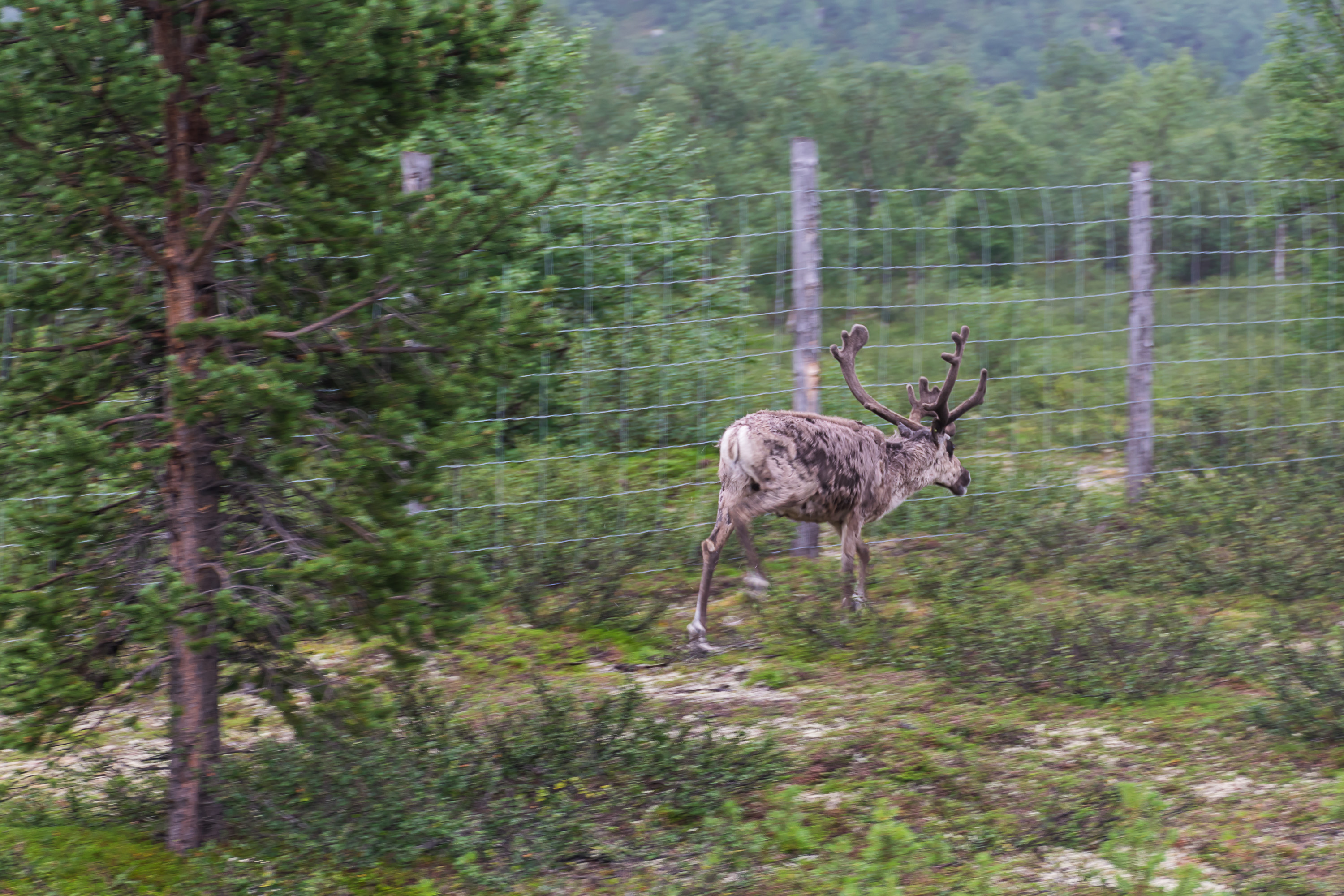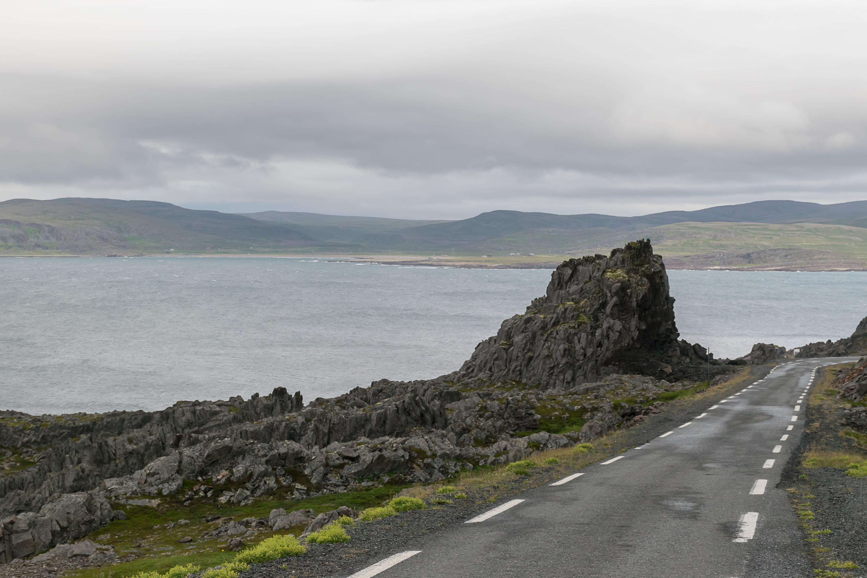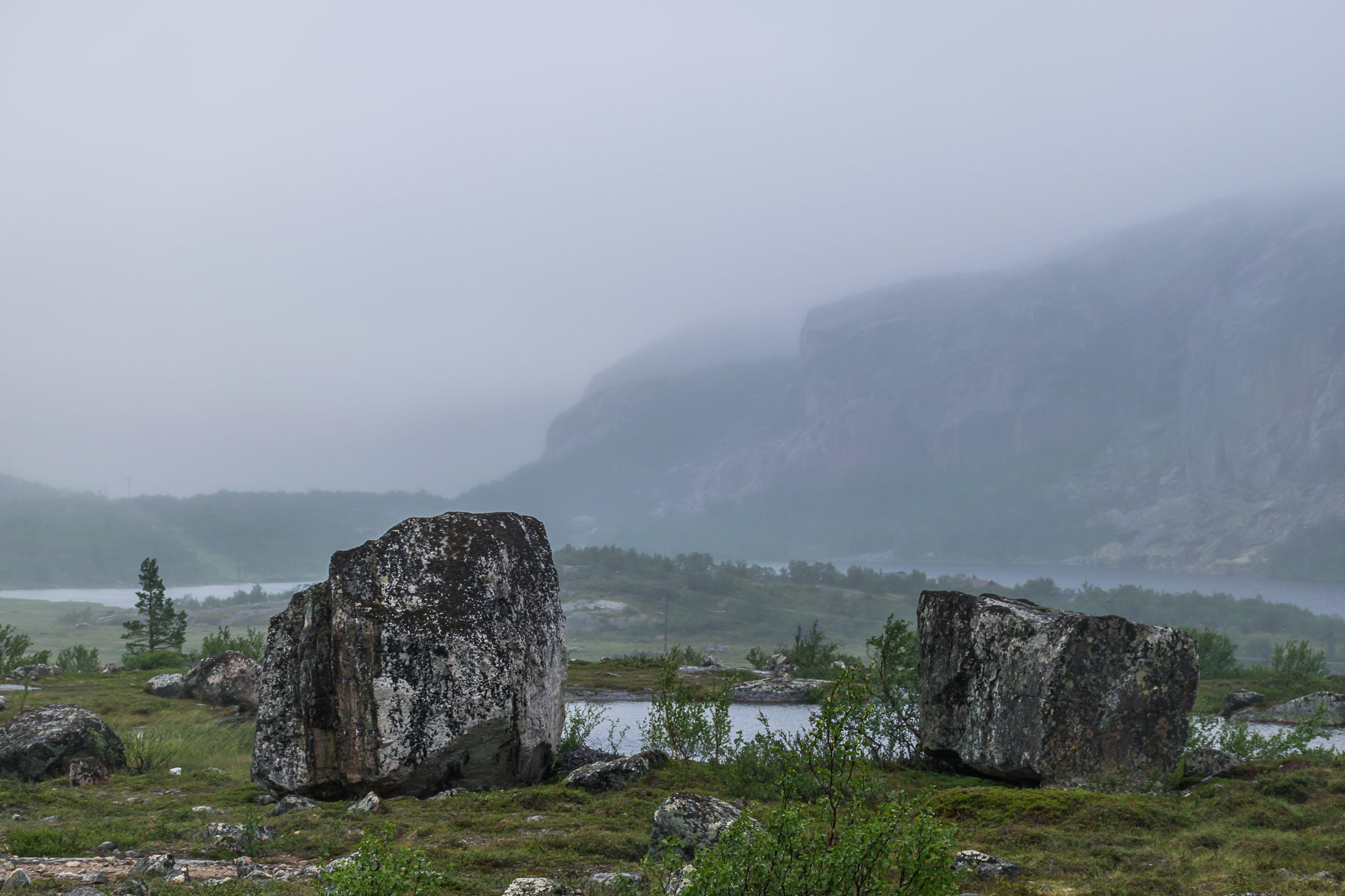 12. Это был очень насыщенный день. После прерванной (из-за сильного дождя) попытки пешком из кемпинга дойти до Мелькефосской ГЭС, мы поехали обратно той же дорогой до самого погранперехода, и перед самым погранпереходом свернули на узкую дорожку, ведущую через невысокое горное плато к деревне Гренсе-Якобсэльв. На этом плато мы впервые и увидели арктические пейзажи, а также оленей (спойлер: не на этом фото, не ищите).