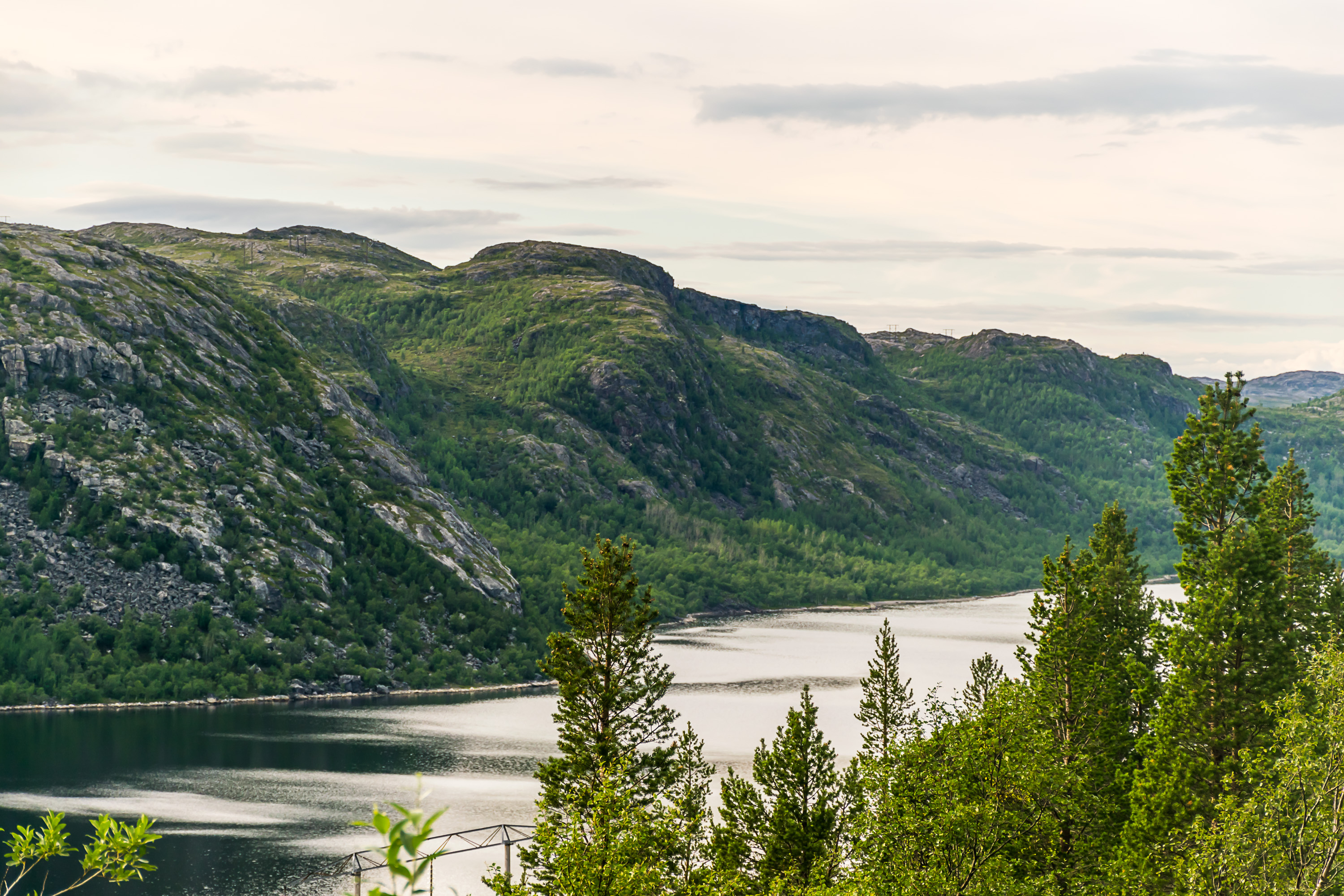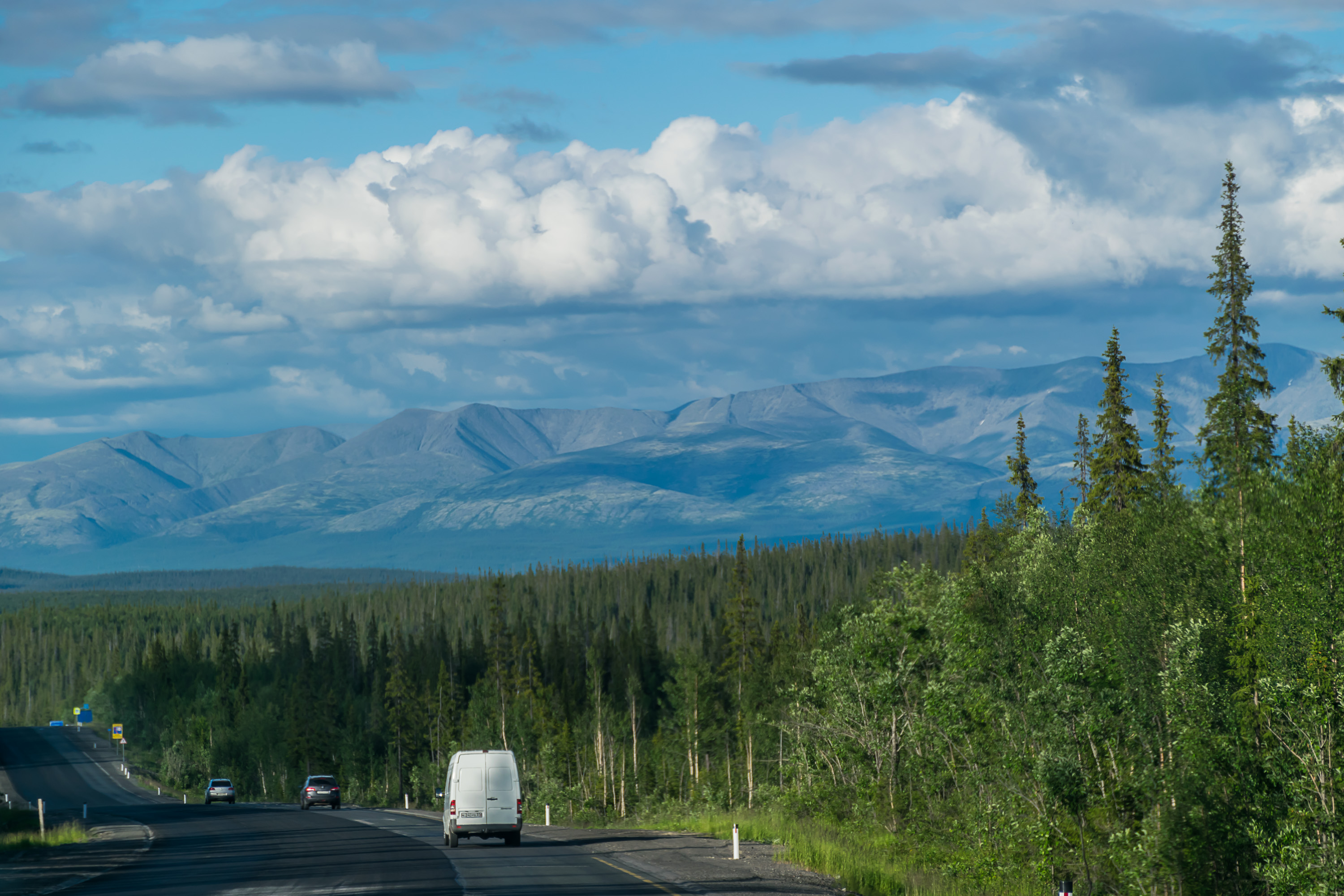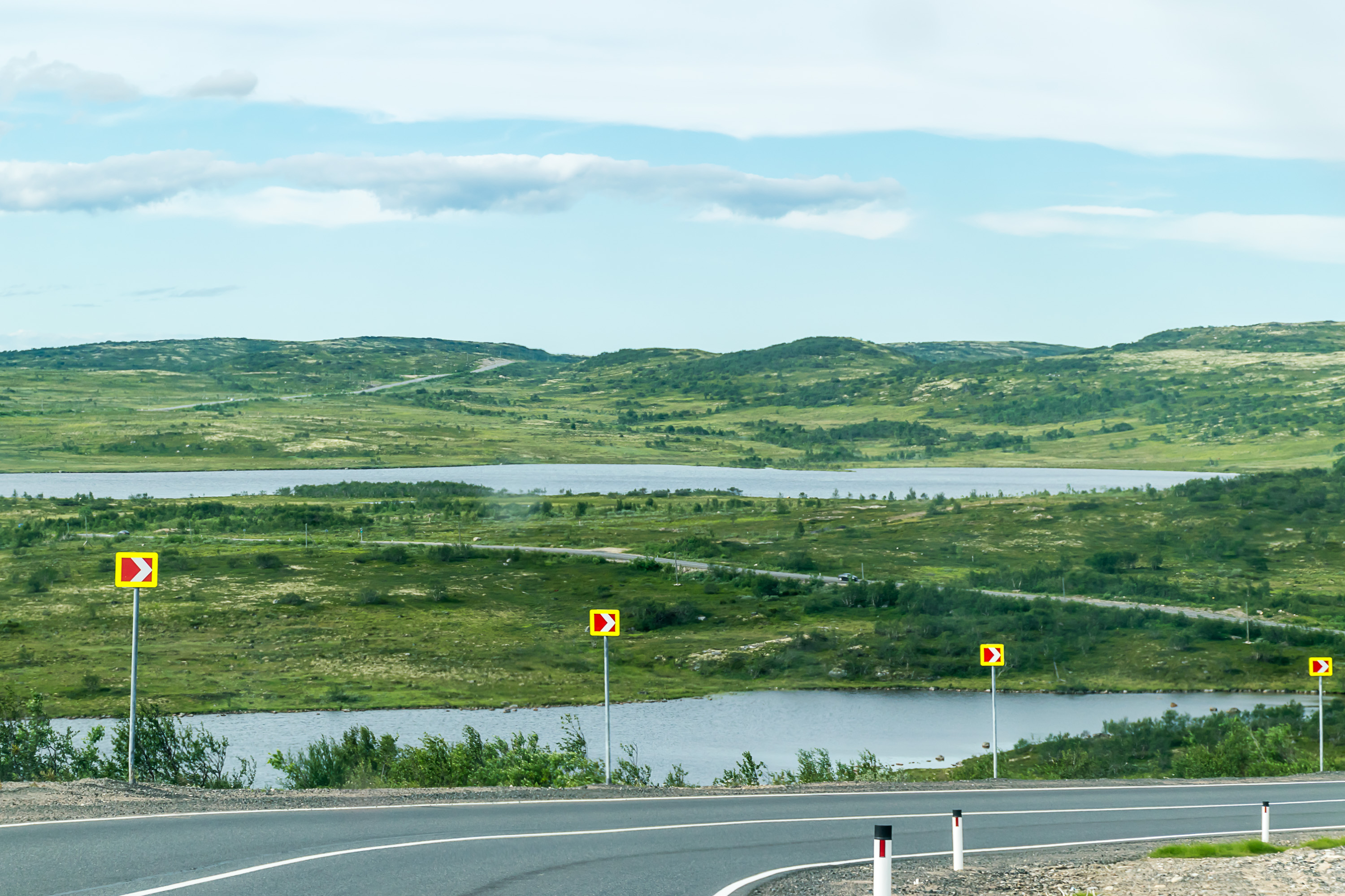6. Трасса «Кола» в Мурманской области становится намного живописнее, настолько, что я даже объявил ее самой красивой дорогой, по которой я когда-либо ездил (позже, конечно, пришлось отдать этот титул нескольким норвежским дорогам). В географическом плане Мурманская область и Кольский полуостров — более или менее продолжение Лапландии, и они так же покрыты красивыми пологими безлесными сопками — даже в среднем и повыше, чем в Финской Лапландии, по-моему. В их число входят знаменитые Хибины, куда ходят в походы, и с которых катаются на лыжах. На дороге же появляются довольно крутые уклоны, но она остается очень прямой и с отличной видимостью, и практически на всех участках в горку есть дополнительная полоса для грузовиков. В целом очень приятно тут ехать.