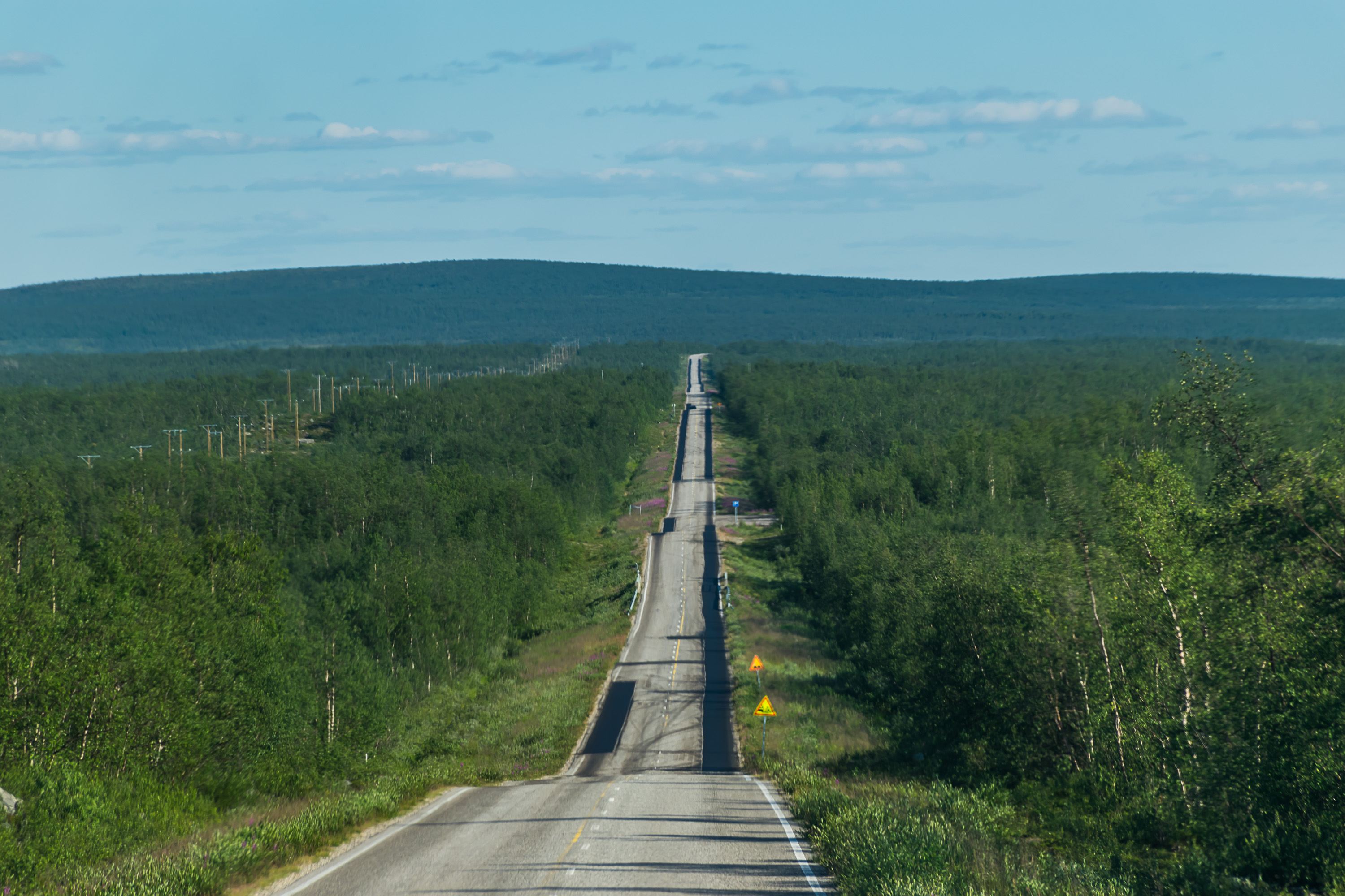 59. Мы поели в кафе в Килписъярви (наконец-то страна, где мы можем себе позволить есть в кафе!) и поехали на юг по Дороге Северных сияний. Дорога летом выглядела очень скучно, хотя и ехать куда проще, чем по норвежским дорогам.