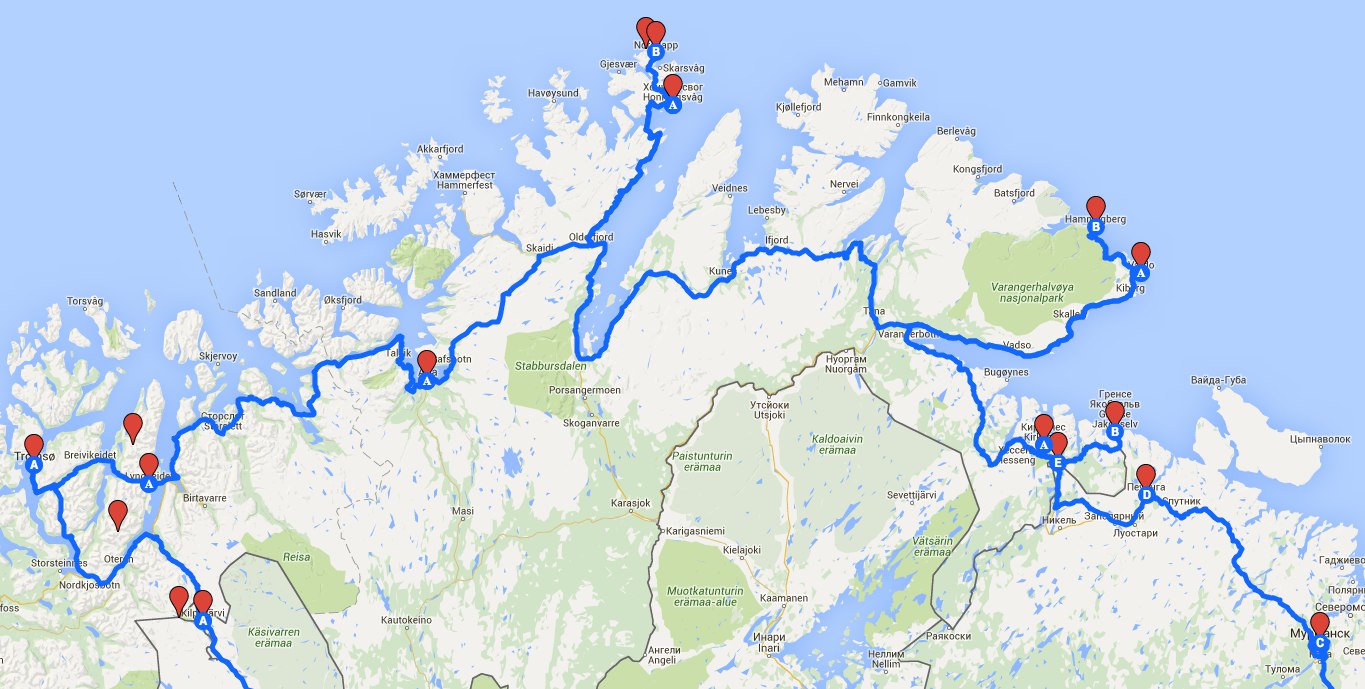 После продолжительного гугленья мы решили, что в Северной Норвегии хотим посетить следующие места, с востока на запад: Варангер-фьорд и полуостров Варангер (особенно городок Вардё), мыс Нордкапп, горы Люнгенские Альпы, город Тромсё, и остров Сенья. На самом деле это более или менее и есть список основных туристических мест Северной Норвегии — за исключением только Лофотенских островов, которые, вероятно, сами по себе стоят целого отпуcка. На каждое из этих мест мы отвели по 2-3 дня, что позволило нам везде посетить по несколько достопримечательностей в расслабленном темпе. С другой стороны, переезды были довольно протяженные, вплоть до >500 км за день (участок Вардё-Хоннингсвог), что на норвежских дорогах на самом деле весьма выматывающе.