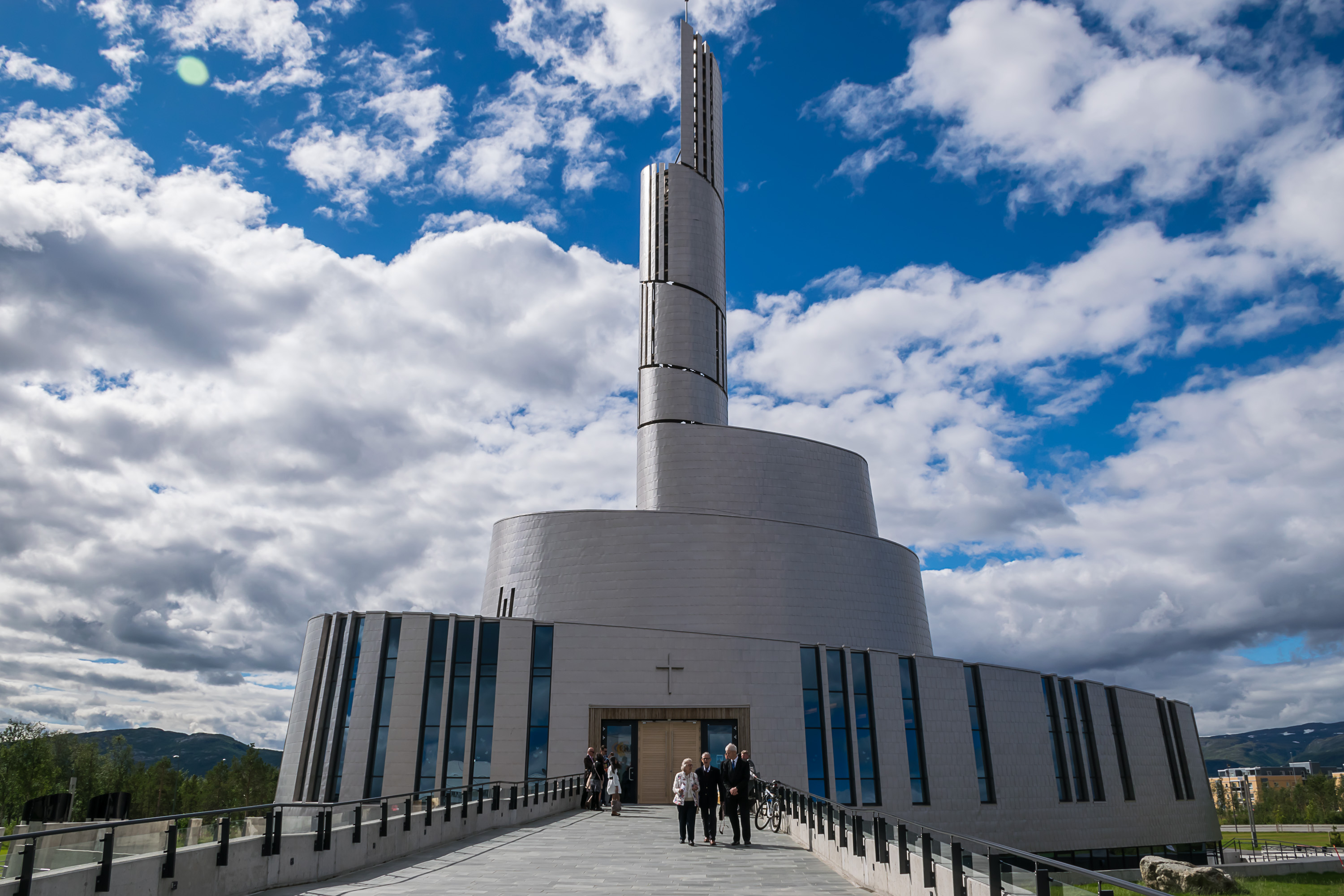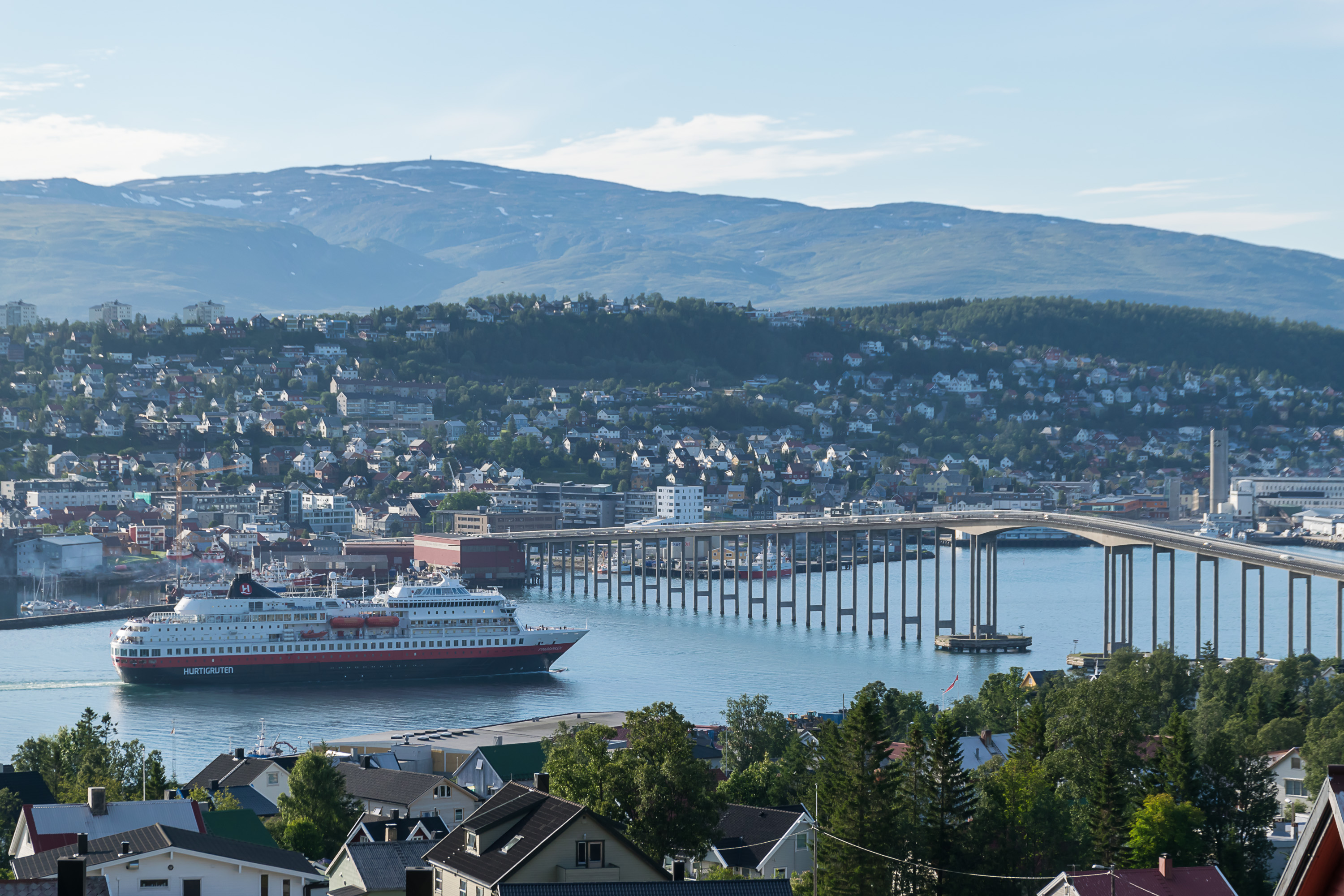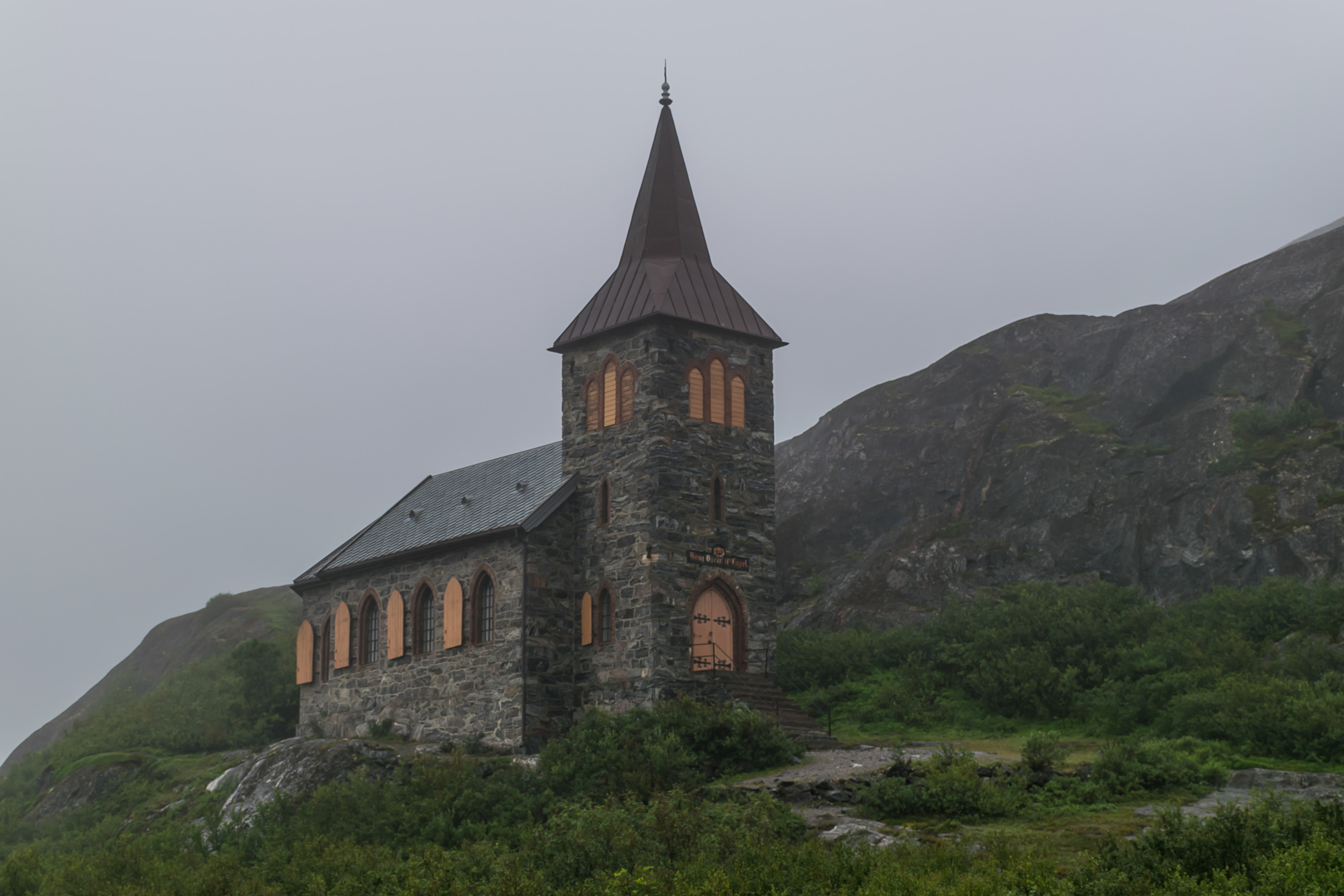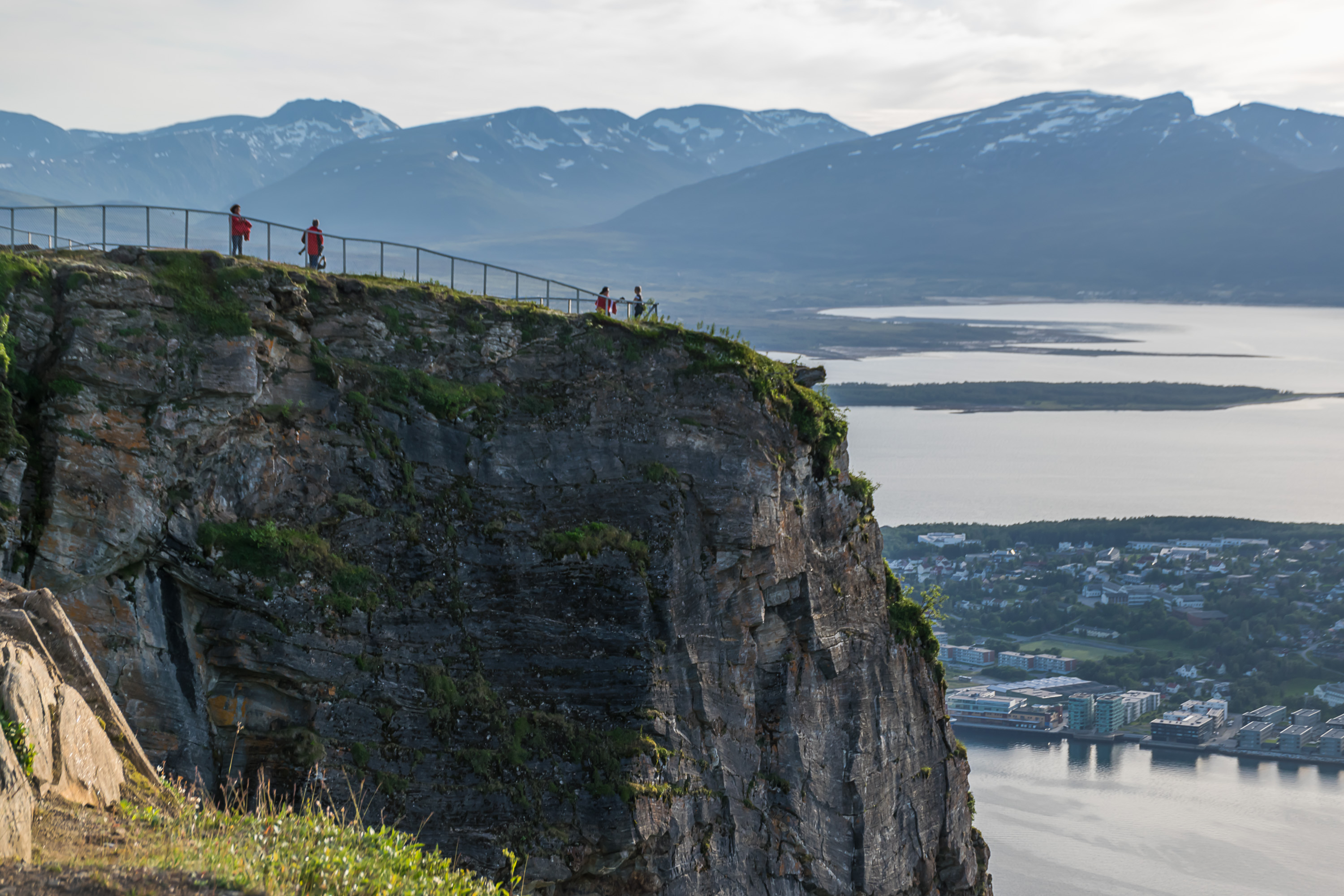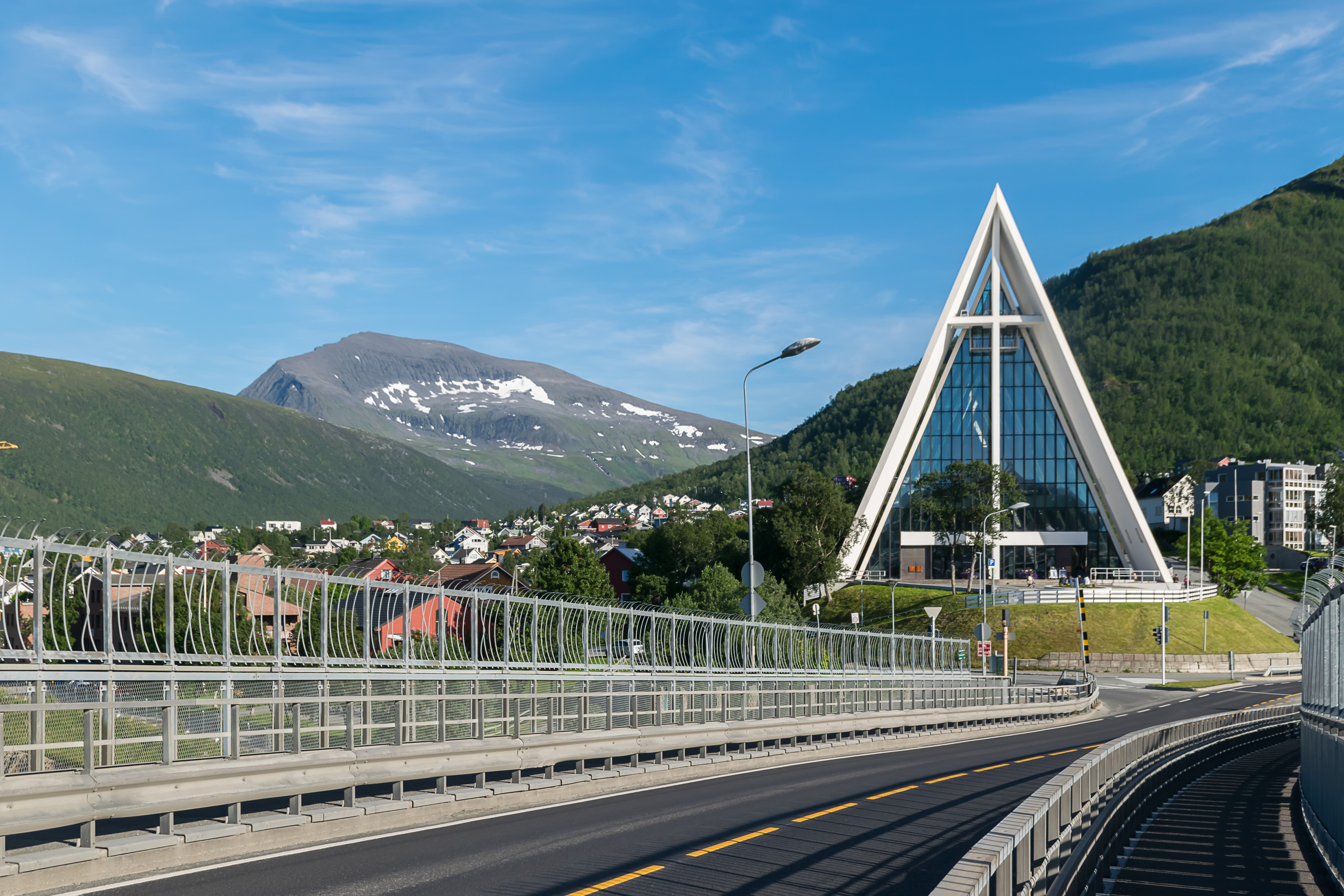 За собором видна долина Тромсдален (Tromsdalen), в которой расположился одноименный пригород Тромсё. Она заканчивается 1200-метровой горой с заметными снежниками, Тромсдальстинден (Tromsdalstinden). Туда мы, увы, не забрались, зато по крайней мере забрались на Стурстейнен (Storsteinen, норв. Большой камень), гору куда более скромных размеров, склон которой виден на фото справа.