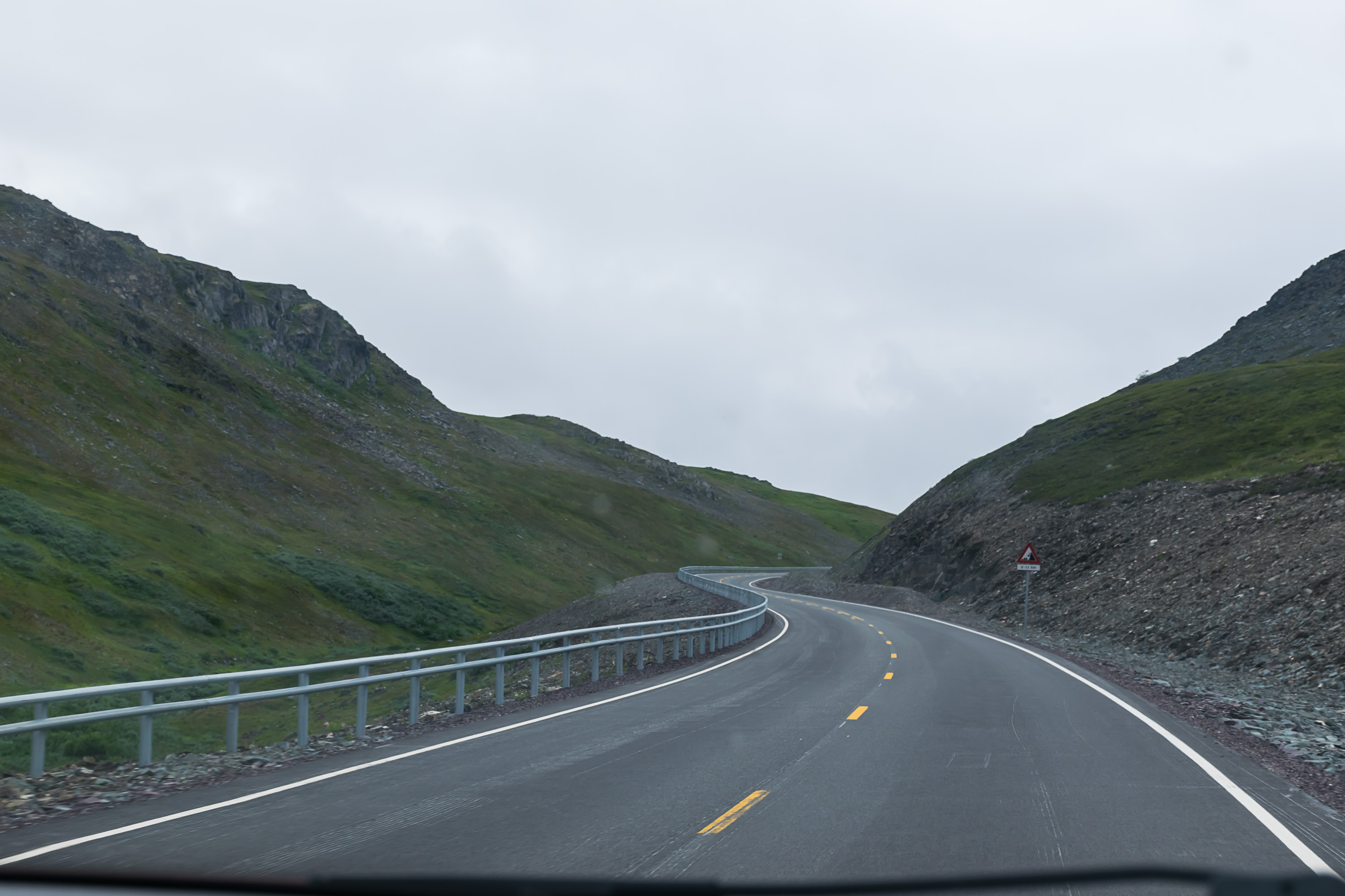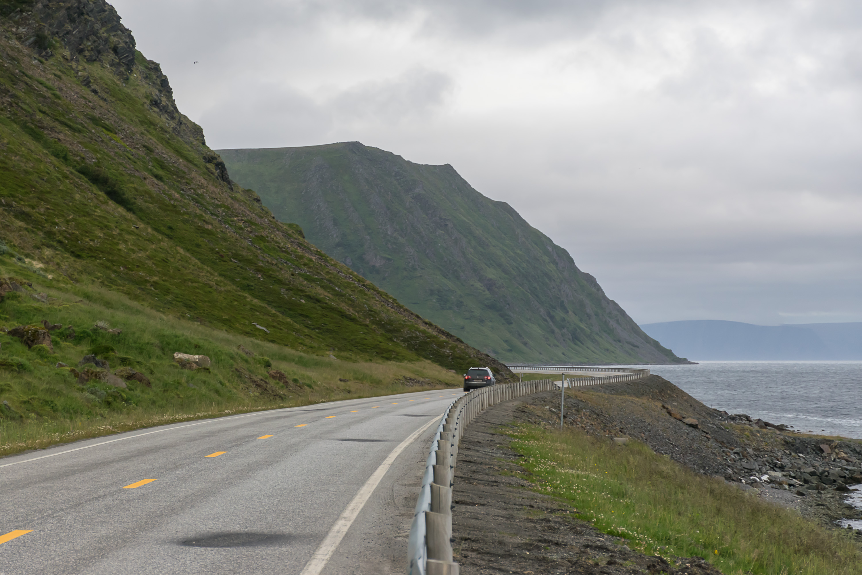 28. Вместо того, чтоб ехать по трассе E6 через регион Внутреннего Финнмарка, мы выбрали Губернскую дорогу 98 Финнмарка, которая является альтернативой для E6 на участке Тана-Бру — Лаксэльв. Трасса 98 короче, но рельеф там намного более сложный — она идет по очереди по побережью фьордов и через горные перевалы между этими фьордами. Но поэтому она и куда живописнее, за что мы ее и выбрали. На дороге есть как отличные новые участки, как, например, этот, в горах Ифьордфьеллет, так и старые узкие и кривые; хотя некоторые старые сейчас реконструируют (с реверсивным движением и прочими радостями). Вдоль трассы 98 нам за день удалось посмотреть, по крайней мере мельком, три больших фьорда: Тана-фьорд, Лаксе-фьорд и Порсангер-фьорд.