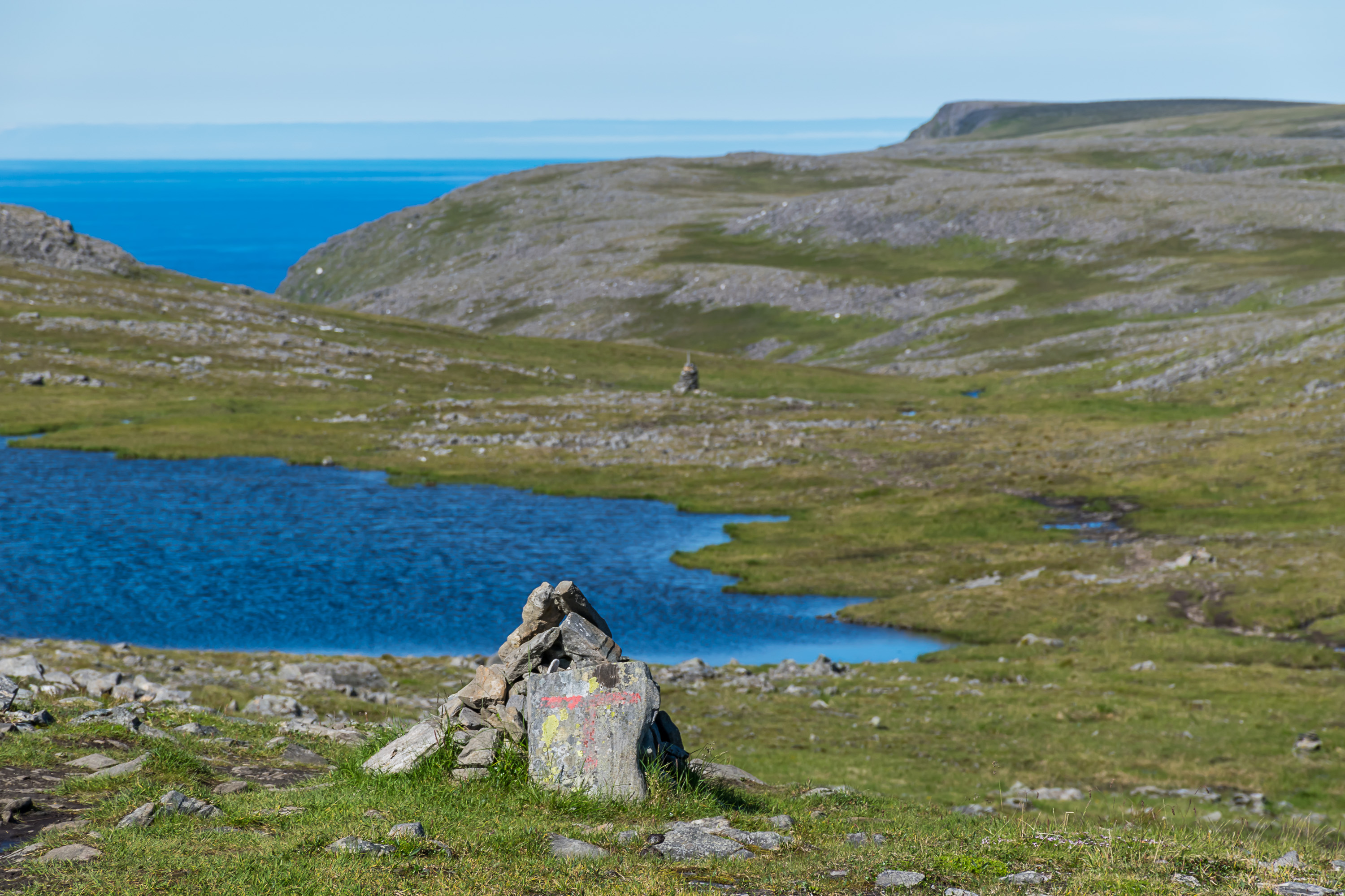 Тропа на мыс Кнившелльудден (Knivskjellodden) начинается от стоянки, не доезжая 5 км до Нордкаппа, и идет по покрытым тундрой плато, с редкими озерцами, ручьям, и бродящими вокруг оленям; а затем спускается с высоты 300 м почти до уровня моря, и последний ее участок идет вдоль мыса по находящейся под приличным углом поверхности скал. Тропа не самая простая — а для нас оказалась особенно непростой, потому что я почему-то был уверен, что она длиной 7 км в одну сторону, а оказалось, на самом деле 9 км — то есть всего 18 км по тундре. Путь туда и обратно занял у нас семь часов.