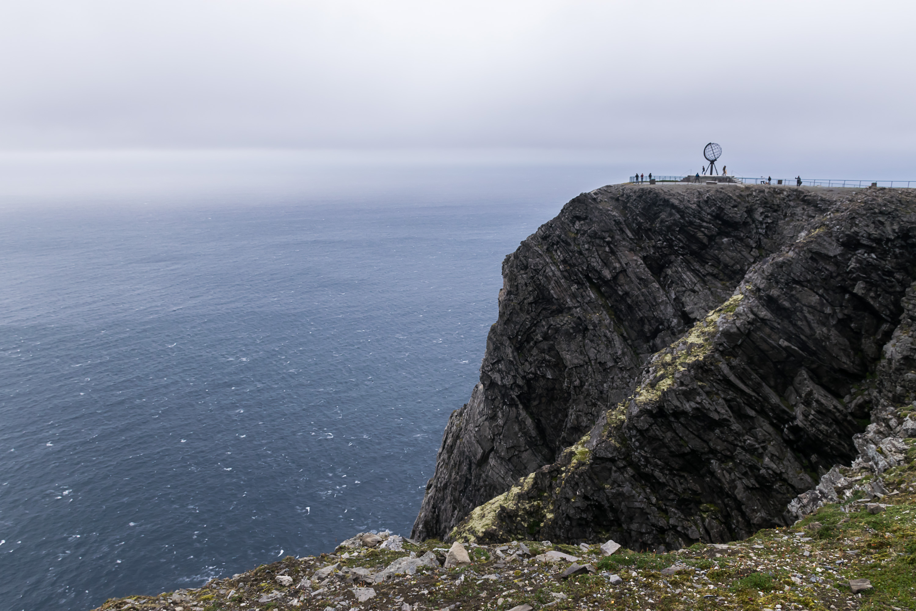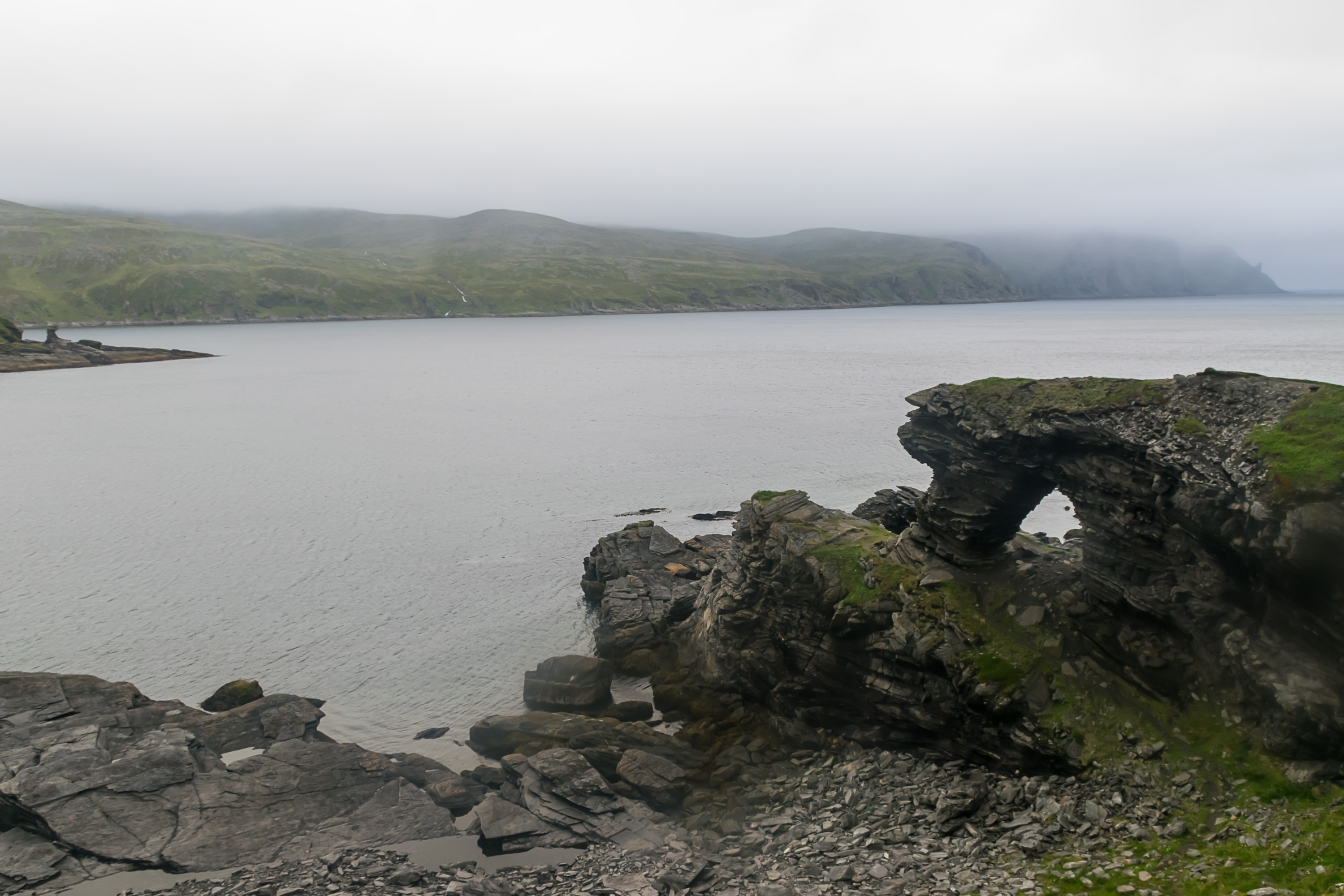 32. Настоящая самая северная точка более-или-менее связанной Европы (без арктических архипелагов) — мыс Кнившелльудден, соседний с Нордкаппом, но выдающийся на 1.5 км дальше на север. Он выглядит менее эпично, и туда попасть можно только пешком по многокилометровой походной тропе. На Кнившелльуддене мы тоже очень хотели побывать, но решили, что погода слишком неподходящая, да и по времени поздновато. (Правильно решили.) В качестве компенсации сходили в куда более скромный походик из деревни Скарсвог (Skarsvåg; самое северное постоянное поселение в Норвегии, не считая опять же всяких Шпицбергенов) к скале Киркепортен (Kirkeporten, норв. Церковные ворота). Это большая скала у моря со сквозной дыркой, достаточно большой, что там можно встать в полный рост. С нее вдали видны утесы Нордкаппа. На этом этот день и завершили.