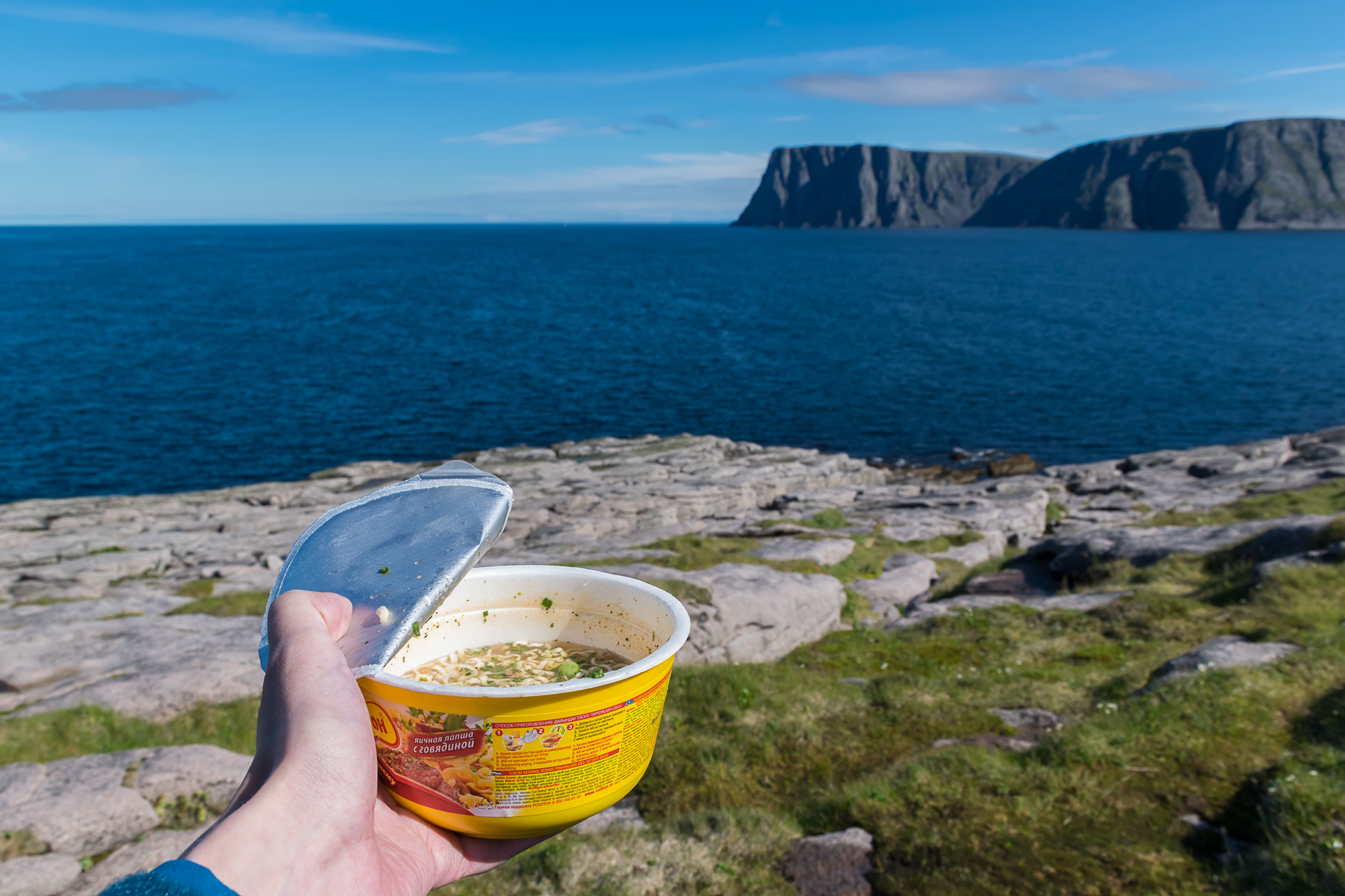 34. На самом мысе стоит небольшой памятный знак «самая северная точка Европы» и ящик с гостевой книгой, а особо больше ничего и нет. Самая, пожалуй, красивая часть Кнившелльуддена — виды соседнего Нордкаппа. Мы попытались поесть лапши в самой северной точке Европы, но получилось не очень, вода на горелка толком не нагрелась, может, из-за ветра.