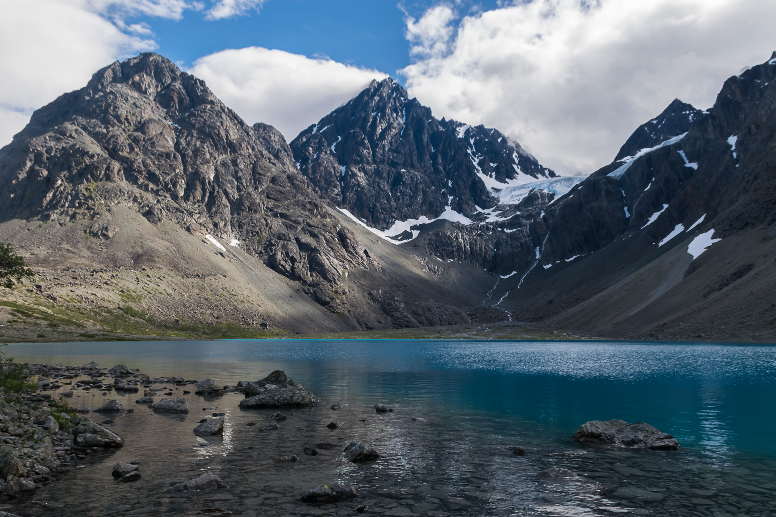 41. На второй день в Люнгене мы выбрали еще более простую тропу, по сути всего лишь очень ровный и пологий подъем через тундру и каменную россыпь к озеру Бловатнет (Blåvatnet, норв. Синее озеро), ледниковому озеру у подножия нескольких гор, известному своим насыщенно-синим цветом. В отличие от Люннсейета и долины Стейндален, озеро находится на западной стороне горной цепи, где климат значительно более суровый (восточная-то ближе к морю полна зелени).