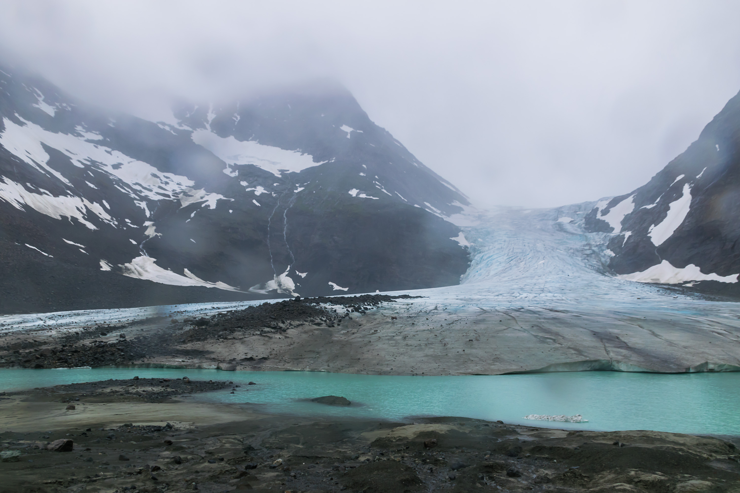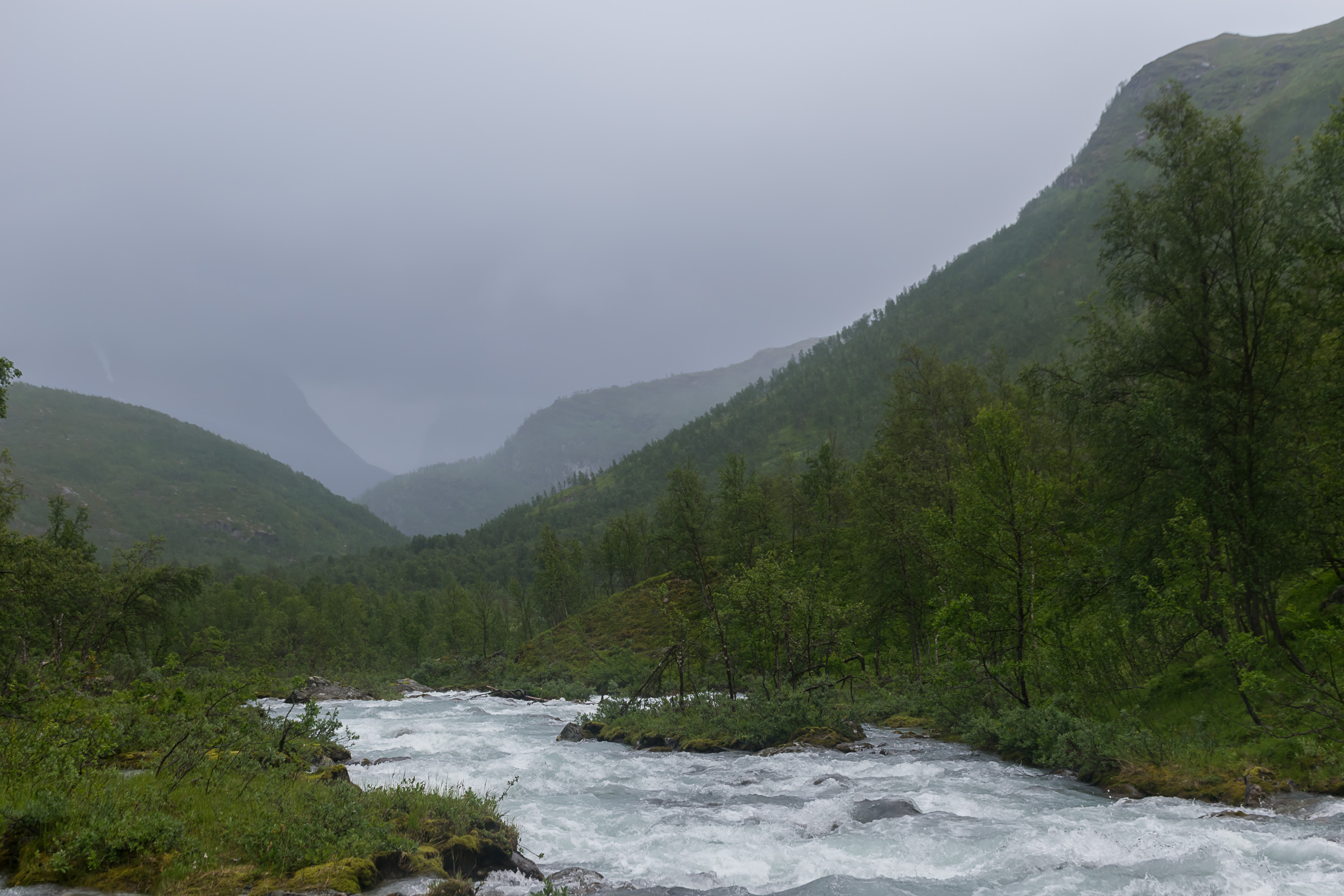 39. Люнгенские Альпы (так и называются — по-норвежски Люннсальпан, Lyngsalpan) имеют высоту до ~1800 м, и, конечно, на большинство, если не на все горы повыше можно залезть, только имея альпинистские навыки и экипировку. В то же время есть и много весьма доступных пеших троп. Мы решили выбрать ту, которая ведет вверх по долине Стейндален, вдоль молочно-голубой реки Стейндальсэльва, на высоту около 450 м к краю ледника Стейндальсбреен (Steindalsbreen, норв. Ледник каменной долины), одного из многочисленных люнгенских ледников.