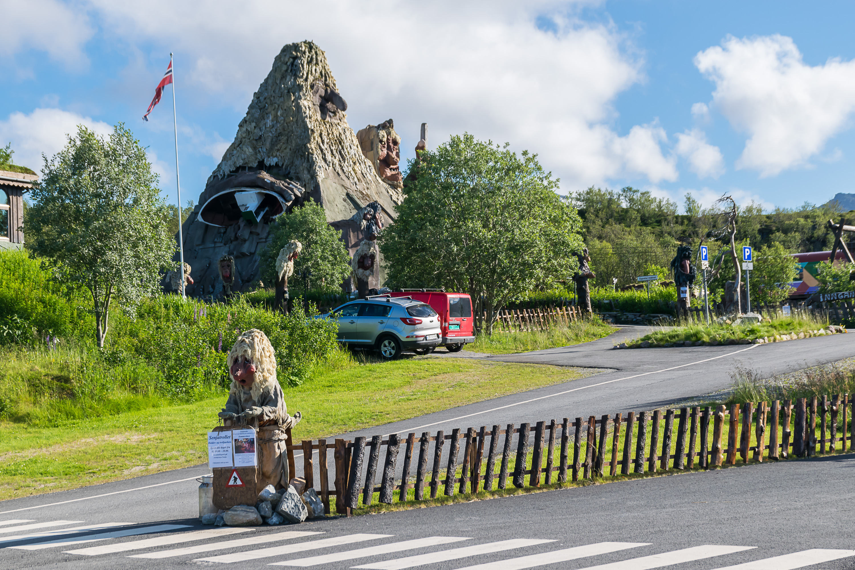 44. В этот день погода снова наладилась, и мы решили ловить момент и съездить на остров Сенья (Senja), считающийся одним из самых живописных мест Северной Норвегии, и несколько напоминающий знаменитые Лофотенские острова. Первой нашей ошибкой было то, что мы попытались доехать туда альтернативным маршрутом по второстепенным дорогам, на запад от Тромсё (через остров Квалёйя и у пролива Маланген). Дорога вышла длнной и утомительной, и, что хуже, по дороге смотреть было решительно не на что. И до острова Сенья доехали в итоге уже поздновато. Первое, что мы там увидели из интересного — парк Сеньятроллет (Senjatrollet), в котором находится вроде как самая большая в мире статуя тролля.