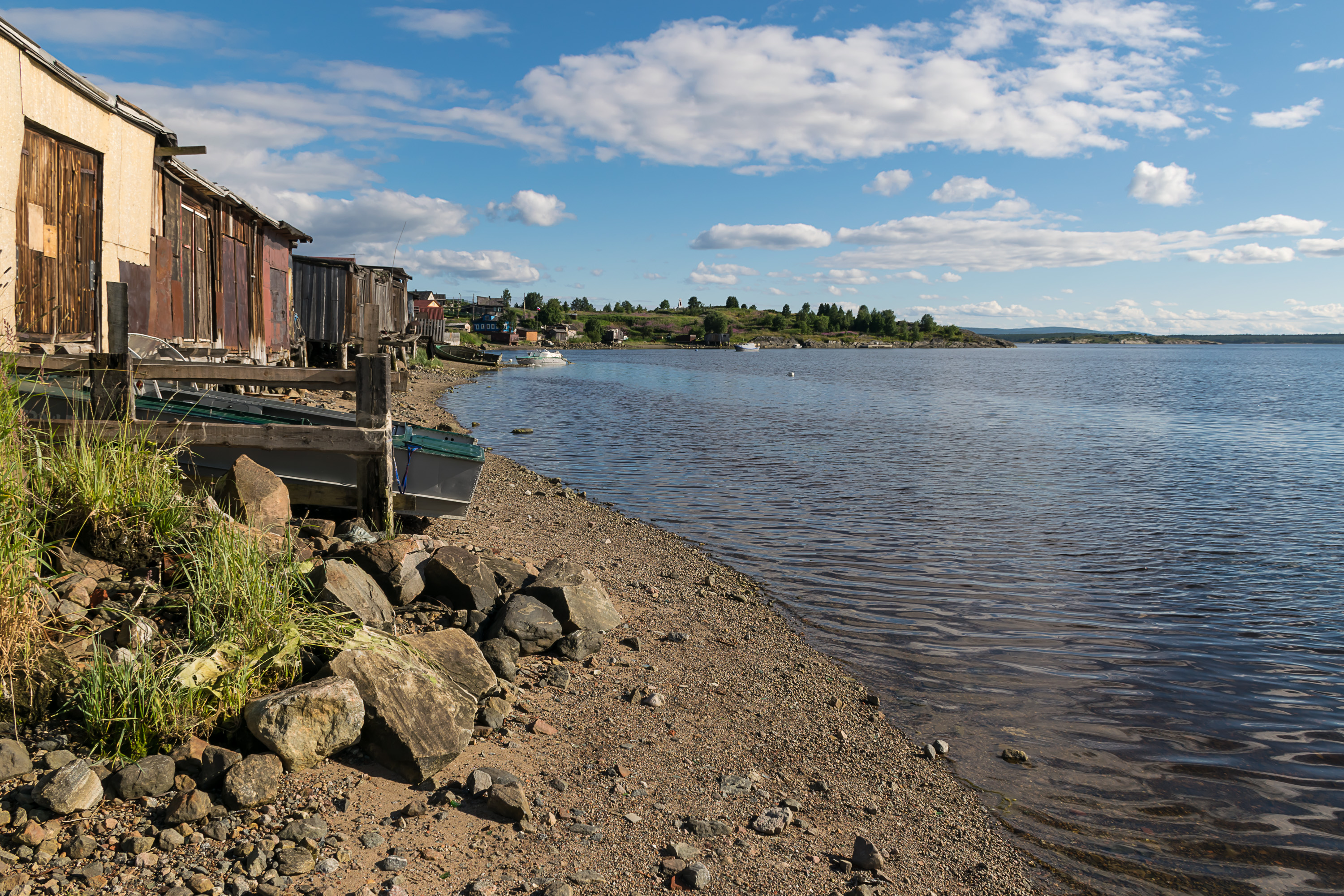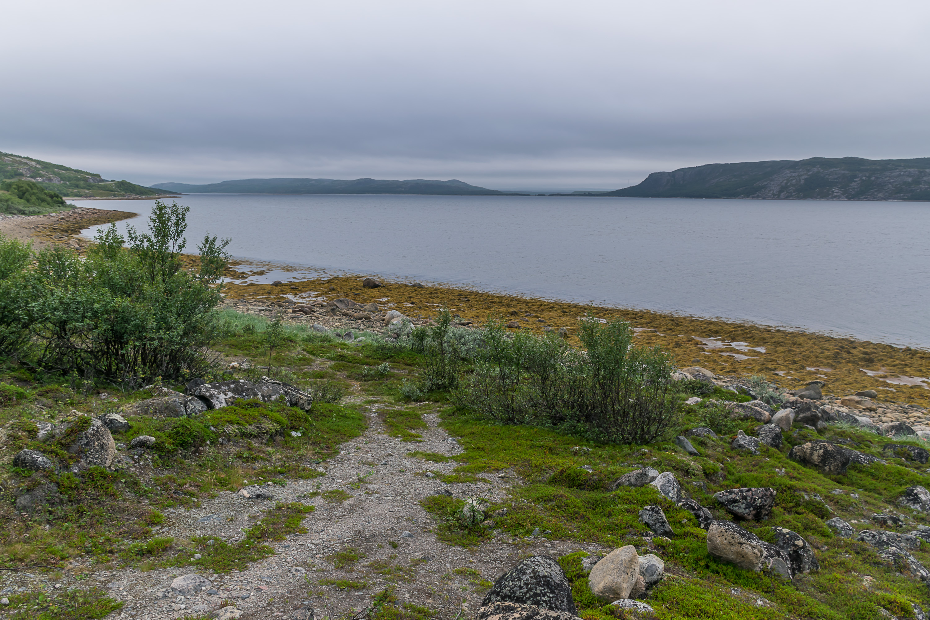 Кандалакша — это также порт на Белом море, и, конечно, мы не могли не попробовать посмотреть на море, которое никто из нас не видел раньше, и вряд ли еще увидит в обозримом будущем. Это оказалось непросто — весь город практически отрезан от моря железными дорогами, территорией порта и прочими промзонами. В конце концов мы нашли разбитую грунтовую дорожку, где народ шел на местный пляж, и, проехав по ней, сумели-таки полюбоваться маленьким заливчиком Белого моря.