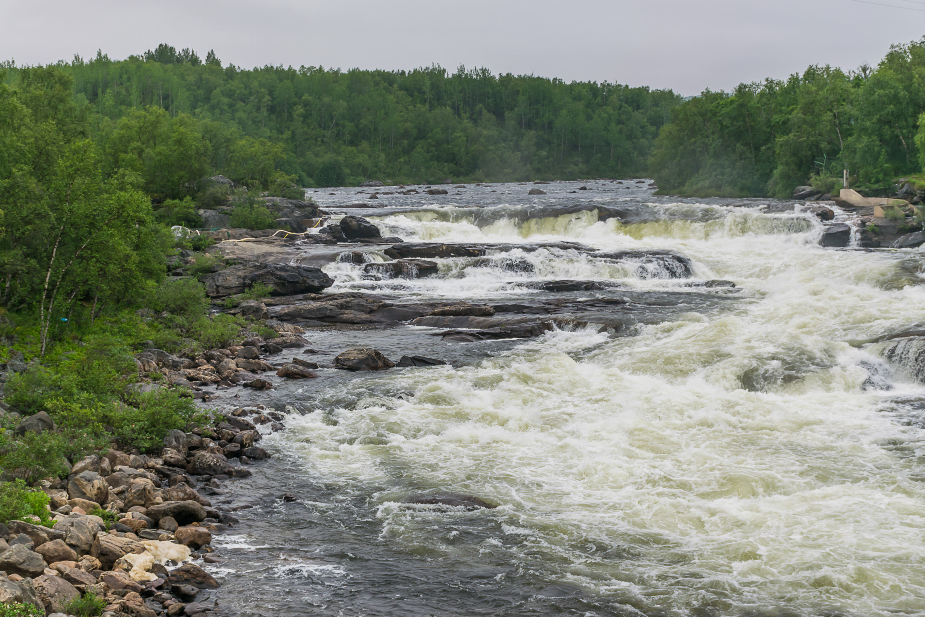 10. Значительная часть норвежско-российской границы проходит по реке Паз — Пасвикэльва (Pasvikelva) по-норвежски. Новежская сторона долины Пасвикэльвы (Пасвикдален, Pasvikdalen) образует 150-километровый клин между финской и российской территориями. Пейзажи здесь больше напоминают равнины Финской Лапландии (тупо бескрайние сосновые и еловые леса грубо говоря), по норвежским меркам — виды довольно скромные. Но так уж получилось, что наше первое место ночевки в Норвегии было именно в Пасвикдалене, в деревне Мелькефосс (Melkefoss, норв. Молочный водопад) у одноименной ГЭС, в приятном маленьком коттеджике. До него нам нужно было еще 60 км проехать по Пасвикдалену, но по крайней мере один (крошечный) фьордик по дороге уже увидели.