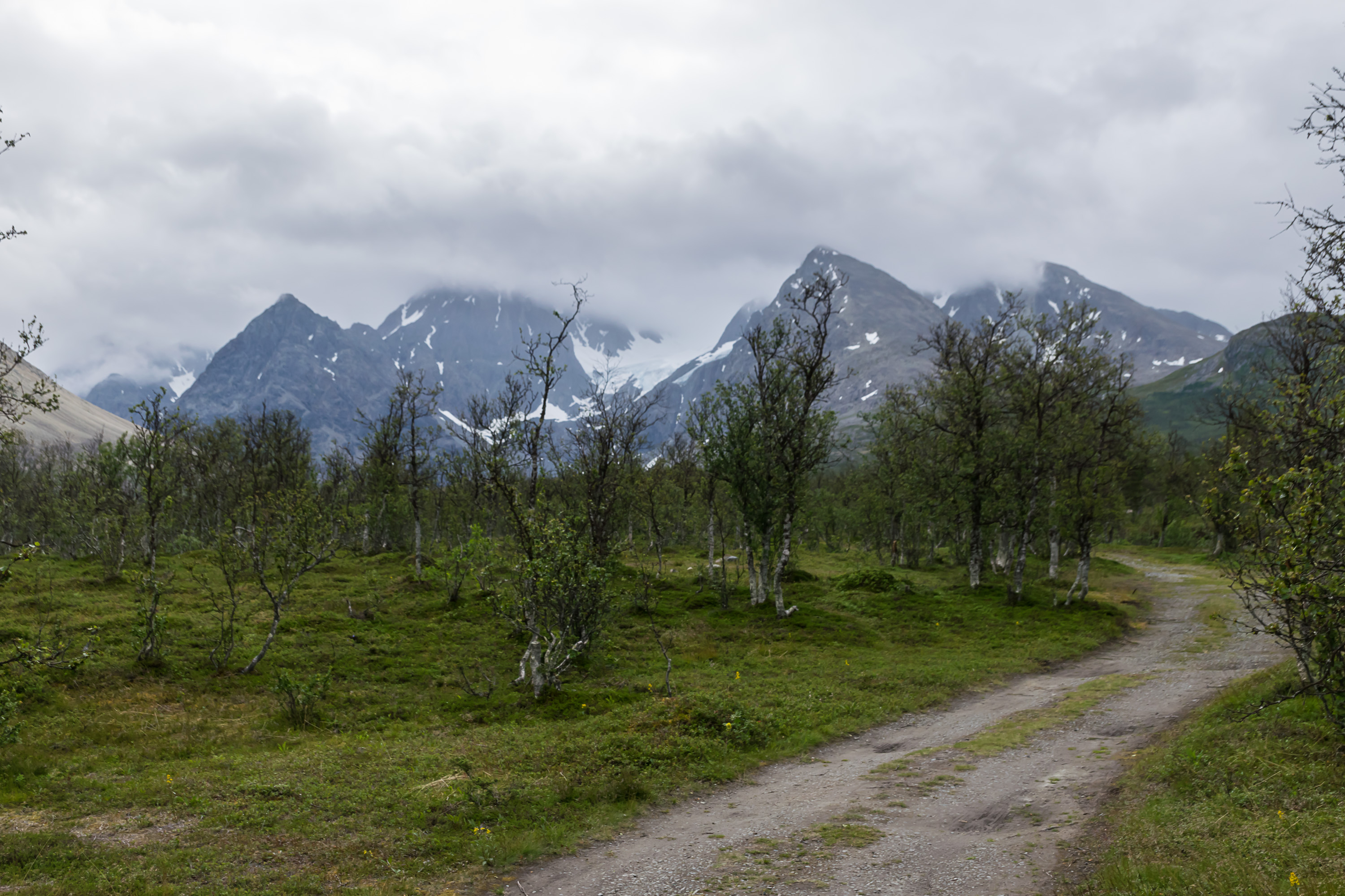 Мы получили ключ на таможне в пограничной деревне Килписъярви (Kilpisjärvi), и отправились на Трериксрёсет. Длина тропы — 11-12 км, она ведет через заповедик Малла (Malla). Сначала забирается на склон горы Малла, но не до конца; дальше идет горизонтально поперек склона, и потом снова спускается к озерам Куохкимаярви (Kuohkimajärvi) и Голддаяври (Golddajávri). Я тащил нам постельное белье и большую часть еды в рюкзаке, и на первоначальном подъеме в гору от стоянки мне что-то прямо поплохело, до такой степени, что я подумал уже было вернуться, забить и переночевать в первой попавшейся гостинице. Тем не менее, делать этого я все-таки не стал, и вскоре стало полегче.