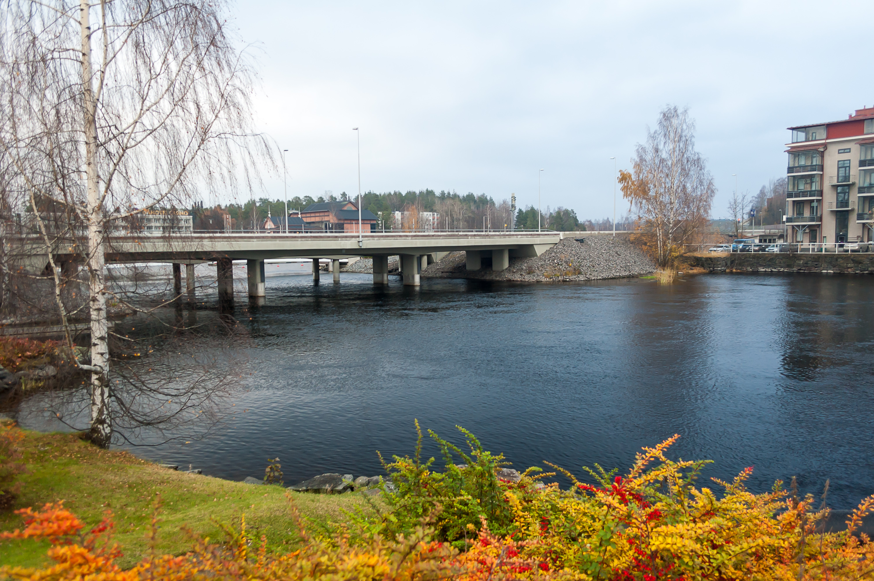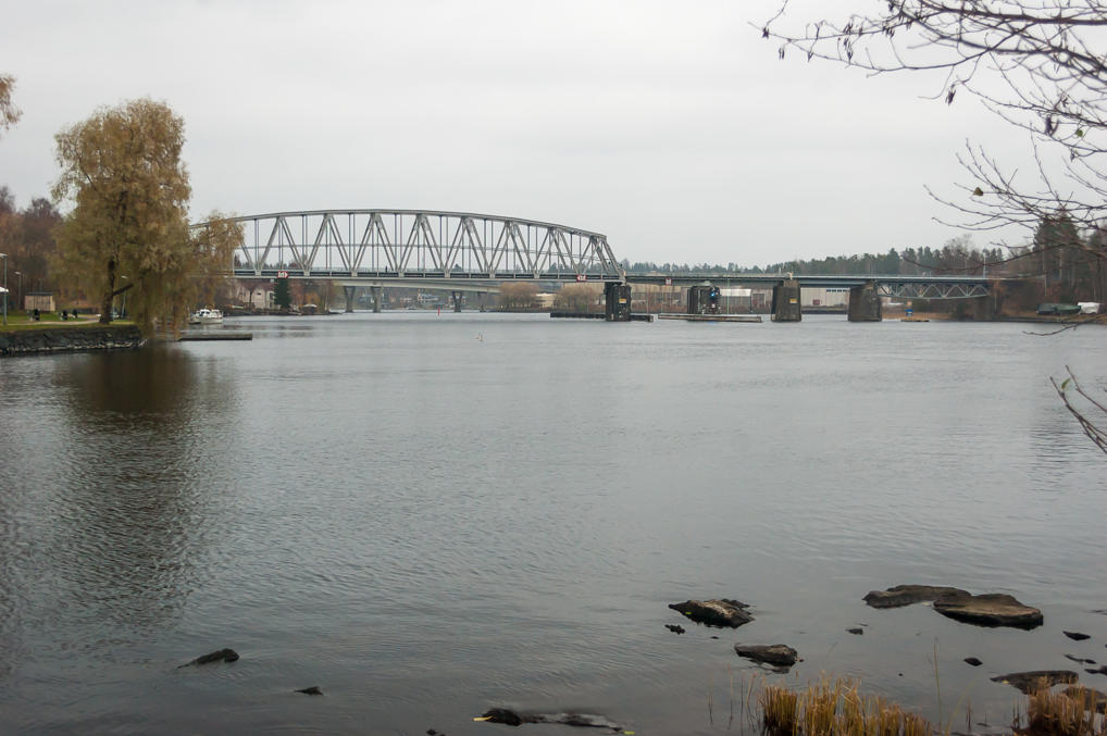 45. Автомобильный и желенодорожный мосты через пролив Кюрёнсалми, вид с Таллисаари. Пролив до сих пор является важным водным путем, поэтому оба моста — разводные. Железнодорожный, в частности, имеет несколько непривычную конструкцию, в нем секция моста (сразу справа от большой фермы) поворачивается в горизонтальной плоскости, а не поднимается.