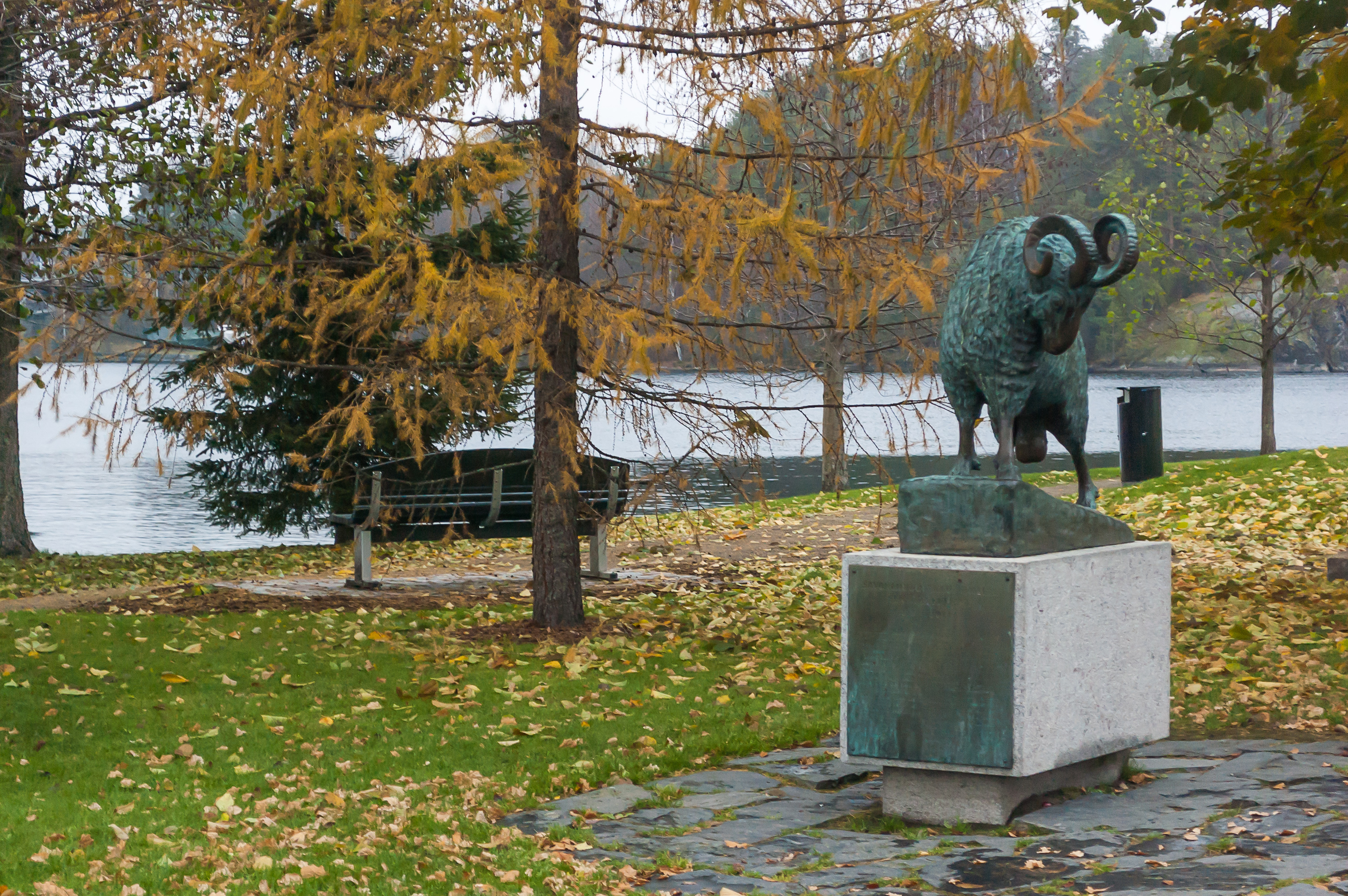 42. Памятник Черному Барану на Таллисаари. История тут такая. Баран, якобы, спас замок от русской осады в 1656 году. Во время осады началась гроза, и молния ударила в замок и подожгла запасы дегтя, хранившиеся (зачем-то) на его укреплениях. В это время по ним как раз бродил черный баран, в поисках чего бы пожрать, и он, естественно, до смерти перепугался из-за грозы и начавшегося бушующего пожара. Русские солдаты увидели огромного черного рогатого зверя, бегающего по замку на фоне пламени, и подумали, что это сатана или Бафомет или еще что, побросали оружие и убежали. Что в итоге стало с самим бараном, история умалчивает, так что, полагаю, защитники замка смогли отметить победу жареной баранинкой.