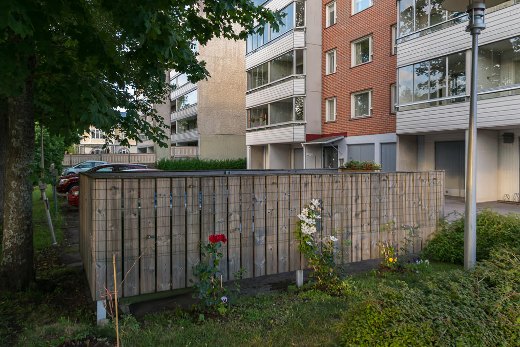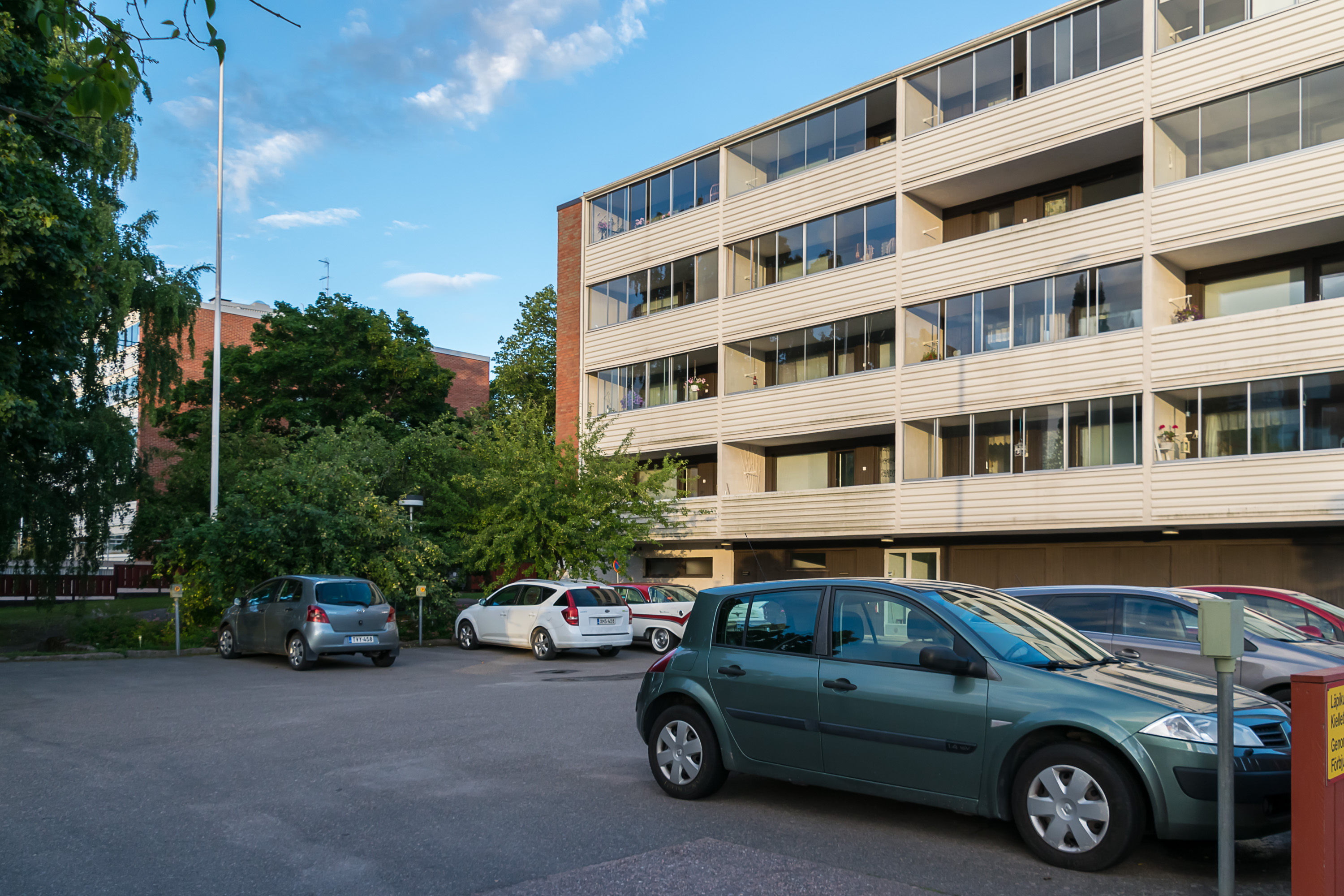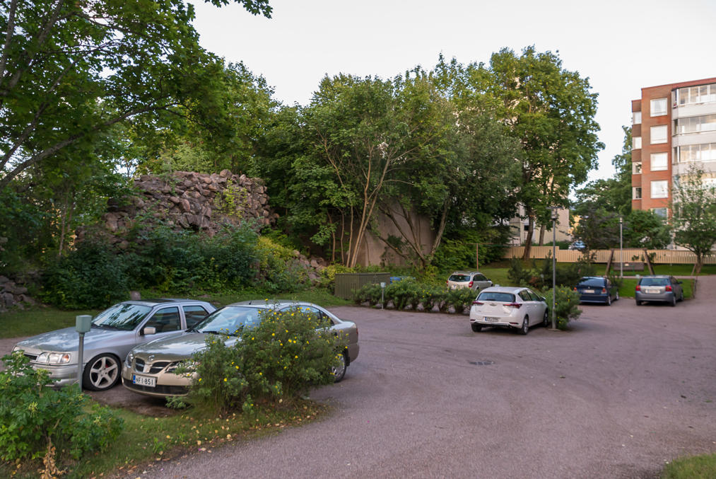 29. В финских многоэтажках (особенно поновее) часто бывают прекрасные зеленые дворики. Но не всегда. Тут вот мы имеем парковку прямо под окнами.
