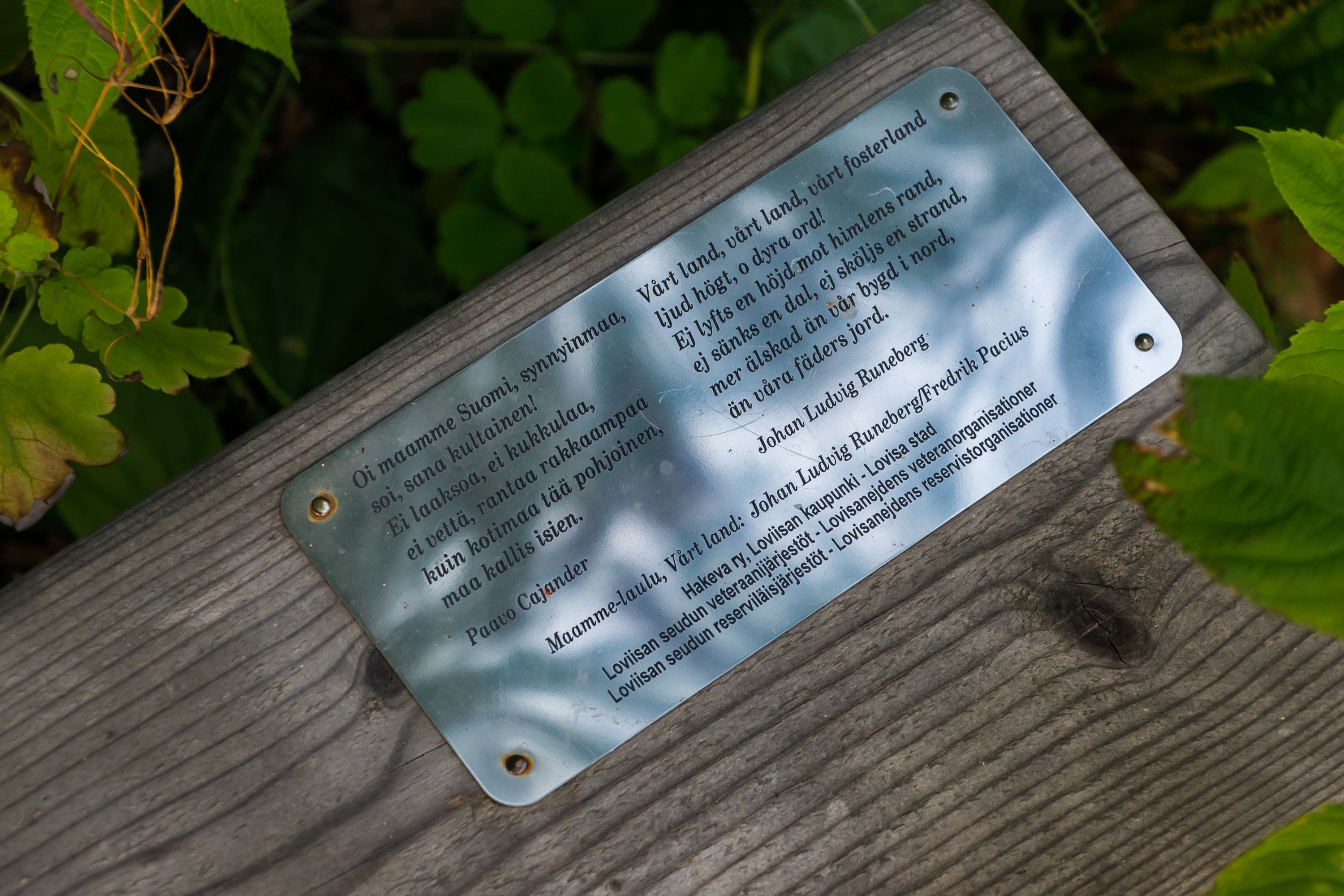 18. На каждой скамеечке на Мюллюхарью прикреплена пластинка с отрывками из знаменитых финских стихотворений и поэм. Это, например, "Наш край" (Maamme) Рунеберга, де-факто государственный гимн Финляндии (хотя в конституции и других официальных документах это не закреплено). Обожаю подобные детали.