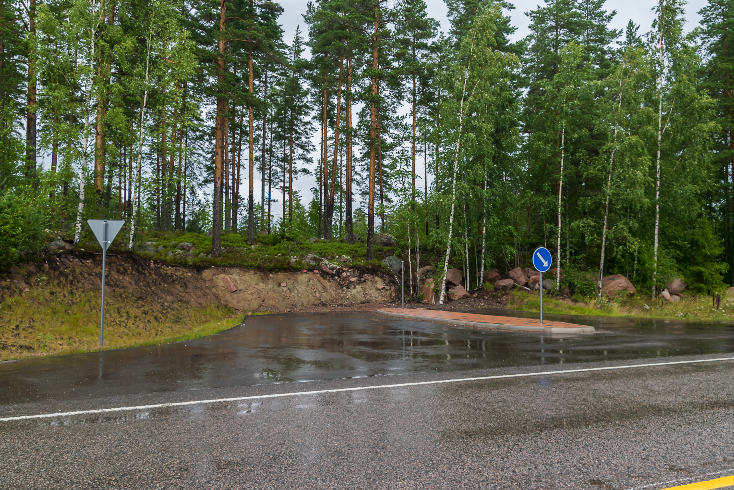 67. Последнее, что мне бросилось в глаза уже по дороге домой — несколько странных перекрестков на дороге между Ловийсой и съездом на главную Трассу 7, такого вот вида — идеально сделанный поворот в никуда, в непроходимый лес. Может, здесь будут новые городские кварталы строить на отшибе? Но в Финляндии вроде так не делают, чтоб такую нелепость заложить лишь для того, чтоб когда-нибудь в будущем что-то достроить. (В Питере я вот знаю такие же места, например.)