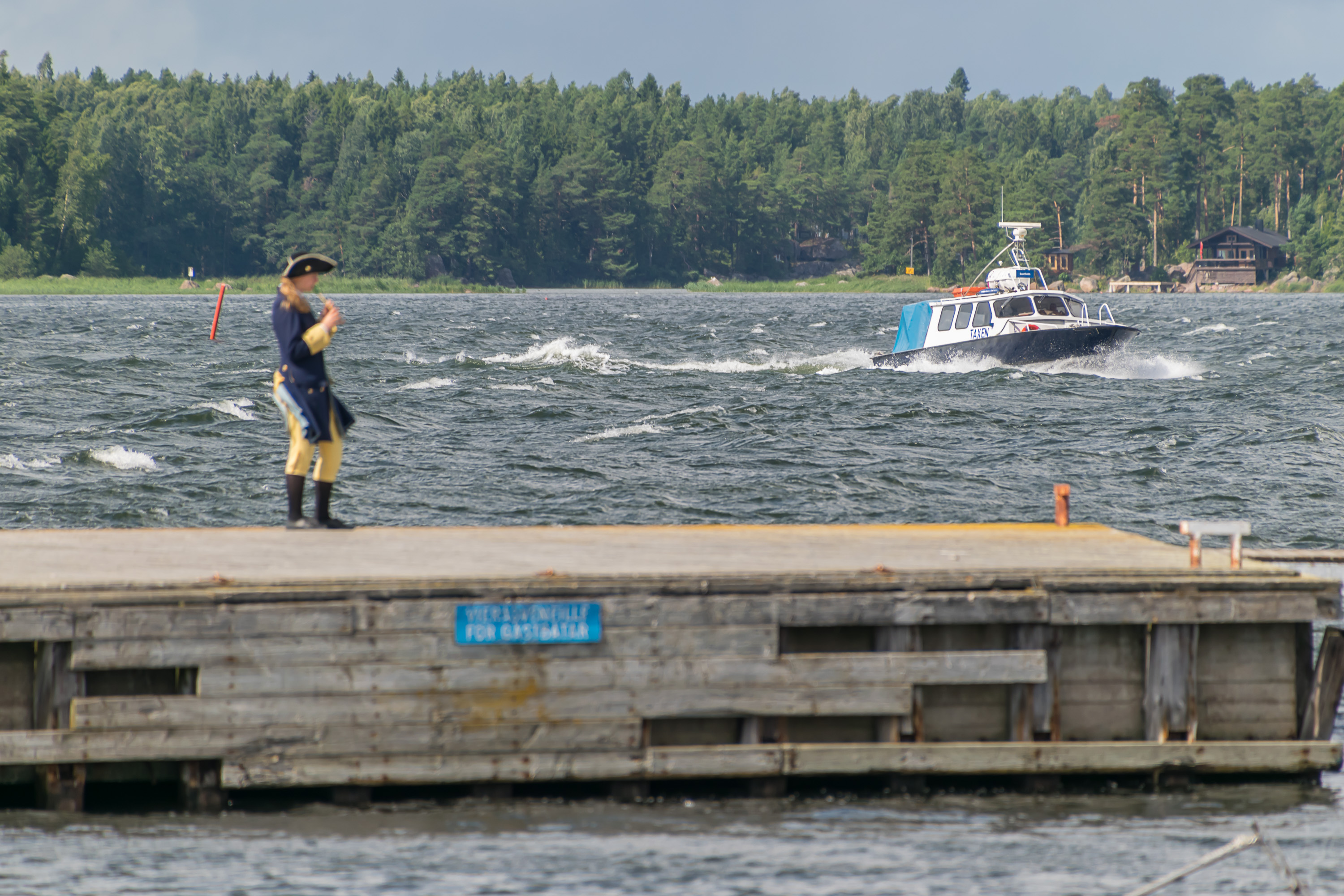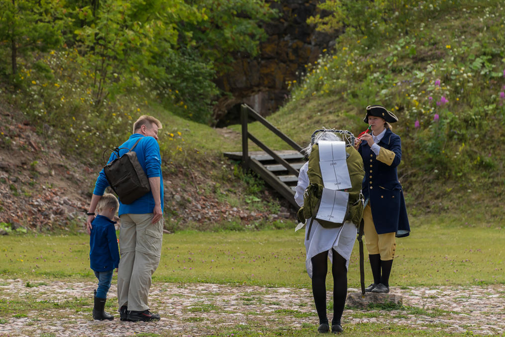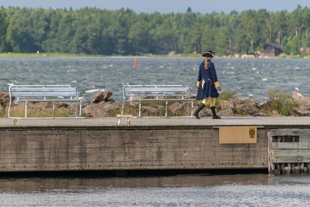 26. Женщина в старой шведской военной форме (форма каролинеров?) приветствует посетителей на пристани, и проводит экскурсии для детей, или скорее что-то типа небольших представлений, похоже. Не бесплатно, но вроде тоже недорого. Не знаю, кого изображает человек слева от нее. На рейсе катера вместе со мной был только один ребенок, так что все показывали ему одному.