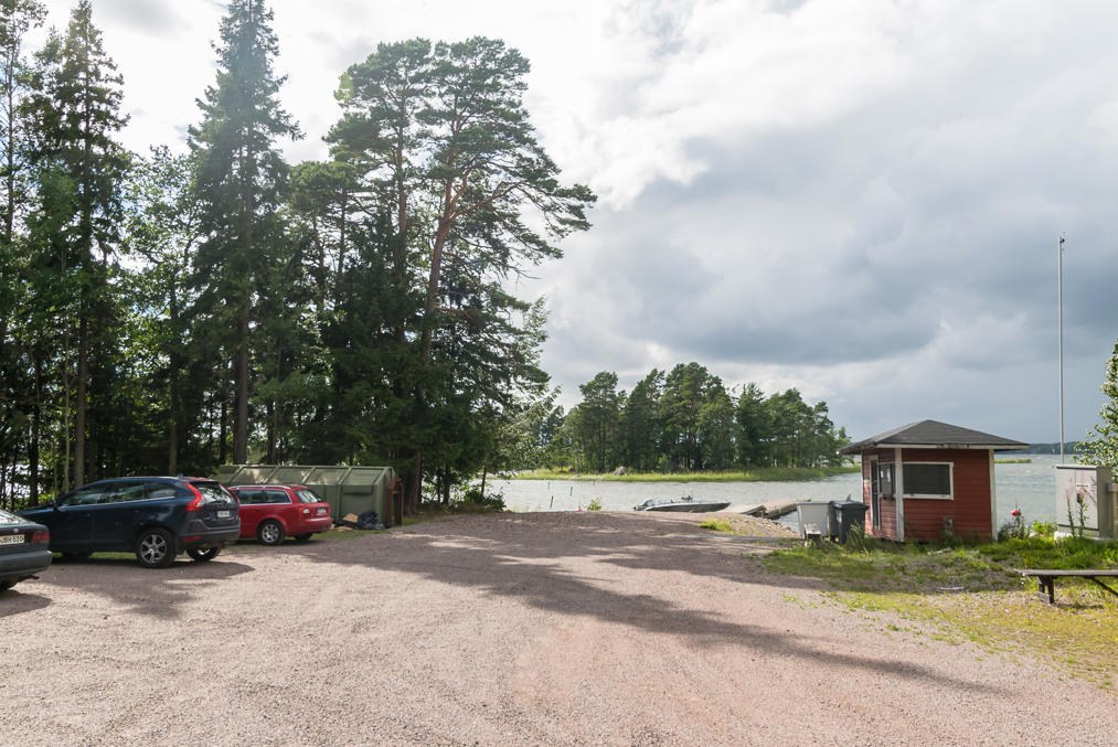 53. Позже этим днем (уже после дождя) я также решил попробовать сфотографировать Свартхольм с берега. По карте выяснил, что это должно было быть можно сделать с пристани в местечке под названием Кварнхольмен (Kvarnholmen, швед. Мельничный остров; на самом деле не остров) на восточном берегу залива Ловийсанлахти; оттуда до Свартхольма всего с полкилометра по прямой. Я приехал туда той же дорогой, что ведет на Ловийсскую АЭС. Своротка к пристани через лес так и подписана "Мустасаари" (это "Свартхольм" по-фински), а эта закрытая будочка на пристани очень напоминает билетную. Так что, может быть, раньше когда-то катера в Свартхольм ходили отсюда (или иногда ходят и сейчас?).