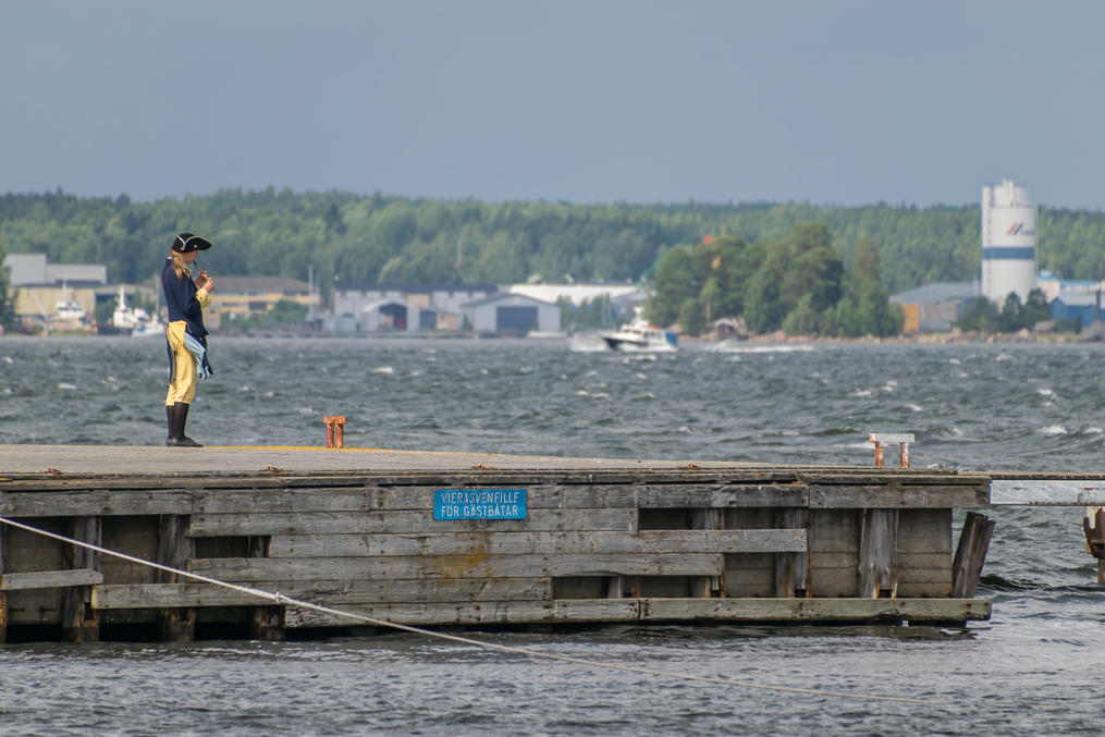 43. Женщина в каролинерской форме идет на пирс встречать следующий катер из Ловийсы. Интервал между ними — около полутора часов — как раз достаточно, чтобы от души нагуляться по крепости и понаслаждаться ветром и прочим. Если пойдете в ресторан или бухать на бастионах, тогда этого уже не хватит.