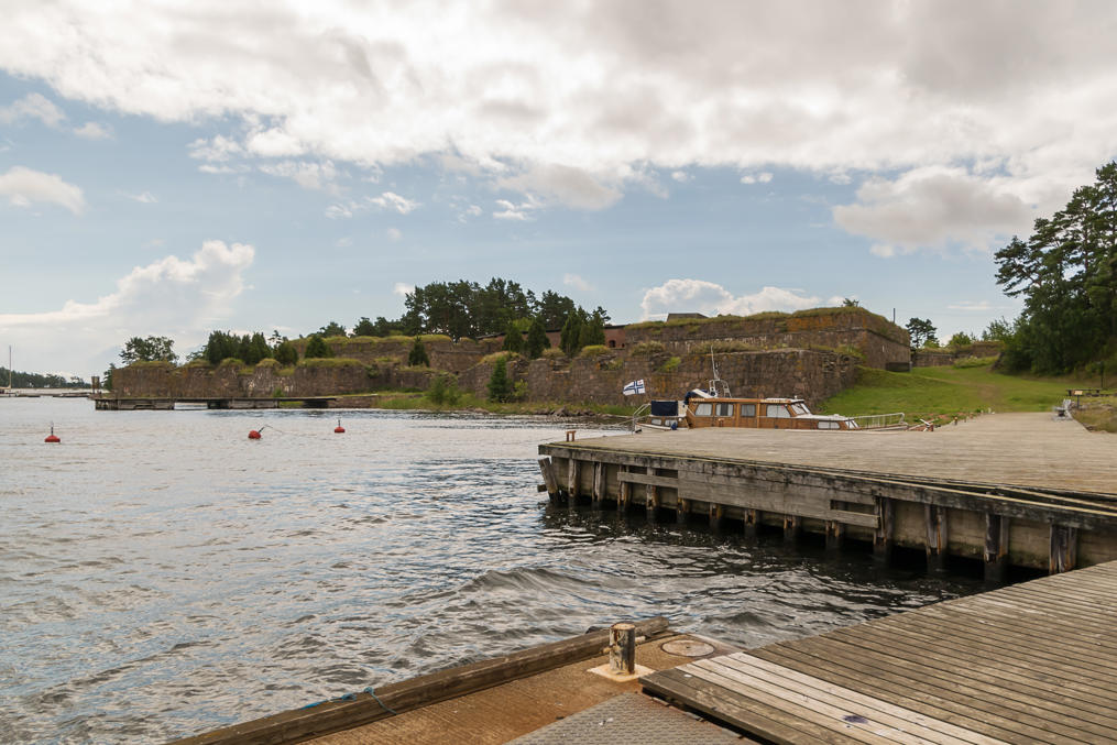 6. А вот и вид с причала. Свартхольм — типичная бастионная крепость 18 века, как, например, Суоменлинна или питерская Петропавловская крепость, так что она состоит из длинных и толстых, но низких стен, со множеством острых углов (бастионы), но без высоких строений, как в замках.