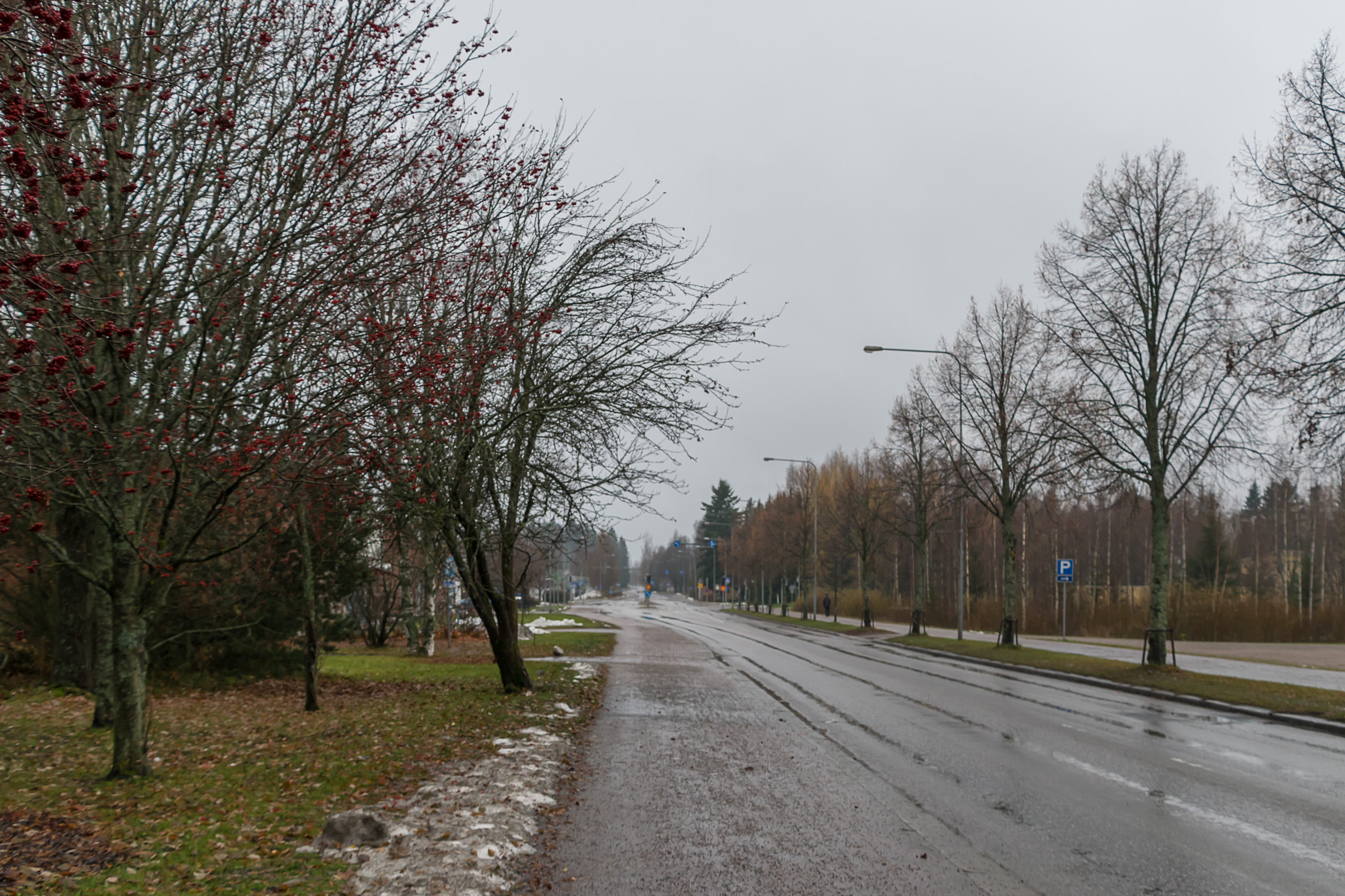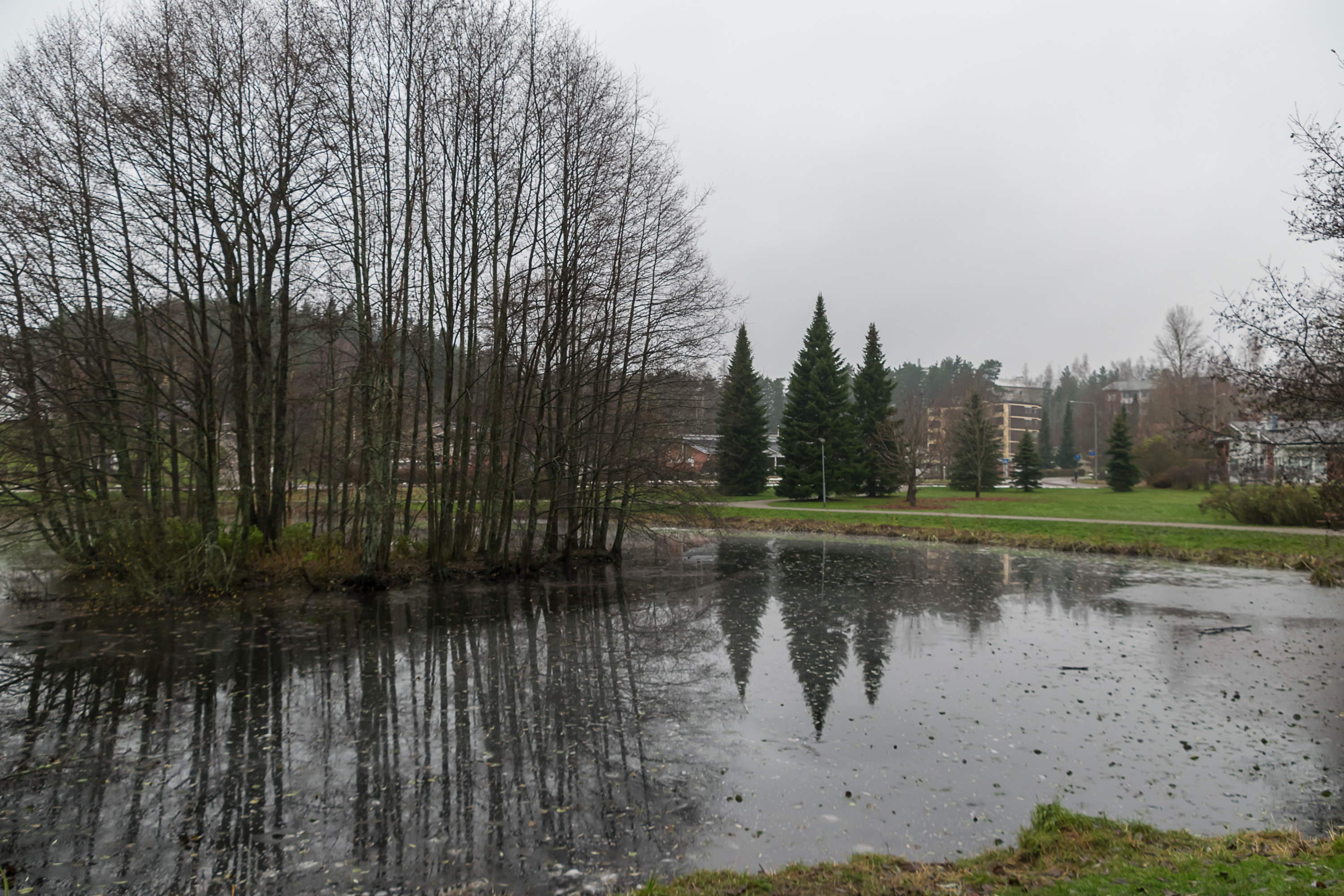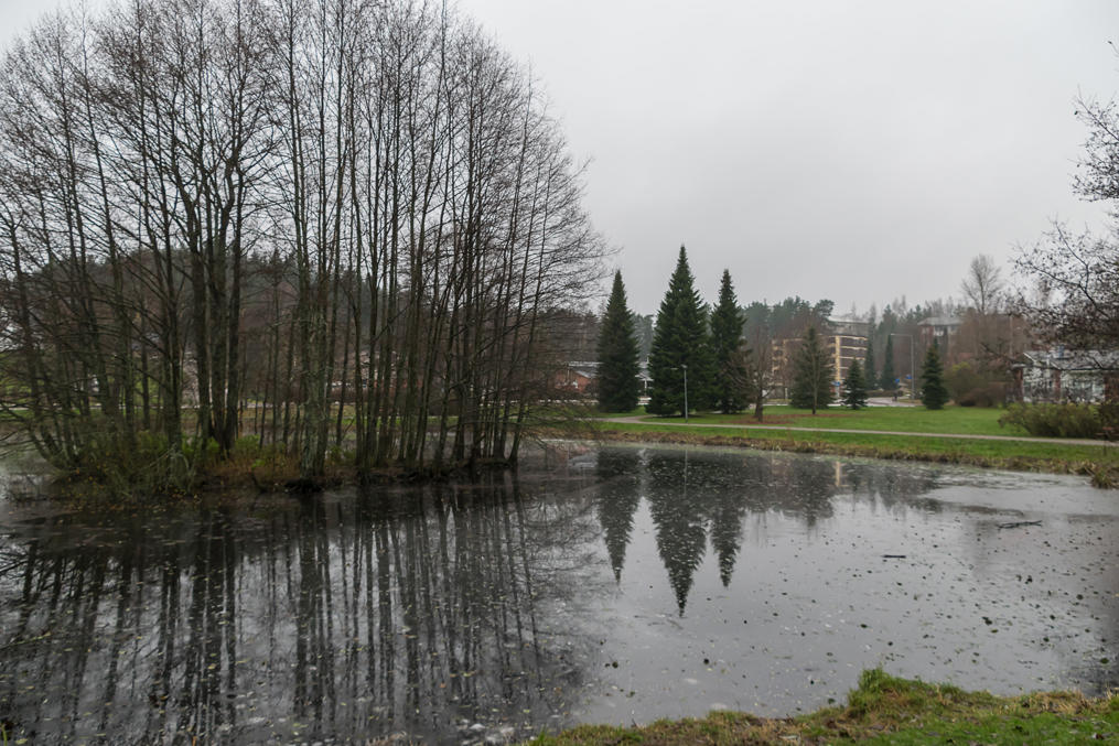 Ноябрь в Финляндии не очень любят. По-фински он называется marraskuu, что буквально означает "месяц смерти". Дни уже очень короткие, погода почти все время пасмурная, а снега еще нет — из-за чего и ночи еще темнее (снег-то хотя бы светлый), и для зимних видов спорта еще рано, и на улицах сыро и тоскливо. Так, по крайней мере, финны говорят. Лично мне ноябрь кажется куда как лучше ледяного февраля. И погода мне такая нравится. И мне не кажется, что так уж некрасиво — по крайней мере, краски еще не совсем исчезли.