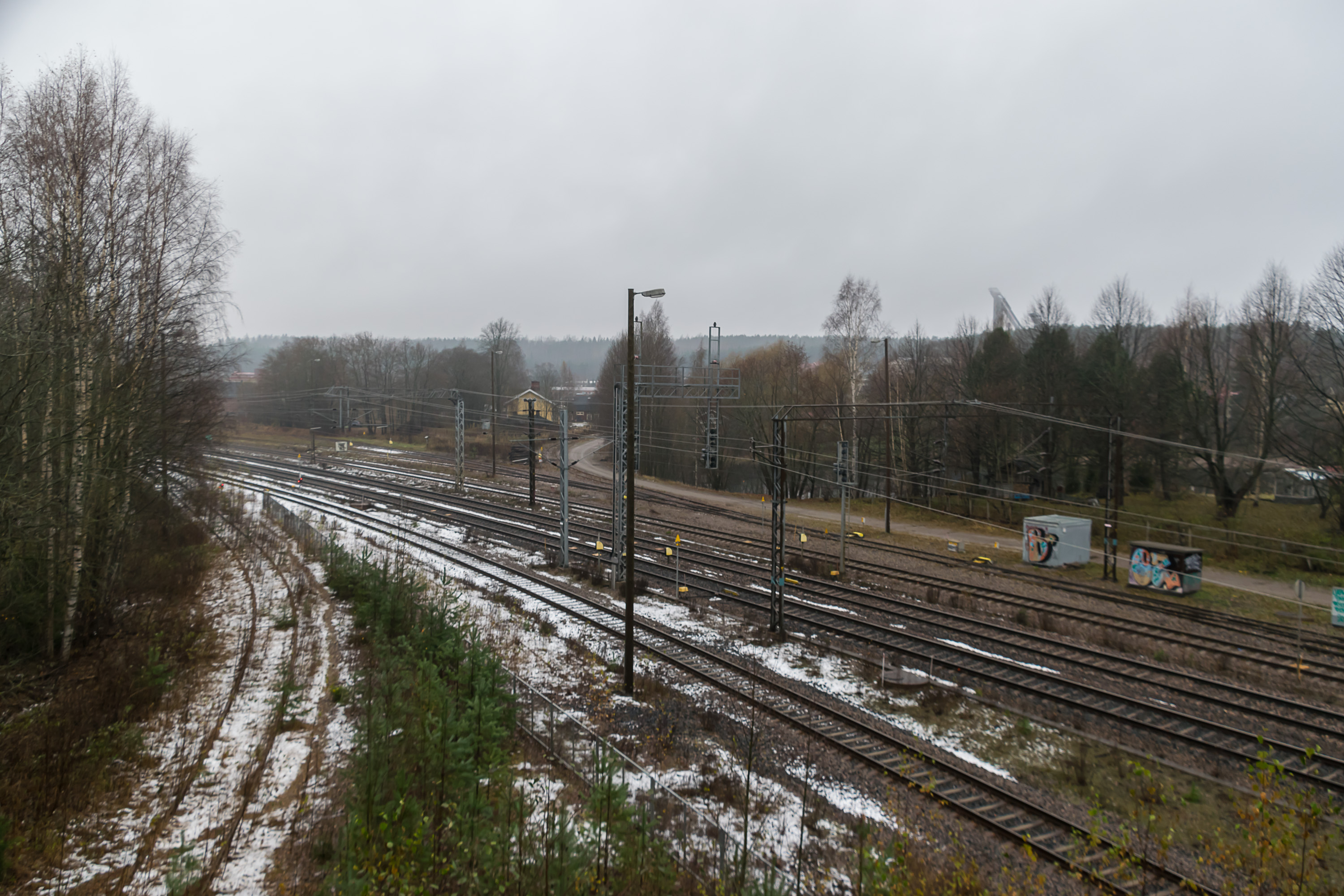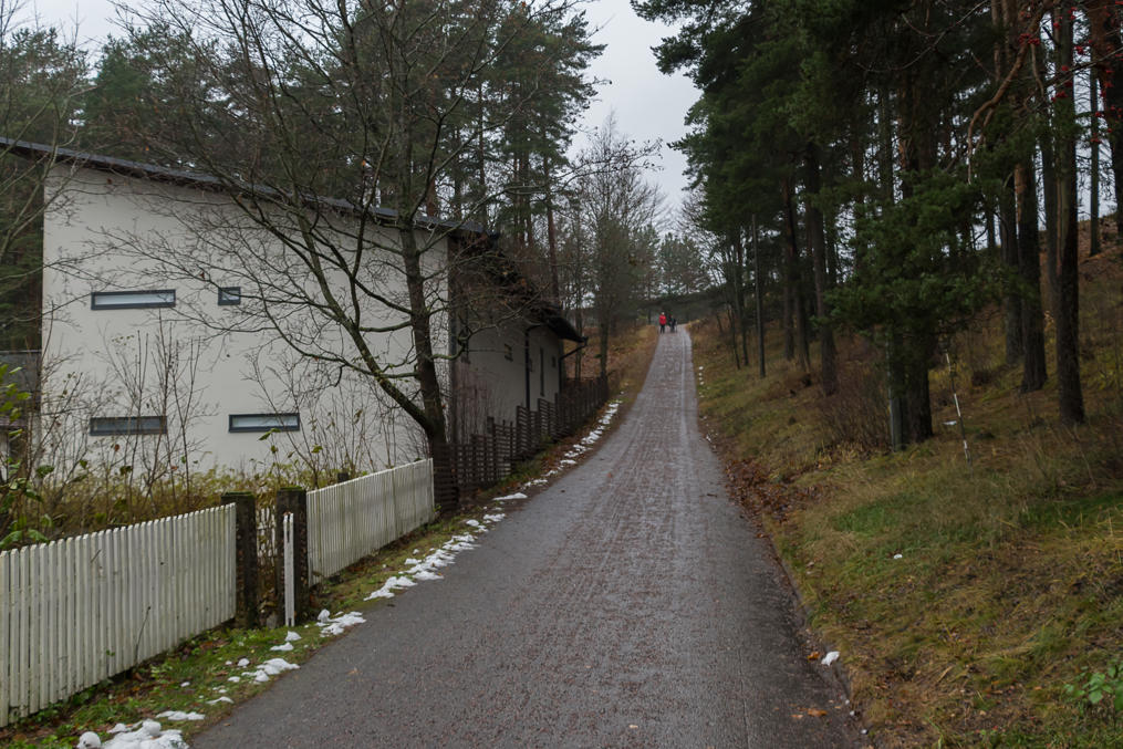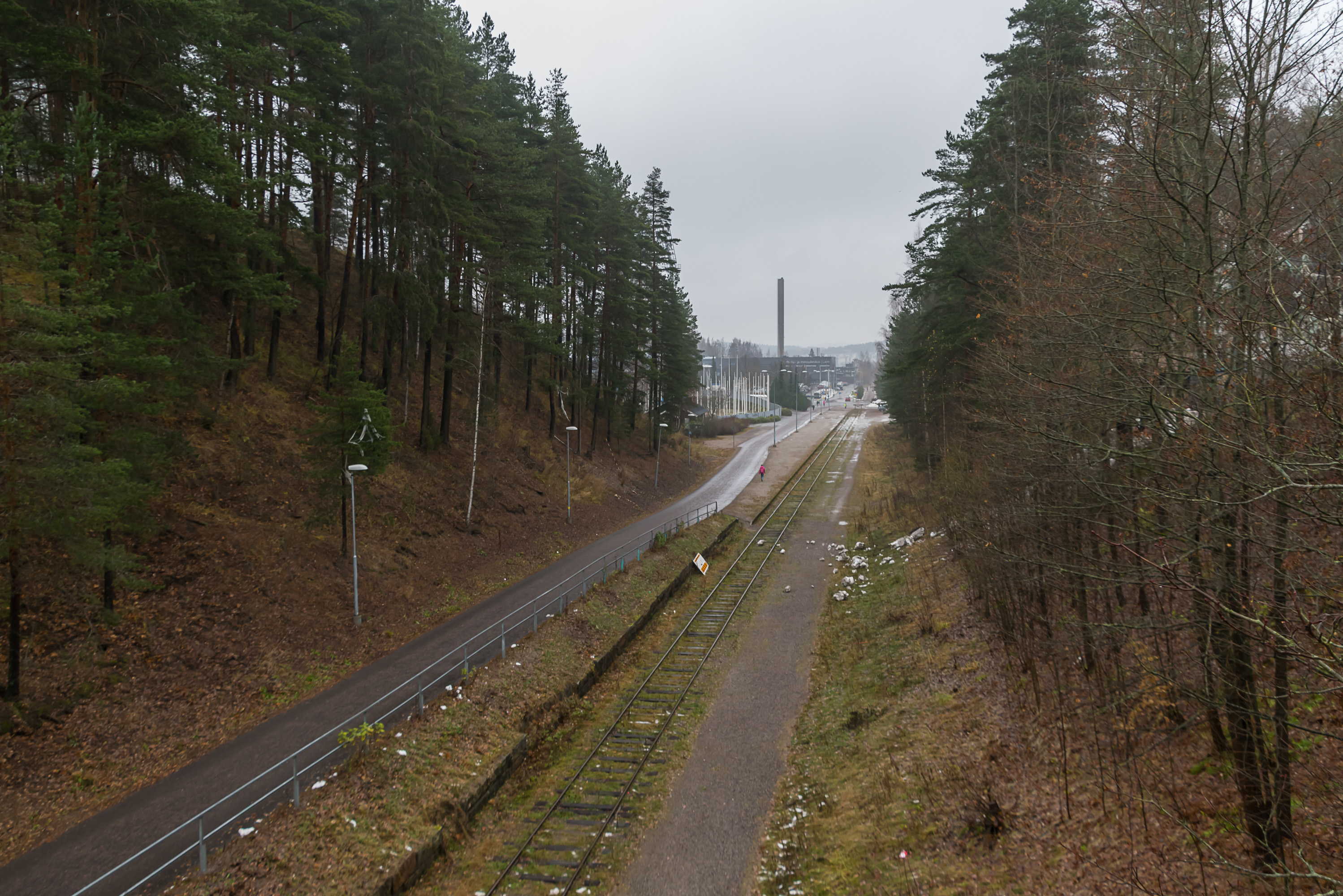 21. Подъездной путь при этом до сих пор поддерживается в проезжем состоянии до тупика у платформы Салпаусселькя (Salpausselkä). Когда-то здесь было регулярное пассажирское сообщение — очень давно (еще в 1950-е вроде бы); в наши дни за пределами столичного региона пригородных поездов в Финляндии не существует (хотя из Хельсинки они, с лета 2017, аж до самого Тампере сейчас идут). Сейчас сюда иногда заходят музейные поезда. По крайней мере в 2000-х были также специальные поезда, которые привозили участников Лыжных игр из Хельсинки напрямую на Салпаусселькя — спортивные сооружения здесь буквально за углом (как мы вскоре увидим). Кстати, дорожка вдоль пути названа в честь Вейкко Канкконена (Veikko Kankkonen), финского чемпиона по прыжкам на лыжах с трамплина, завоевавшего золотую медаль на Олимпиаде-1964.