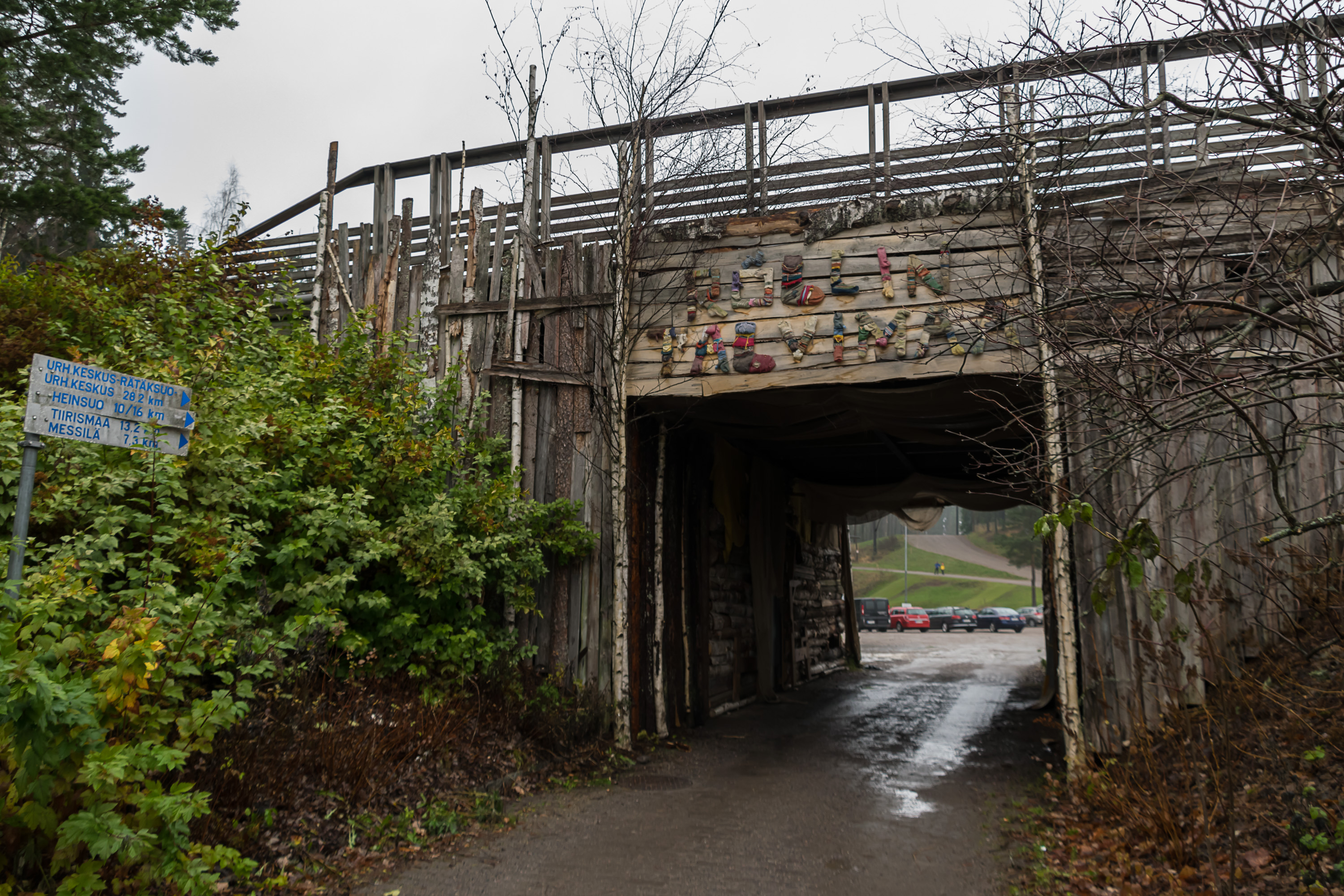 27.Проезд под лыжной трасосй. Над ним написано "Röllin talvimaa" — "Зимняя страна Рёлли". Рёлли-Тролль (Rölli-peikko, Рёлли-Пейкко) — персонаж популярных финских детских фильмов и телепередач. Он, собственно, тролль, который живет в лесу и не любит личную гигиену. В Финляндии он настолько известен, что в голосовании в 2006 году его выбрали лучшим финским вымышленным персонажем в истории — лучше, например, Муми-тролля, Вяйнямёйнена (из "Калевалы") и Рокки (из "Неизвестного солдата"). По-видимому, зимой в течение соревнований тут для детей открываются какие-то аттракционы.