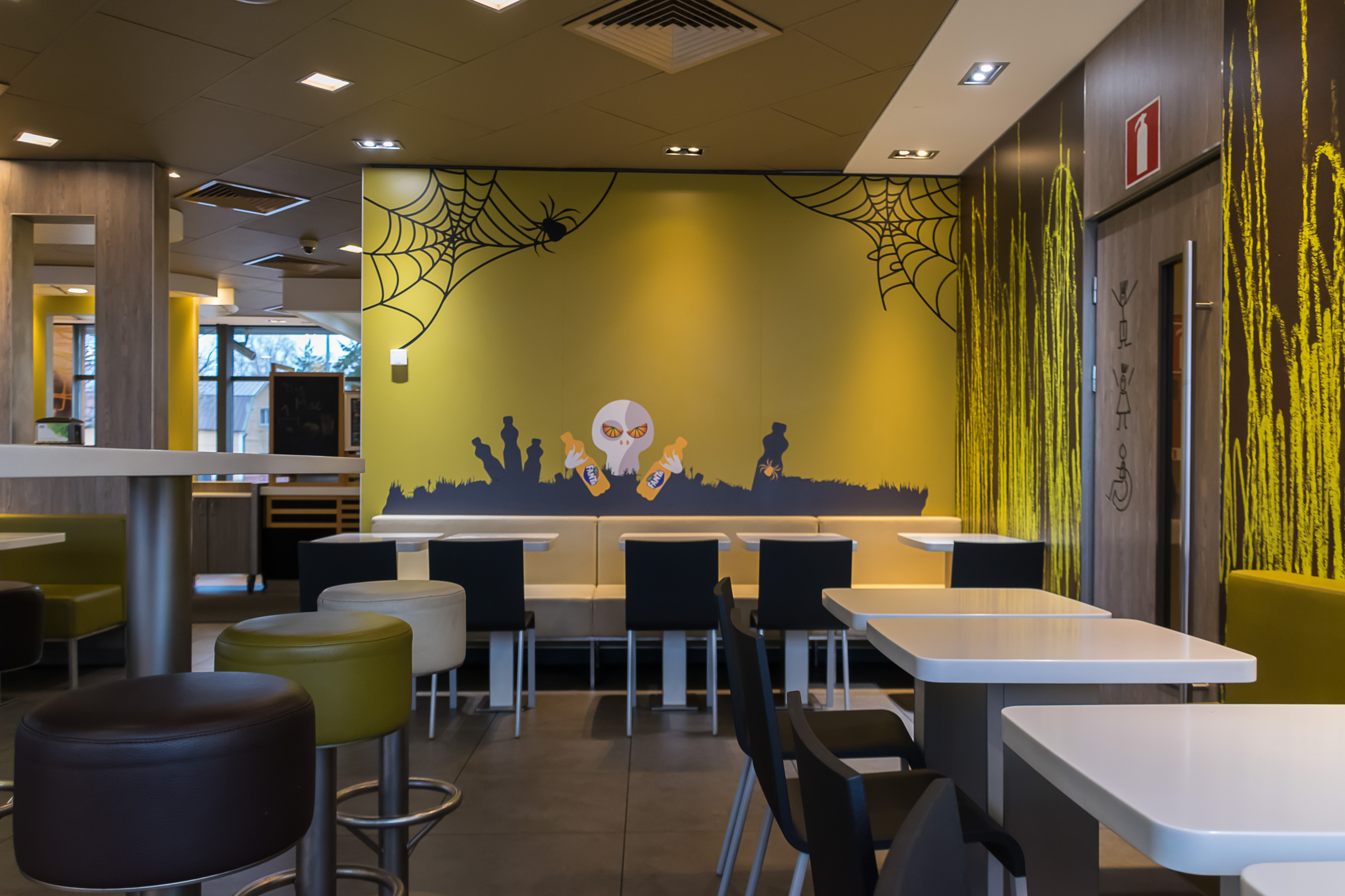 Интерьеры Макдака были все еще украшены к Хэллоуину (как и многие магазины в центре на самом деле). Что забавней, тут еще и саундтрек был хэллоуинский — обычная попса периодически перемежалась трекам как будто из фильма ужасов (а еще симфония Баха была среди прочего).