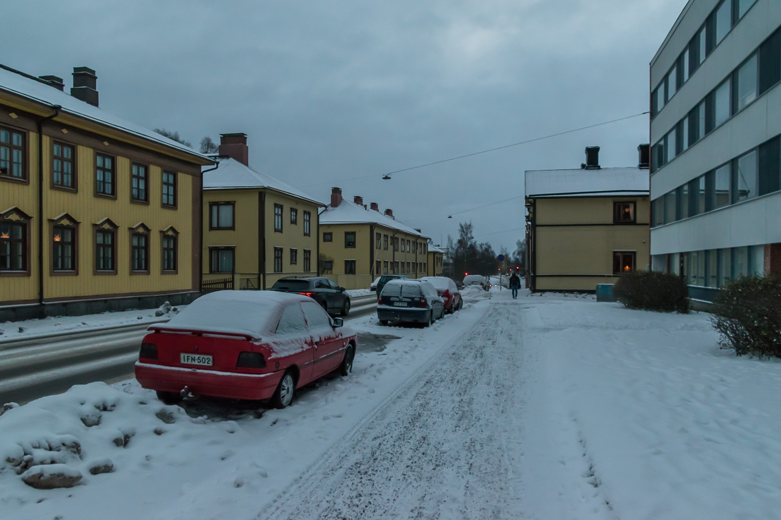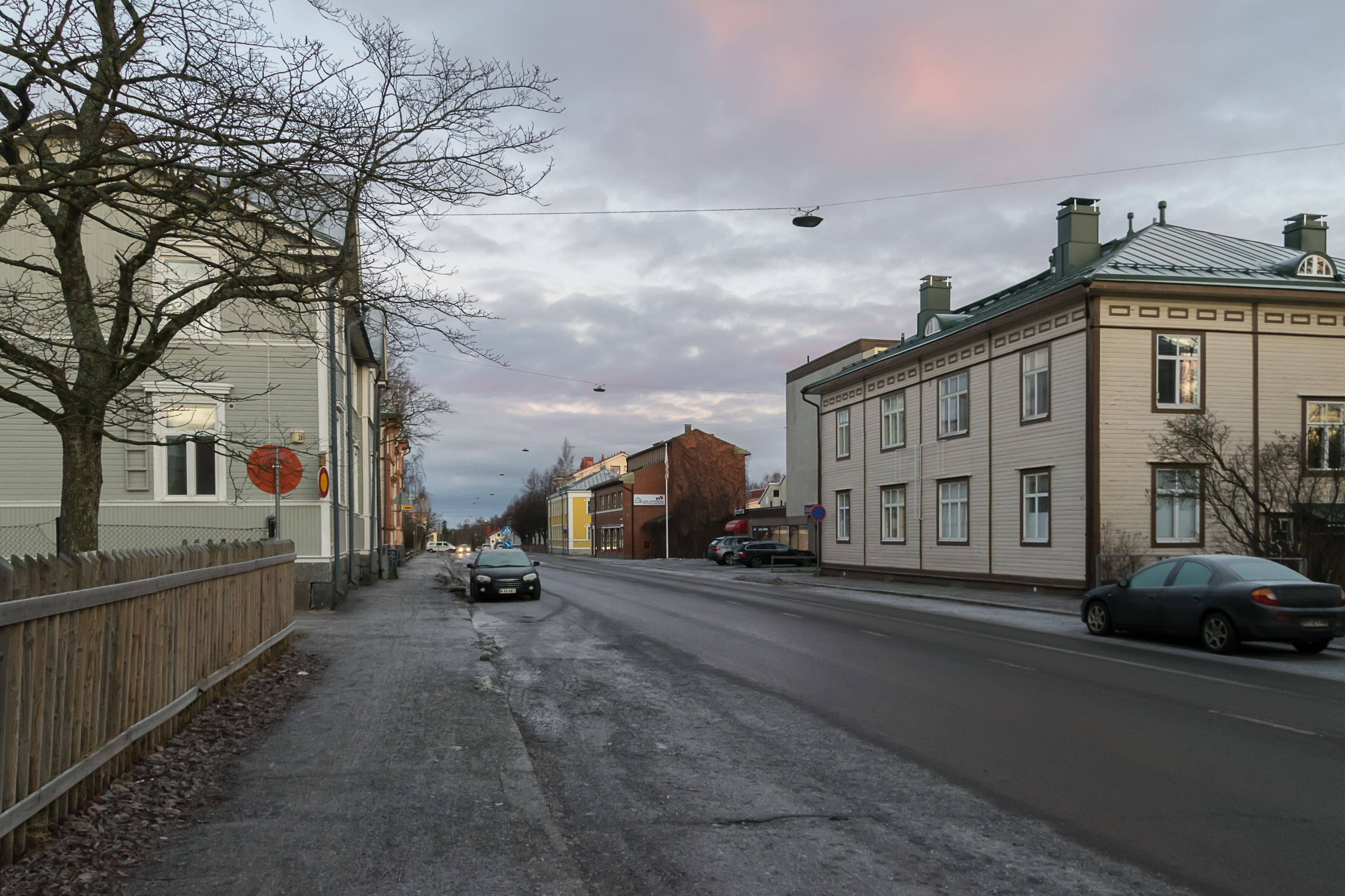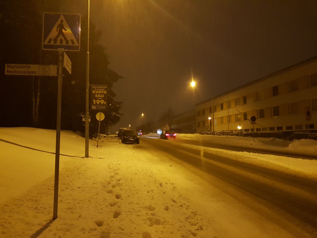 Финляндия — страна достаточно протяженная, и климат в разных ее частях существенно отличается. Есть где похолоднее, есть где потеплее, а в Ваасе, собственно, очень похож на привычный питерский (только солнца больше — у Ваасы раньше был слоган "самый солнечный город Финляндии"). Типичные варианты погоды зимой — "+2, все тает и течет", "–2, валят тонны снега" и "–4, все подмерзло", на фото последний — в начале зимы, до больших снегопадов. Имеющие транзитное значение улицы, как та, что на фото, в гололед слегка обрабатывают реагентом, но очень скупо, грязи не образуется.