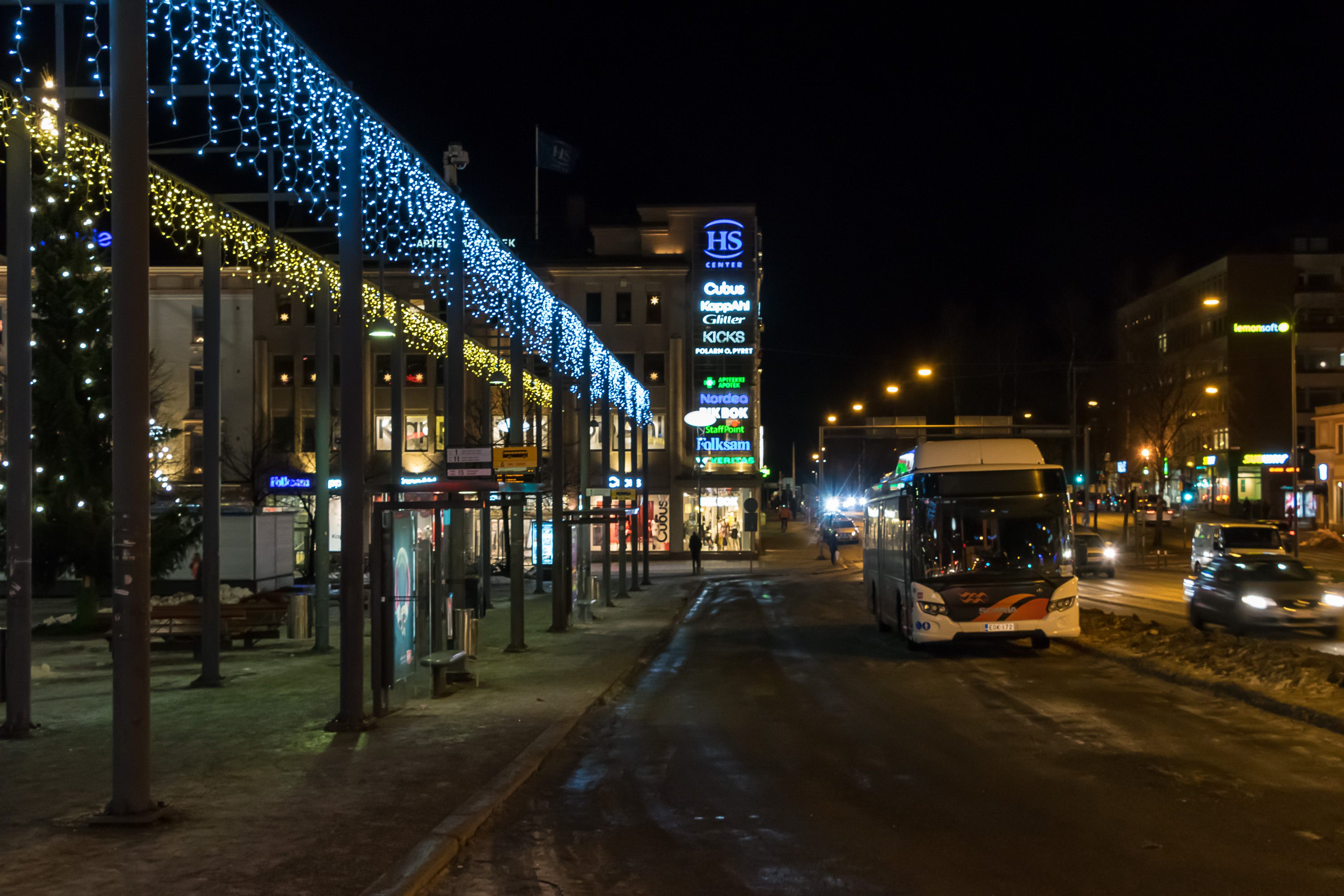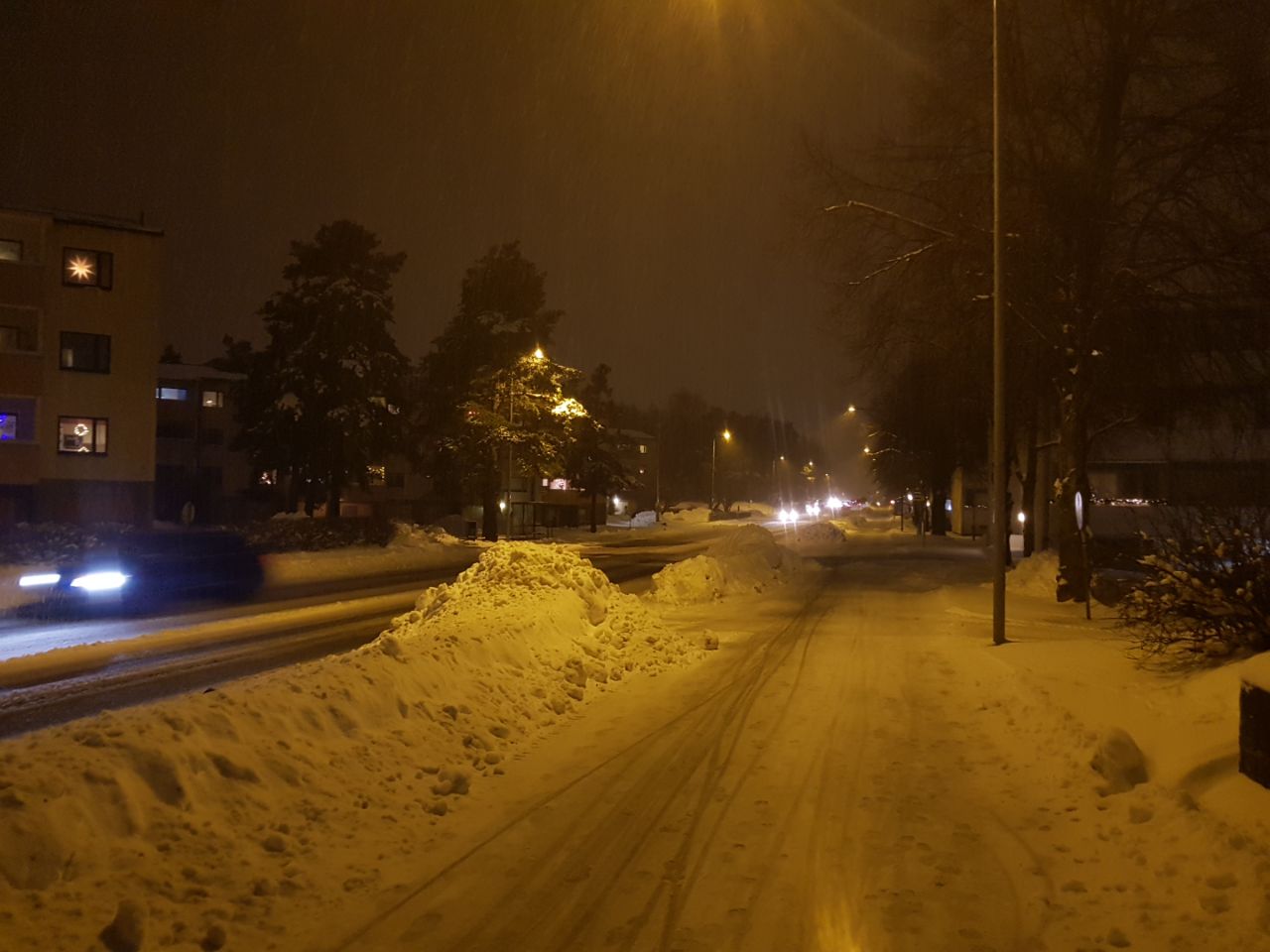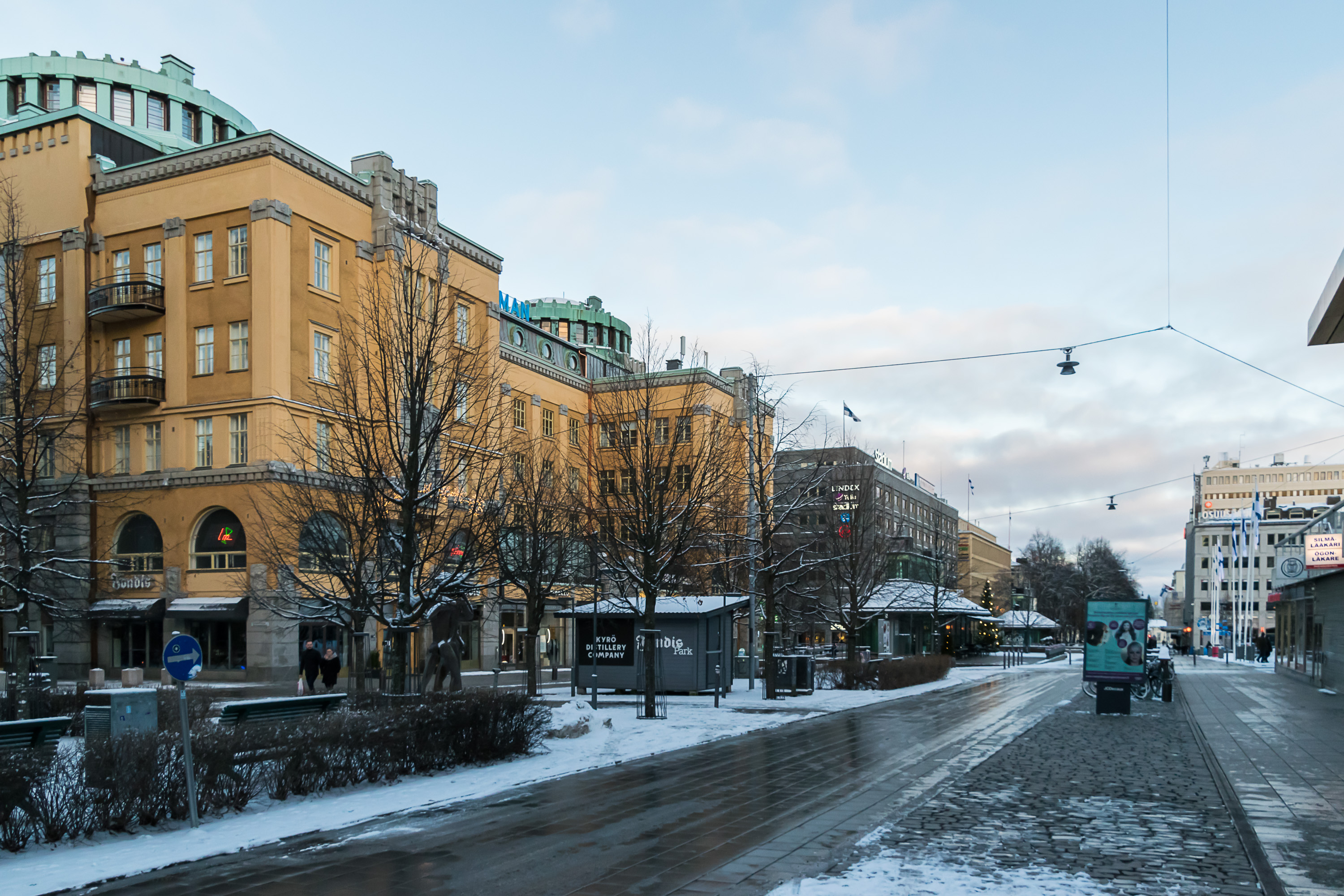 Финляндия — страна достаточно протяженная, и климат в разных ее частях существенно отличается. Есть где похолоднее, есть где потеплее, а в Ваасе, собственно, очень похож на привычный питерский (только солнца больше — у Ваасы раньше был слоган "самый солнечный город Финляндии"). Типичные варианты погоды зимой — "+2, все тает и течет", "–2, валят тонны снега" и "–4, все подмерзло", на фото последний — в начале зимы, до больших снегопадов. Имеющие транзитное значение улицы, как та, что на фото, в гололед слегка обрабатывают реагентом, но очень скупо, грязи не образуется.