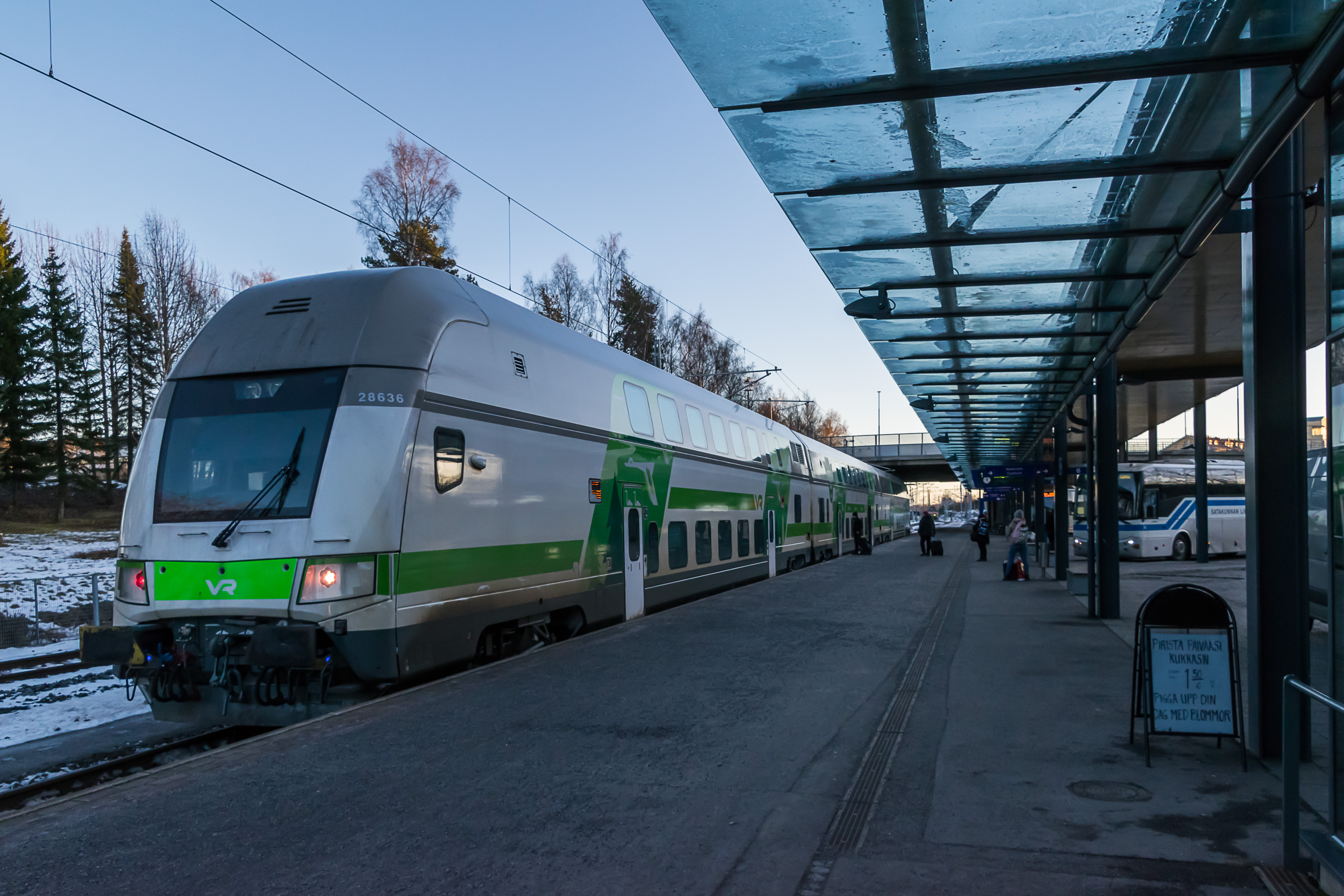 В Ваасе есть железная дорога и пассажирское сообщение. Но не пригородное — пригородное в Финляндии существует только в столичном регионе. Этот поезд из трех вагонов несколько раз в день ходит в город Сейняйоки — ближайший к Ваасе город сходного размера, в 80 км, чуть меньше часа в пути. У Ваасы с Сейняйоки достаточно тесные связи (хотя ваасанцы считают сейняйокцев деревенщиной, а сейняйокцы ваасанцев — напыщенными шведскими буржуями), есть даже люди, которые ездят между этими городами на работу; и поезд тоже очень популярен. В Сейняйоки также можно пересесть на поезда в сторону Оулу, либо Тампере и Хельсинки. Поезда нередко опаздывают (пунктуальность РЖД мало кто ценит, а это не так уж часто встречается в мире), но если есть официальная согласованная пересадка, то второй поезд будет дожидаться. Есть и прямые поезда из Ваасы в Хельсинки — 3.5 часов в пути. Почти все они типа Интерсити, как на фото, двухэтажные сидячие; только один в день Пендолино, очень похожий на поезд "Аллегро" СПб–Хельсинки. Все поезда с розетками, Wi–Fi, и которые не час идут, а побольше — с вагоном–рестораном. (Спальные поезда ходят только в Лапландию, на других маршрутах расстояния недостаточно большие.) В Питер в целом 8–9 часов занимает дорога на финских поездах + "Аллегро". Что, конечно, все равно лучше, чем 700 км ехать на машине.