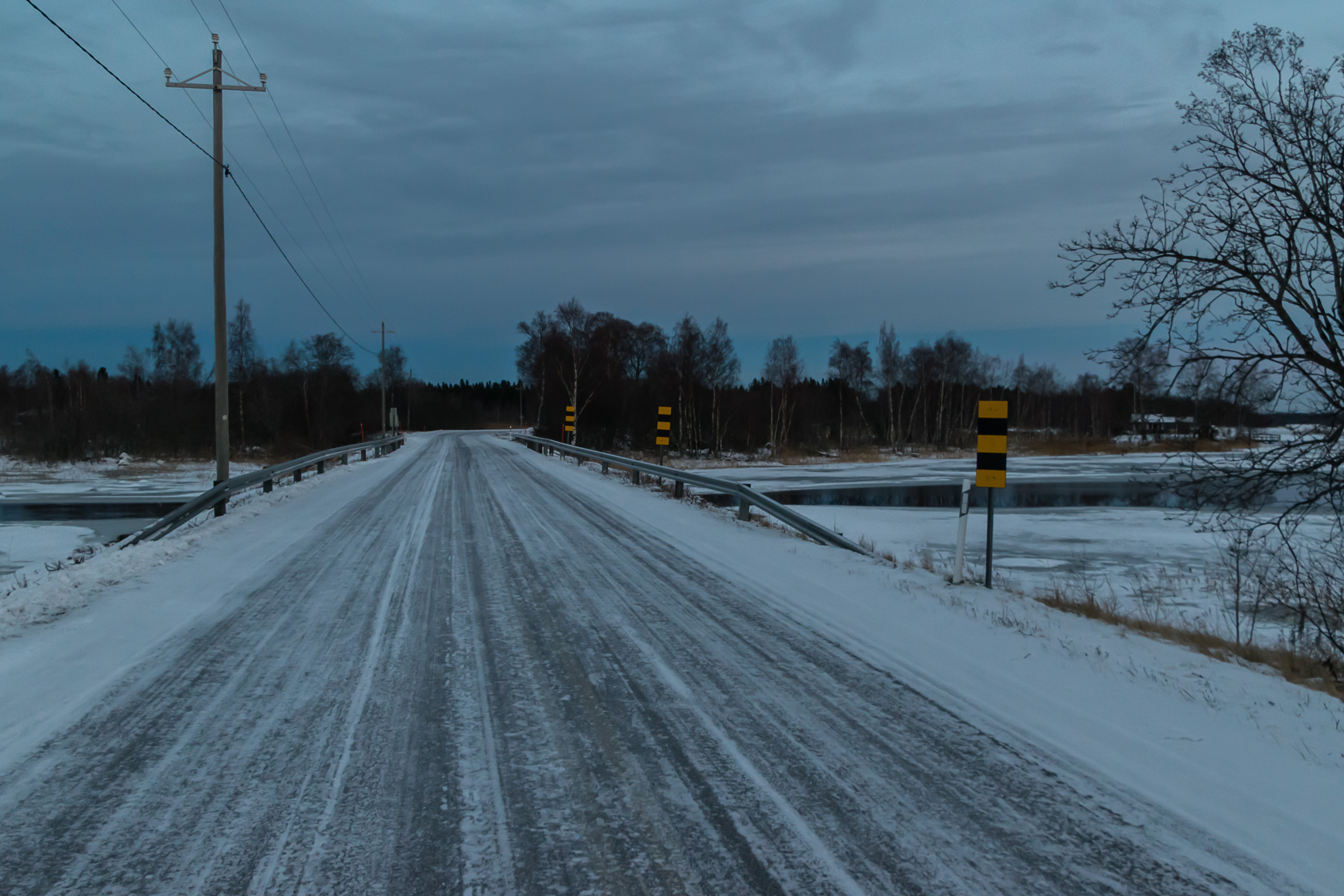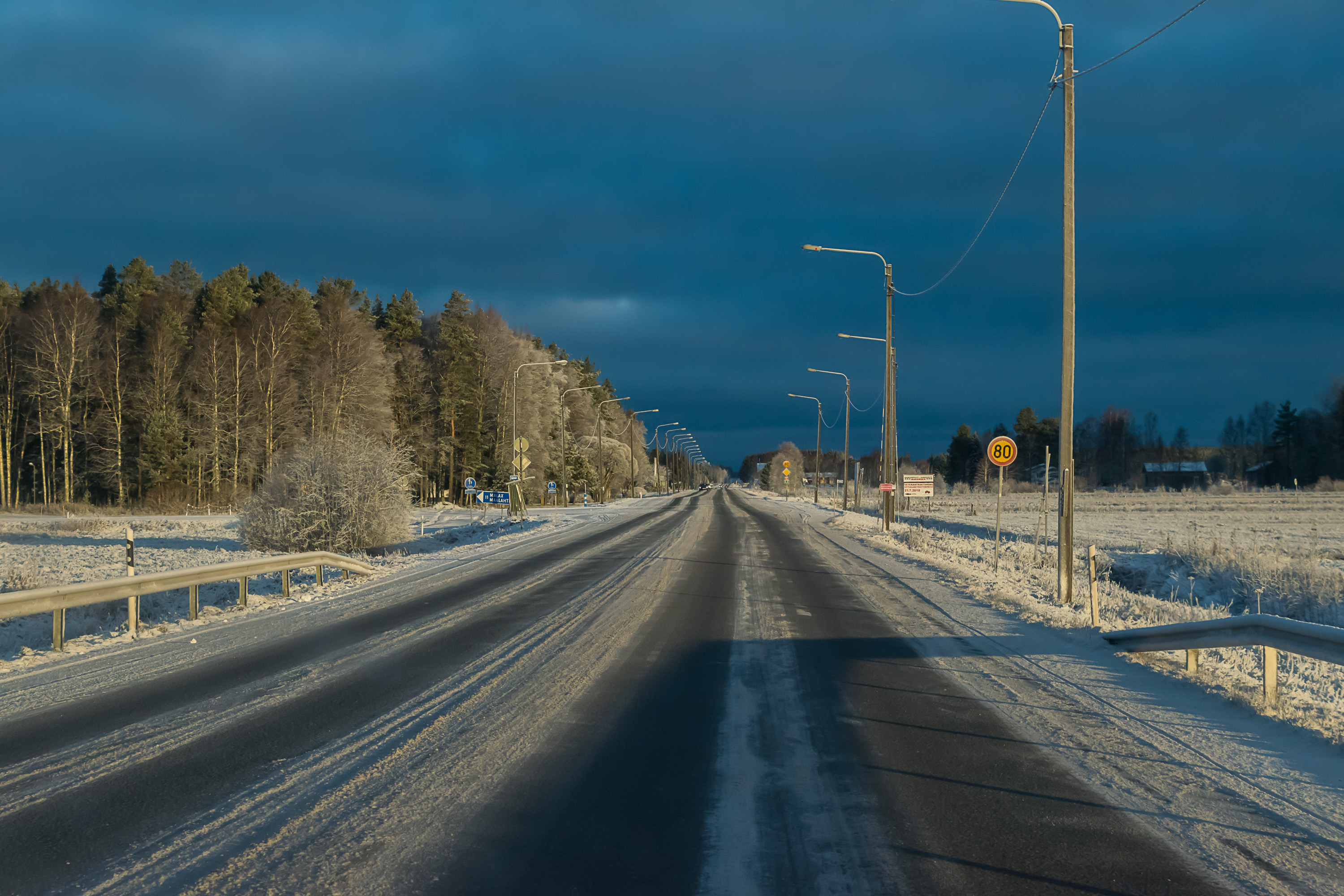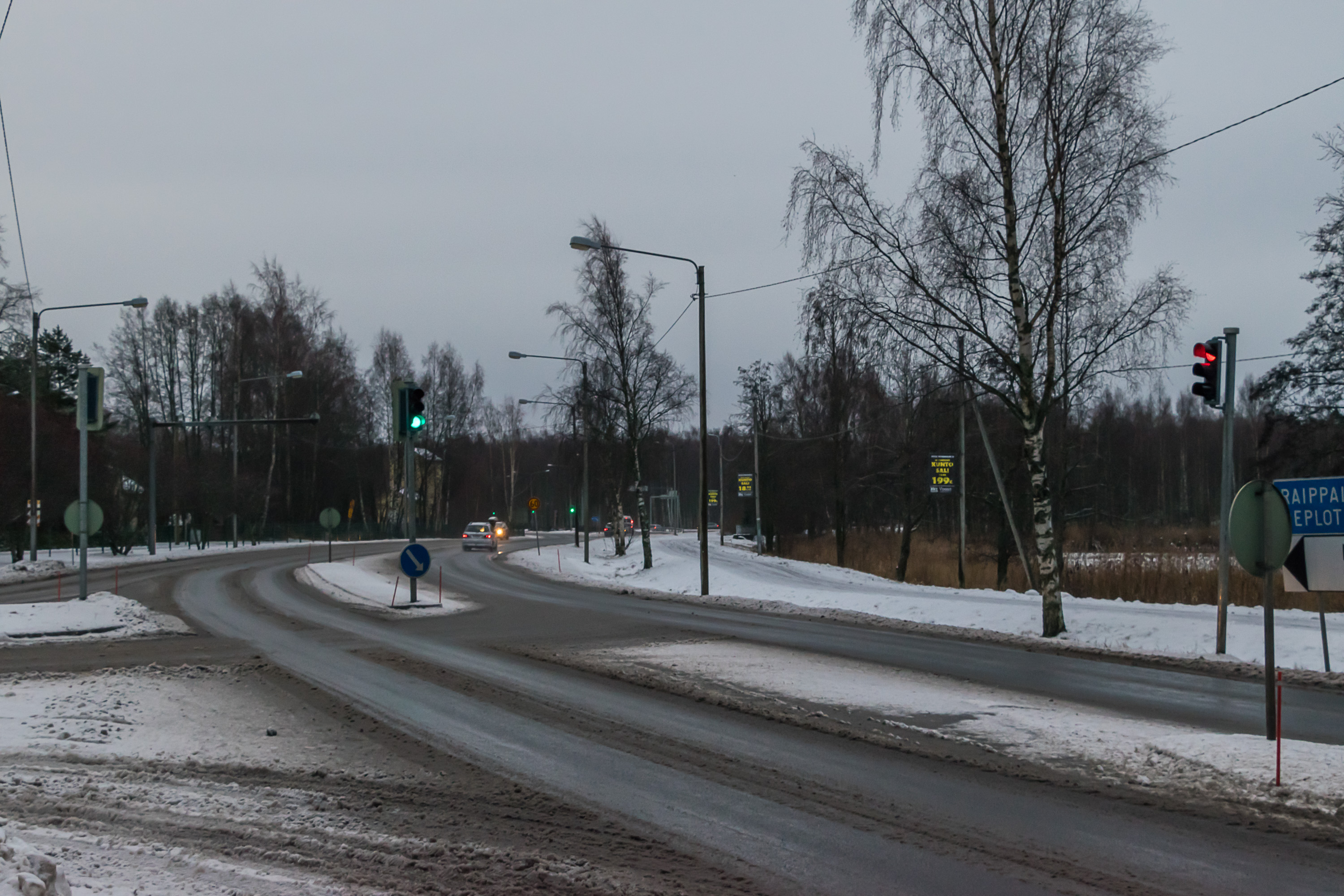 С другой стороны, третьестепенная дорога будет выглядеть как–то так — чистый снежно–ледяной накат, разве что на крутых поворотах и подъемах могут камешками чуть посыпать. Ступаешь по проезжей части — реально скользко, а едешь осторожно — вроде и ничего. Бывает в зависимости от дороги и погоды вообще жестокая ледяная корка, где больше 40–50 км/ч по прямой ехать страшно. Зимой за городом лучше держаться крупных дорог, с одно–двузначными номерами. Карта зимнего обслуживания трасс выложена на сайте Транспортного агентства Финляндии: https://extranet.liikennevirasto.fi/webgis–sovellukset/webgis/template.html?config=hoitoluokka — темно–красный наилучшее (24/7 до чистого асфальта механически и реагентами), светло–голубой наихудшее (снежно–ледяной накат, снег убирается в последнюю очередь).