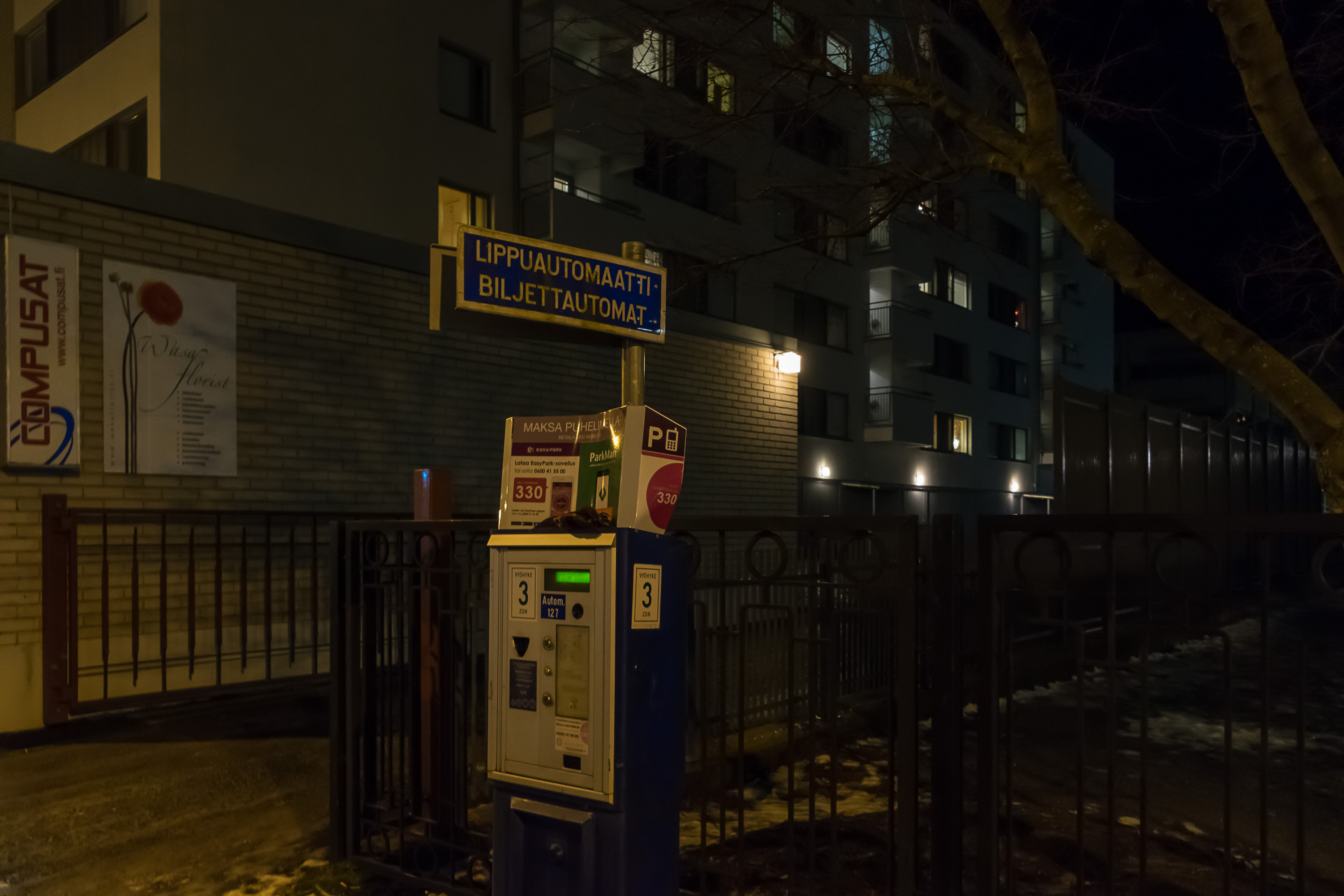 Плавно переходим к теме парковок. Вааса — не очень большой, прямо сказать город, и с парковками тут дела обстоят очень хорошо, но все же, разумеется, все регулируется. В центре парковка платная, но буквально в радиусе всего 2–3 кварталов. Стоит весьма умеренно, 4 зоны, самая дорогая (практически на центральной площади) — 2 евро/час, самая дешевая — 0.5. Но каждый день, конечно, столько платить дороговато. Это скорее удобно, если приехал в центр по делу. Парковки эти платные в 8–17 по будням, 8–14 по субботам, воскресенье бесплатно. Это в принципе стандартное расписание для уличной парковки в Финляндии, только в центре Хельсинки по–моему строже. Не уверен, есть ли резидентские разрешения — может быть, да, но я ничего об этом не слышал. Паркомат, как видите, не самый новый, только монетки принимает, зато есть мобильная оплата через приложение. Но я, честно говоря, платной уличной парковкой ни разу еще не пользовался.