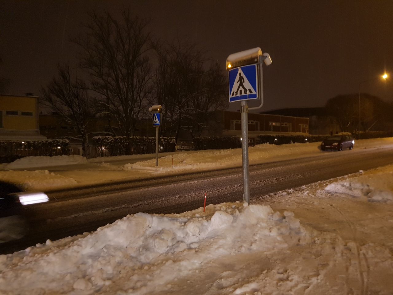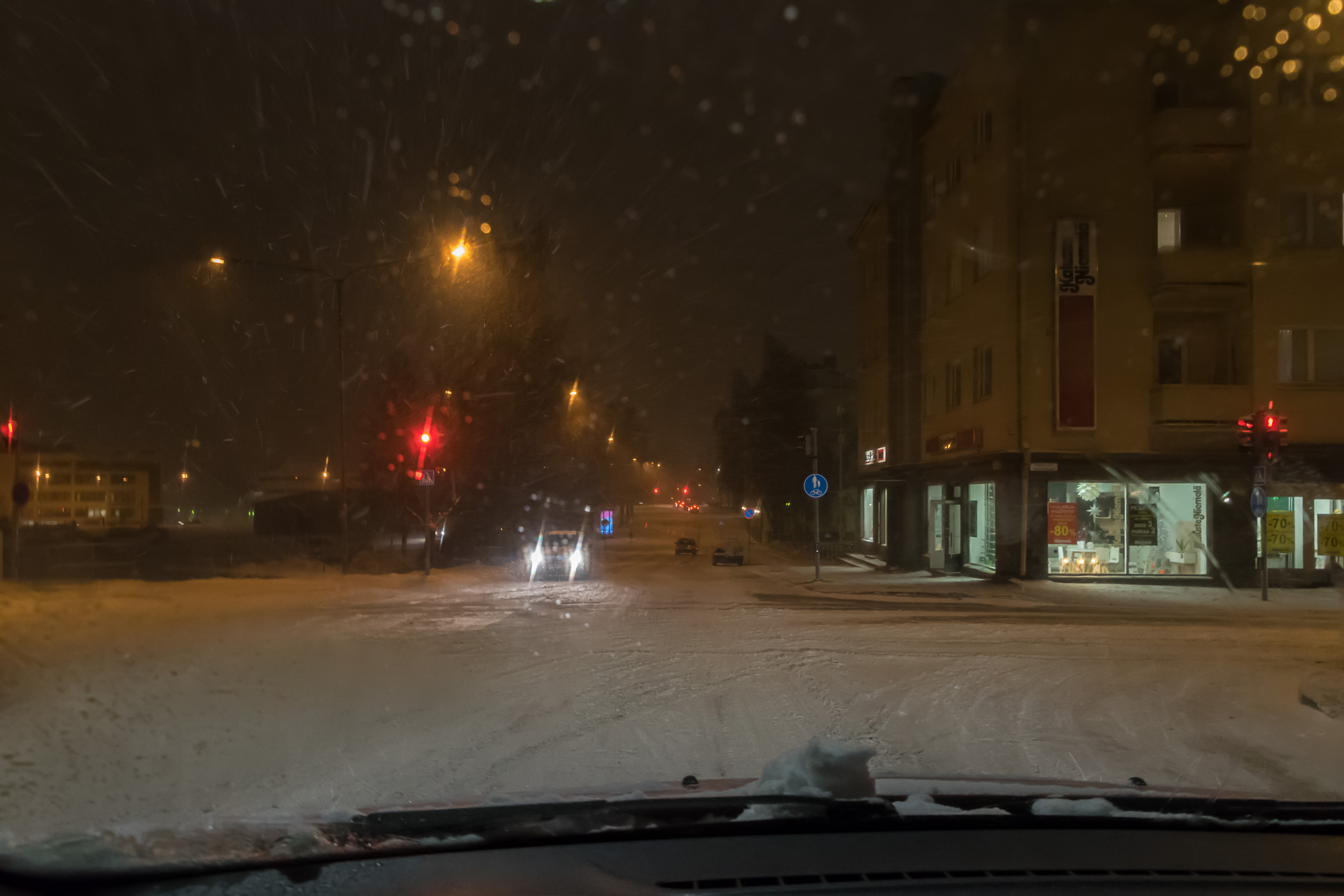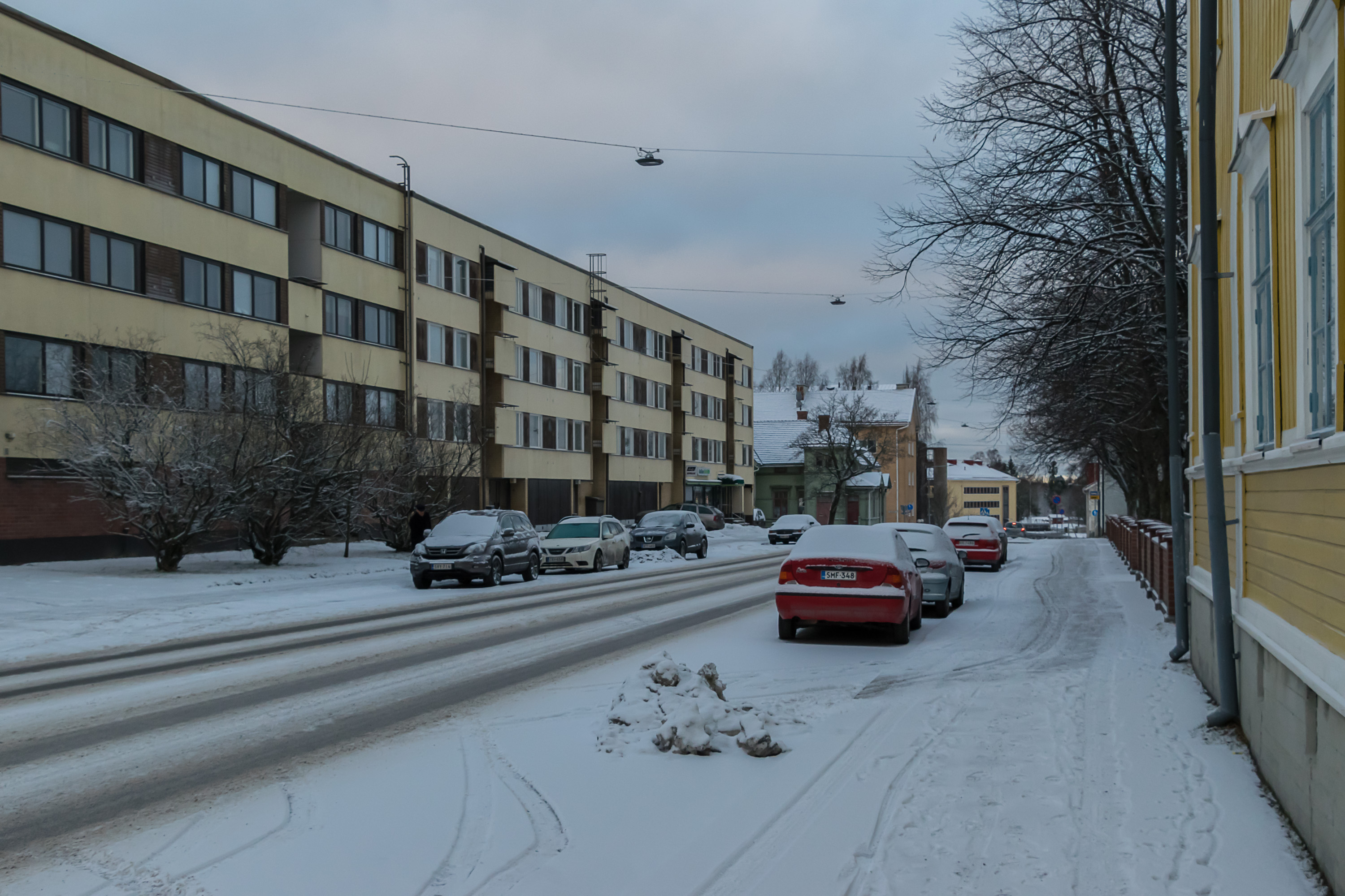 Но более типичная зимняя улица выглядит скорее так. Ограничение на этой улице — 40 км/ч, потому что жилой район. Так во всем центре и большинстве жилых районов, редко 50 км/ч, в совсем тихих местах — 30 км/ч. Разумеется, больше чем на несколько км/ч никто не превышает. Полицейские в засадах не сидят и камер в городе буквально пара штук на выездах, но если все же поймают, мало не покажется. Да и не превысишь тут особо, почти все улицы 1+1 полоса, и обгонять негде.