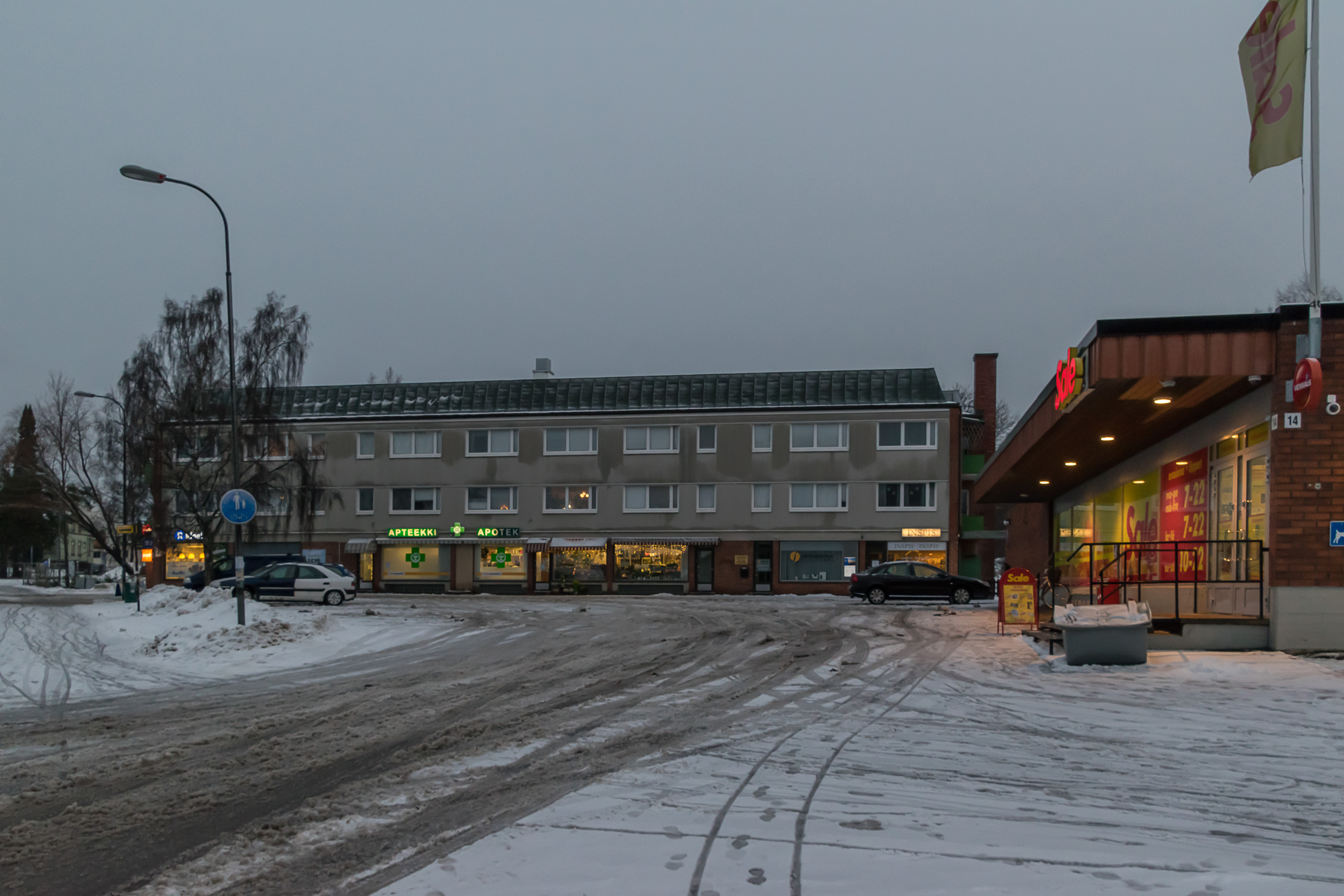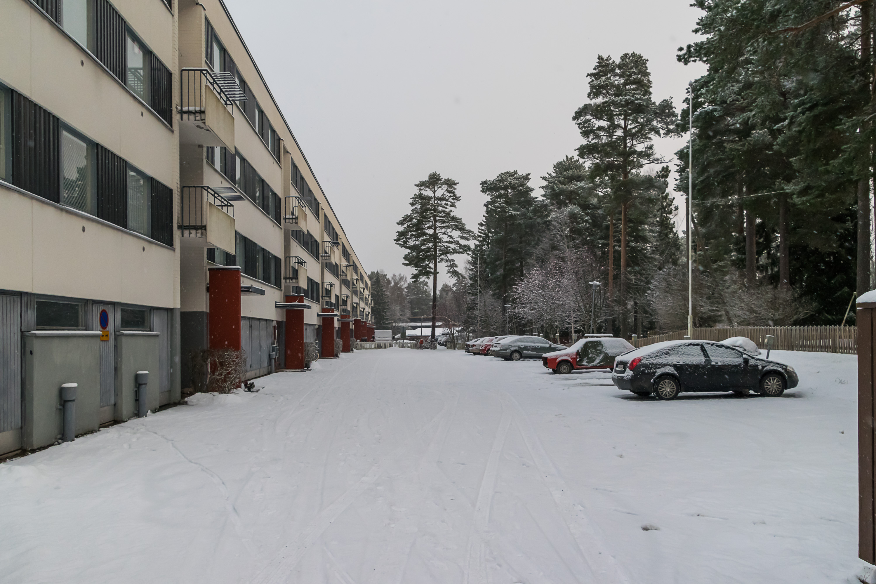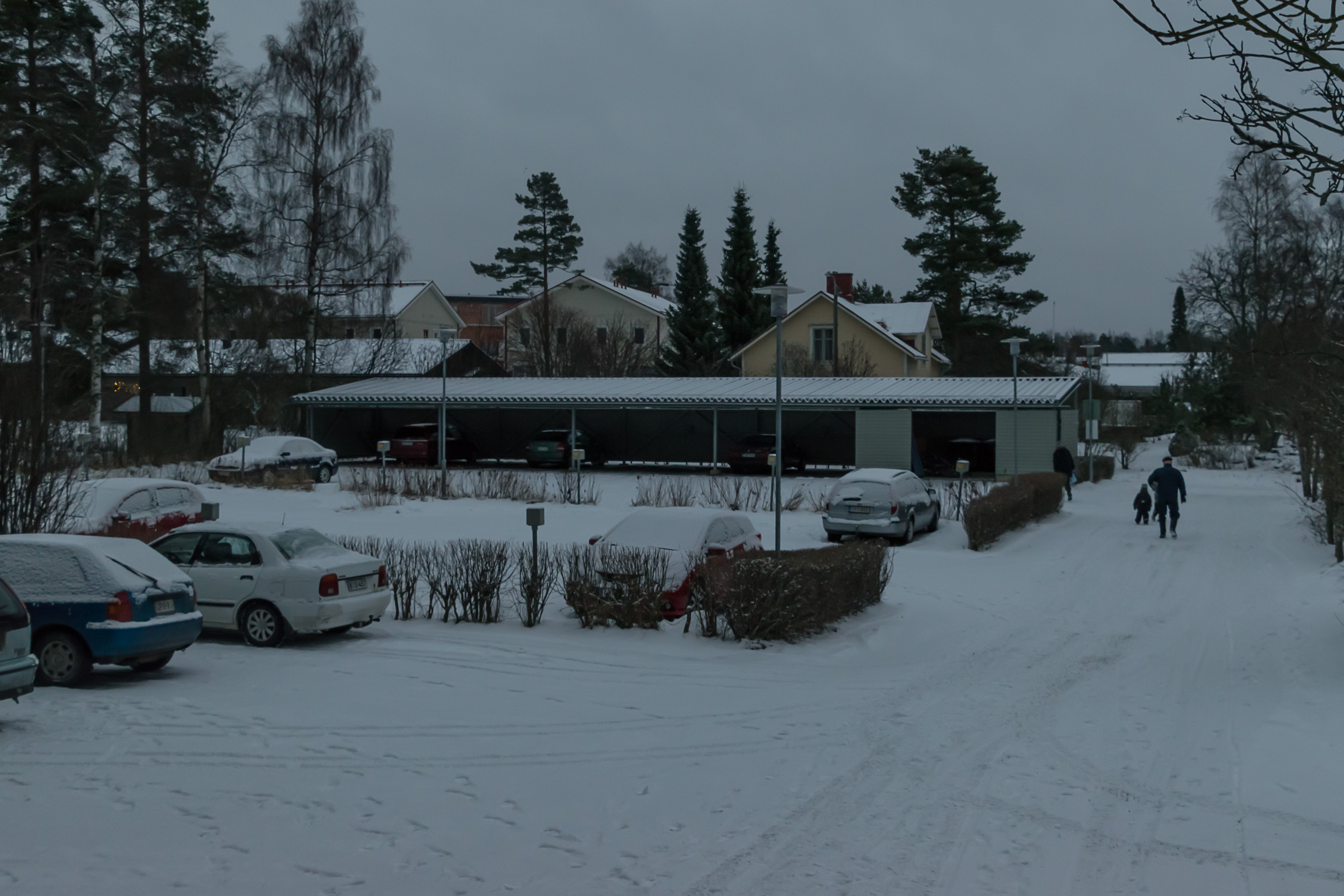 Разумеется, при этом можно подъехать к самым дверям подъезда для погрузки–разгрузки или высадки пассажиров. Если не наглеть и не бросать там машину на несколько часов, никто слова не скажет. Еще, кстати, на фотографии видно, что снег убирать (по крайней мере в моем дворе) не очень–то торопятся. По выходным, по–моему, только проезды до парковок чистят, а сами парковки, и проезды дальше до подъездов — фиг. Это же Финляндия, тут чтобы кто–то в выходной выходил регулярно работать, ему разоришься платить.