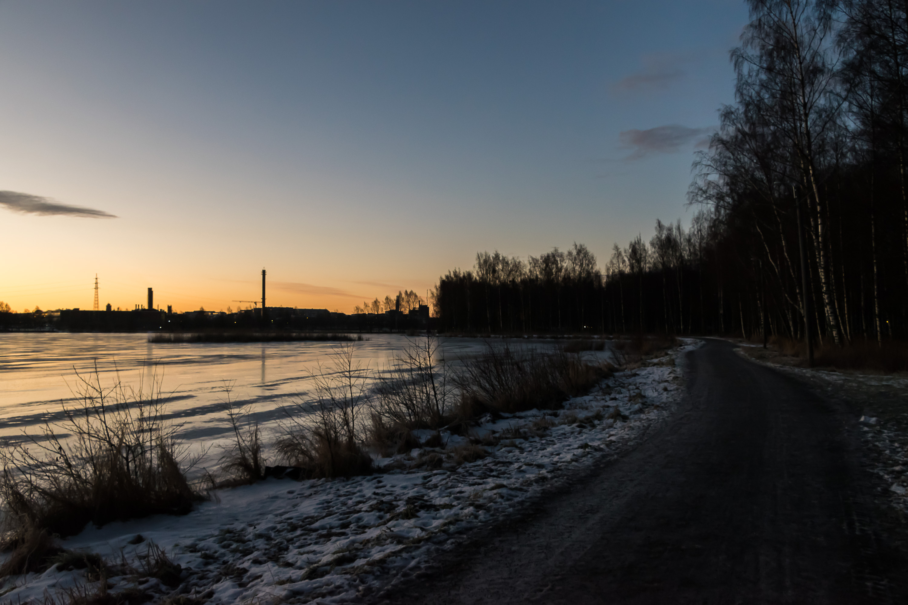 Что мне всегда очень нравилось в Финляндии — можно ходить (или ездить на велосипеде) не только вдоль улиц и дорог, есть и очень много чисто велопешеходных дорожек, зачастую в весьма живописных местах, например, тут, на берегу маленького морского залива. В лесополосе на этом берегу вроде никто не живет, а вот на противоположном, у Старого кладбища, живет заяц или зайцы — часто следы на снегу видно, и самого зайца видел как–то раз. Я часто хожу тут пешком на работу — идти 3 км (35 мин быстрым шагом) — приятно и для здоровья полезно.