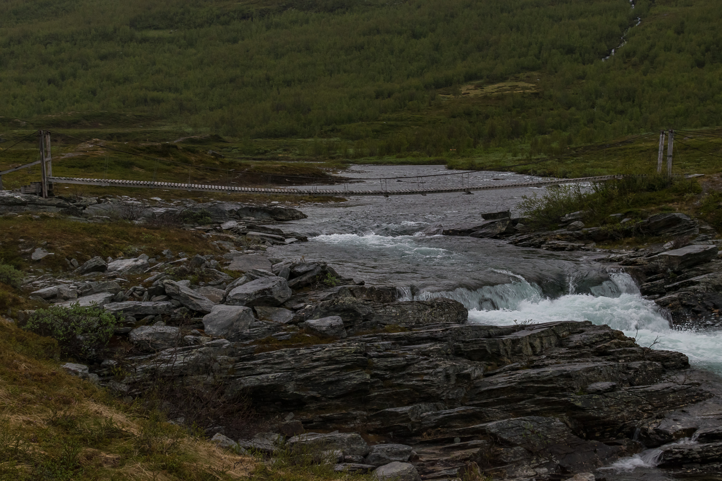 24. Где-то в "калфьелле" должен был быть другой мост, которым я должен был вернуться обратно на северный берег на официальную тропу. Несколько раз я думал, что он вот-вот покажется за очередной излучиной, но его все не было и не было. Я немного опасался, будет ли мост вообще на месте — нельзя быть на 100% уверенным, что небольшой пешеходный мостик в горах далеко от цивилизации не смыт, например, весенними водами. Сезон все-таки был еще слегка ранний.