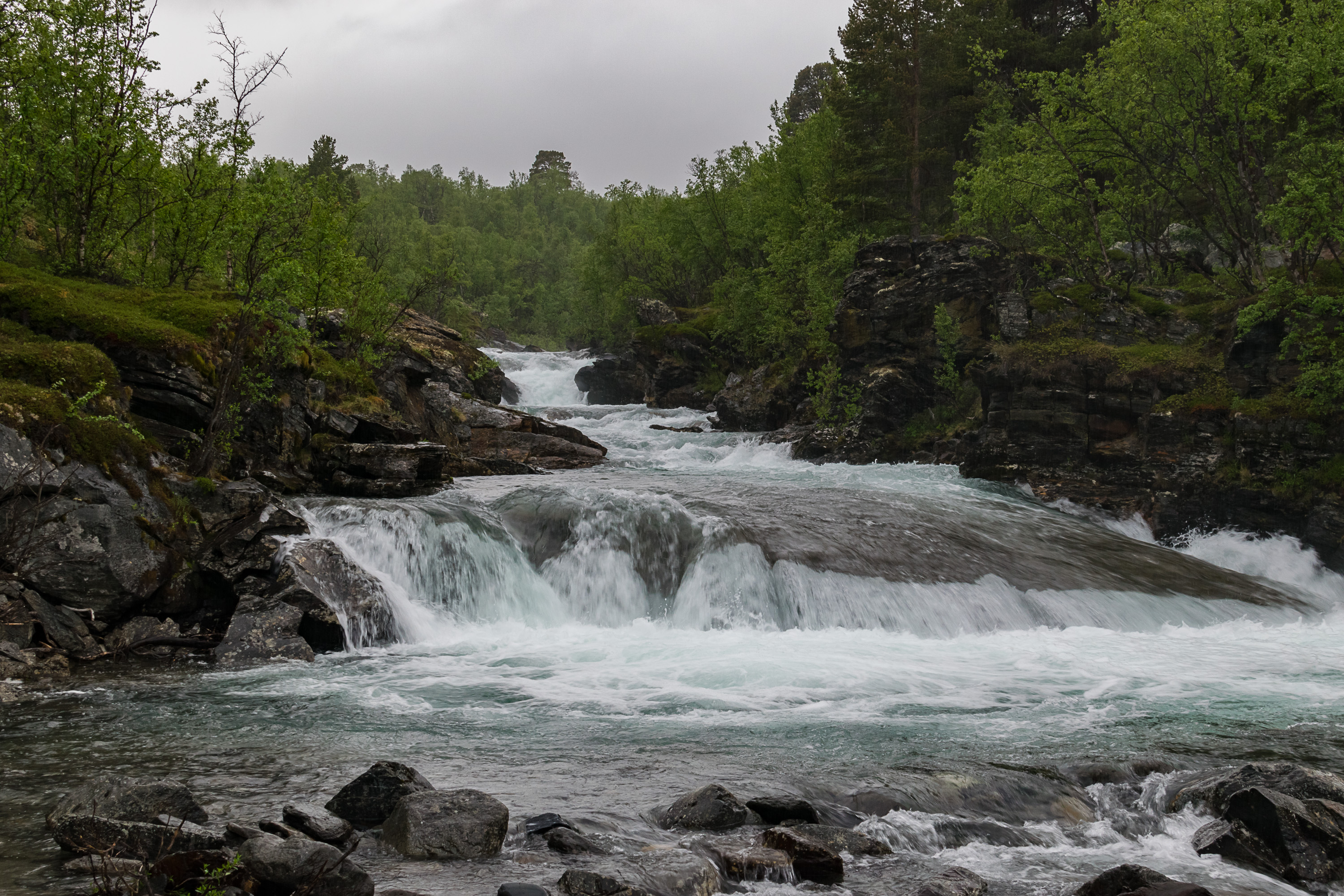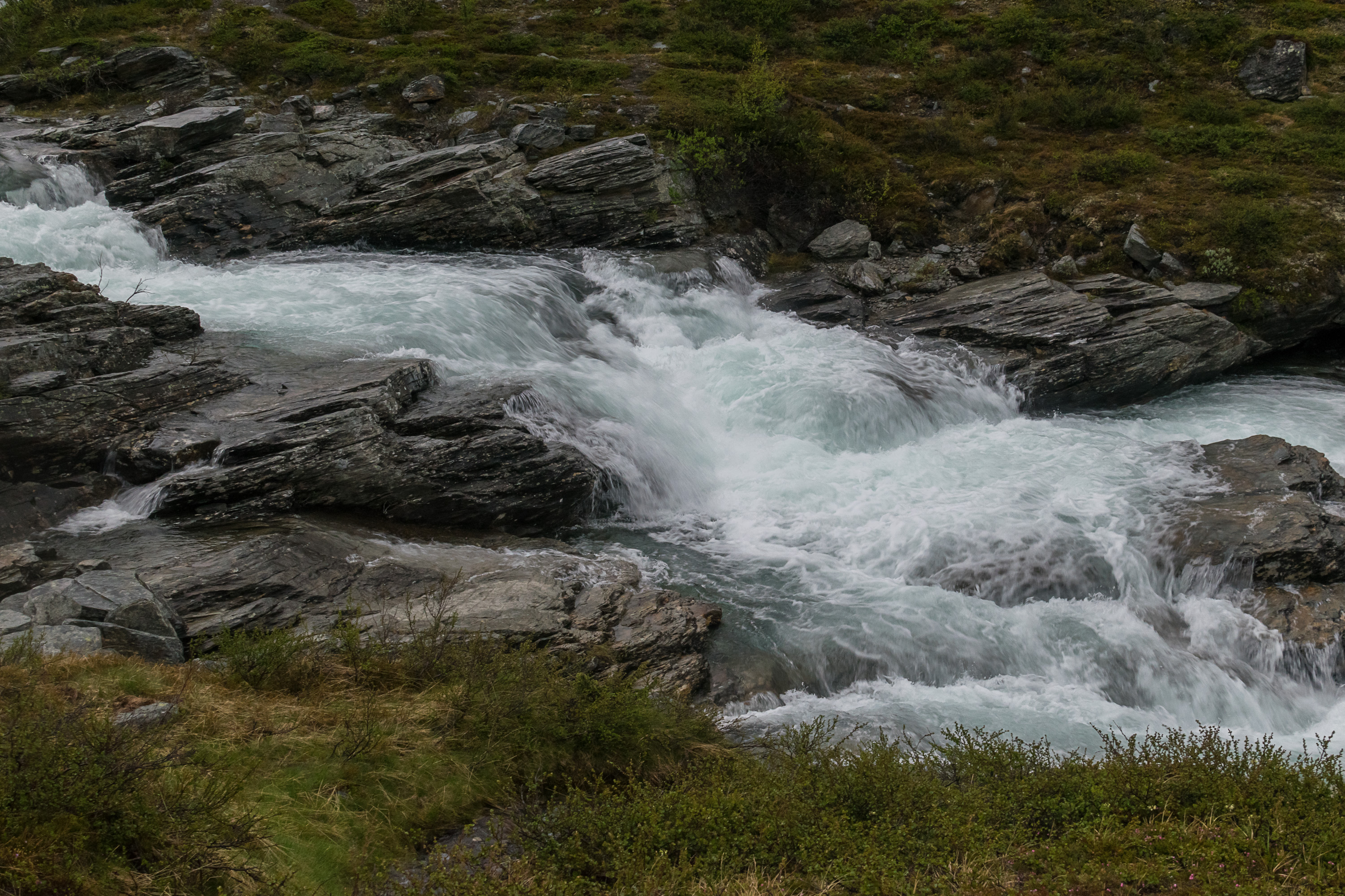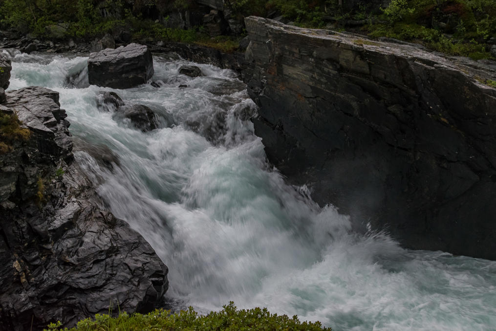 12. И совсем рядом был, как и обещалось, водопад Корсафаллет (Kårsafallet). Не очень большой, но крайне живописный. Как зачастую и характерно для горных ледниковых рек, вода в Горсайокке прекрасного голубого оттенка.